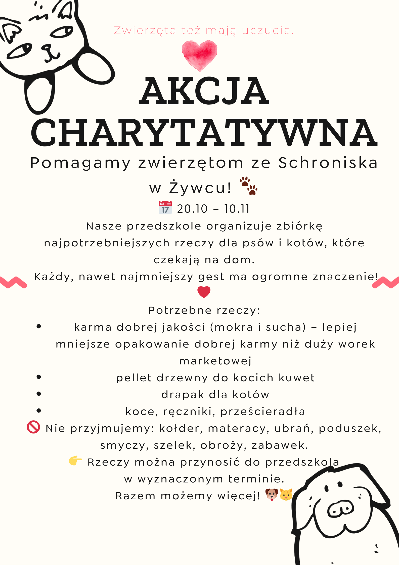 Serdecznie zapraszamy do udziału w naszej akcji charytatywnej, której celem jest zbiórka darów dla Schroniska w Żywcu. Zachęcamy do włączenia się w pomoc – nawet drobny gest może wiele znaczyć! Szczegółowe informacje dotyczące zbiórki znajdują się na plakacie umieszczonym w przedszkolu. Razem możemy więcej – pomóżmy tym, którzy sami o pomoc nie poproszą!