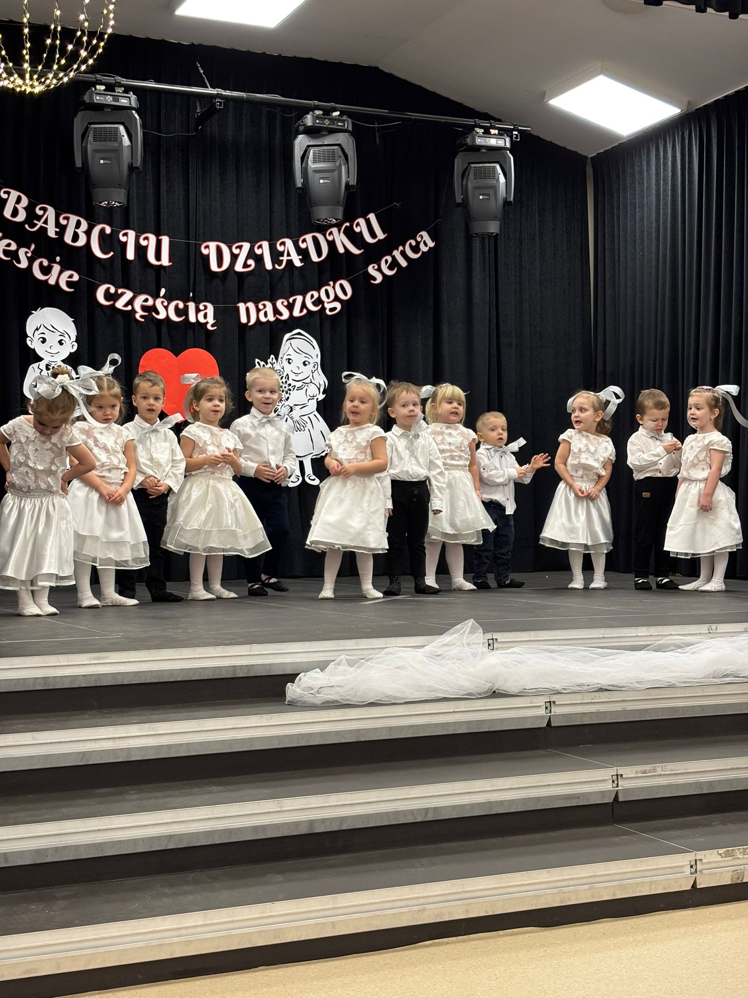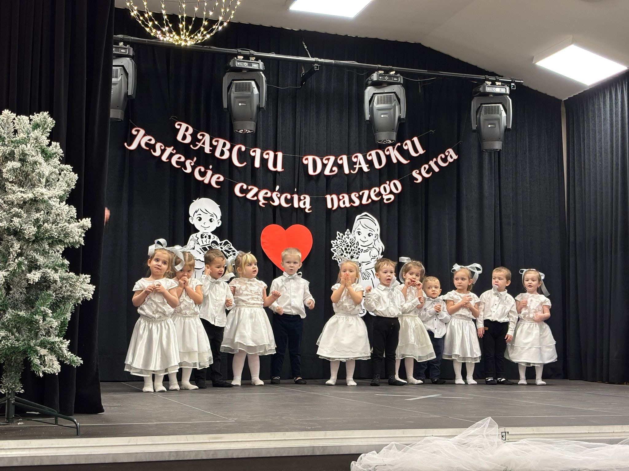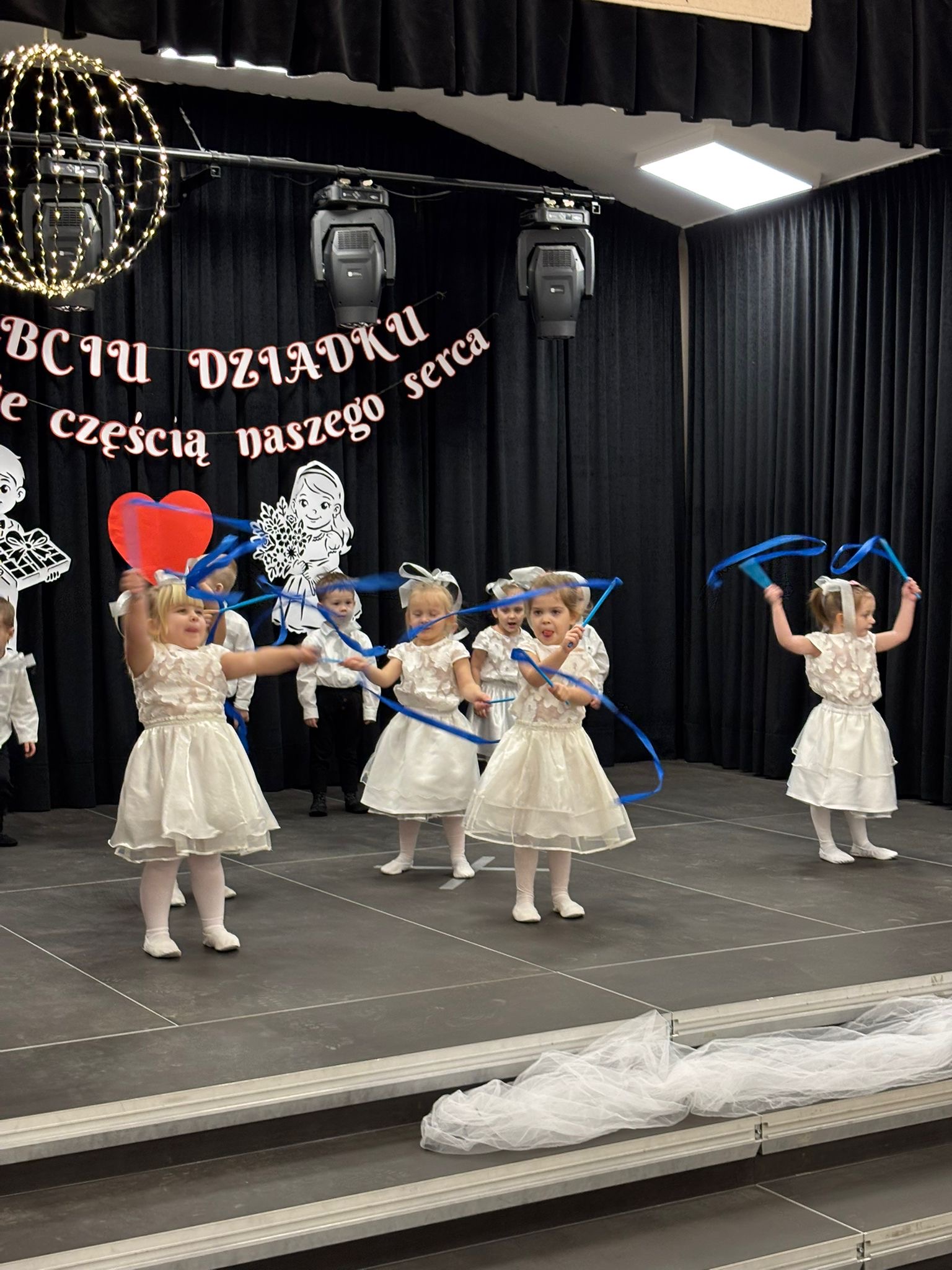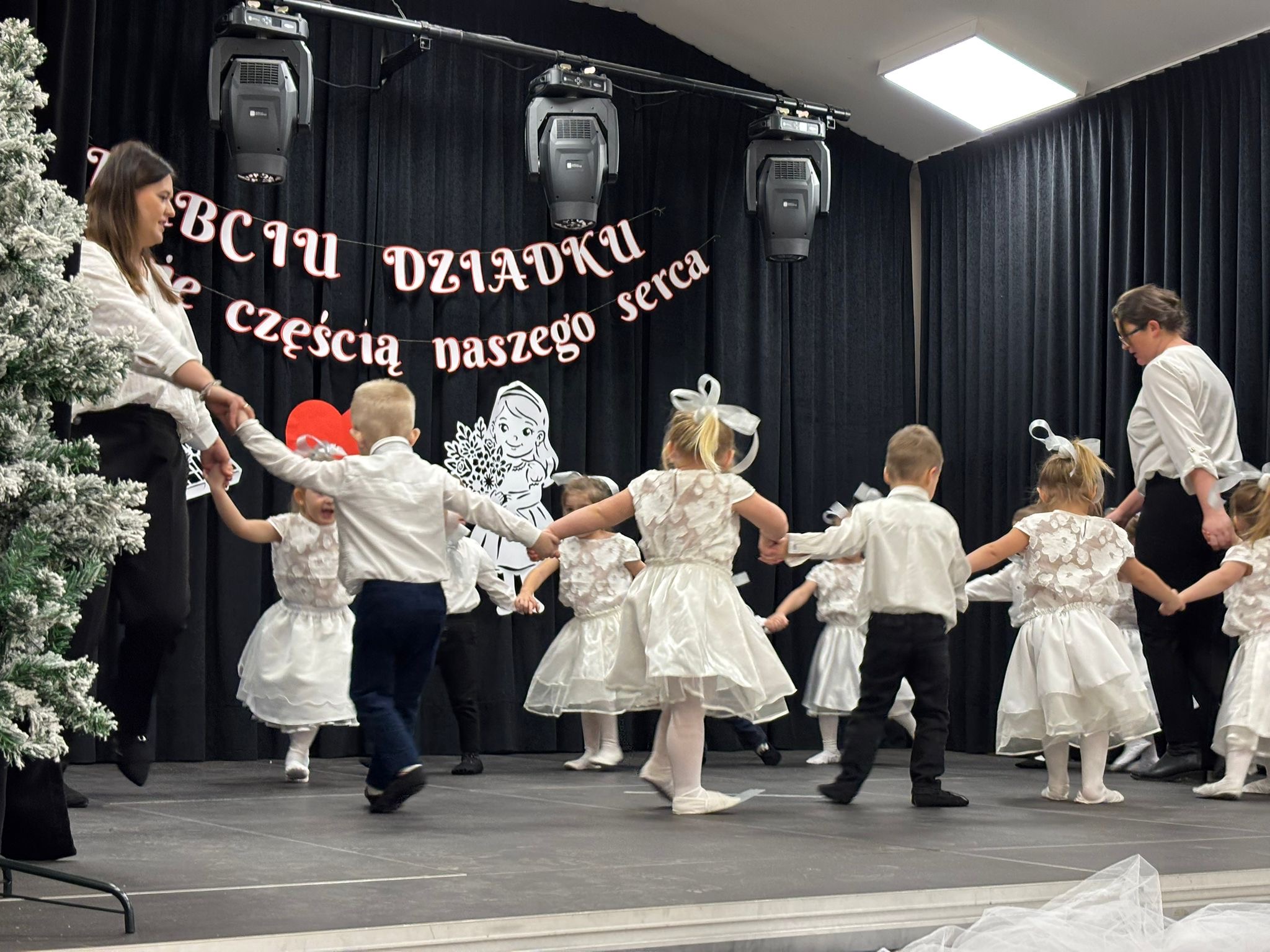 Maluszki z wielkim przejęciem śpiewały piosenki dedykowane Babciom i Dziadkom, prezentując swoje umiejętności artystyczne. Dzieci zaprezentowały również zimowy taniec ze wstążkami oraz radosne tańce z pokazywaniem, nawiązujące do zimowej aury i chęci „rozgrzania” serc swoich ukochanych gości. Na zakończenie występów każda wnuczka i każdy wnuczek mieli okazję zatańczyć wspólnie z Babcią i Dziadkiem, co było pięknym i bardzo wzruszającym zwieńczeniem tych wyjątkowych dni.