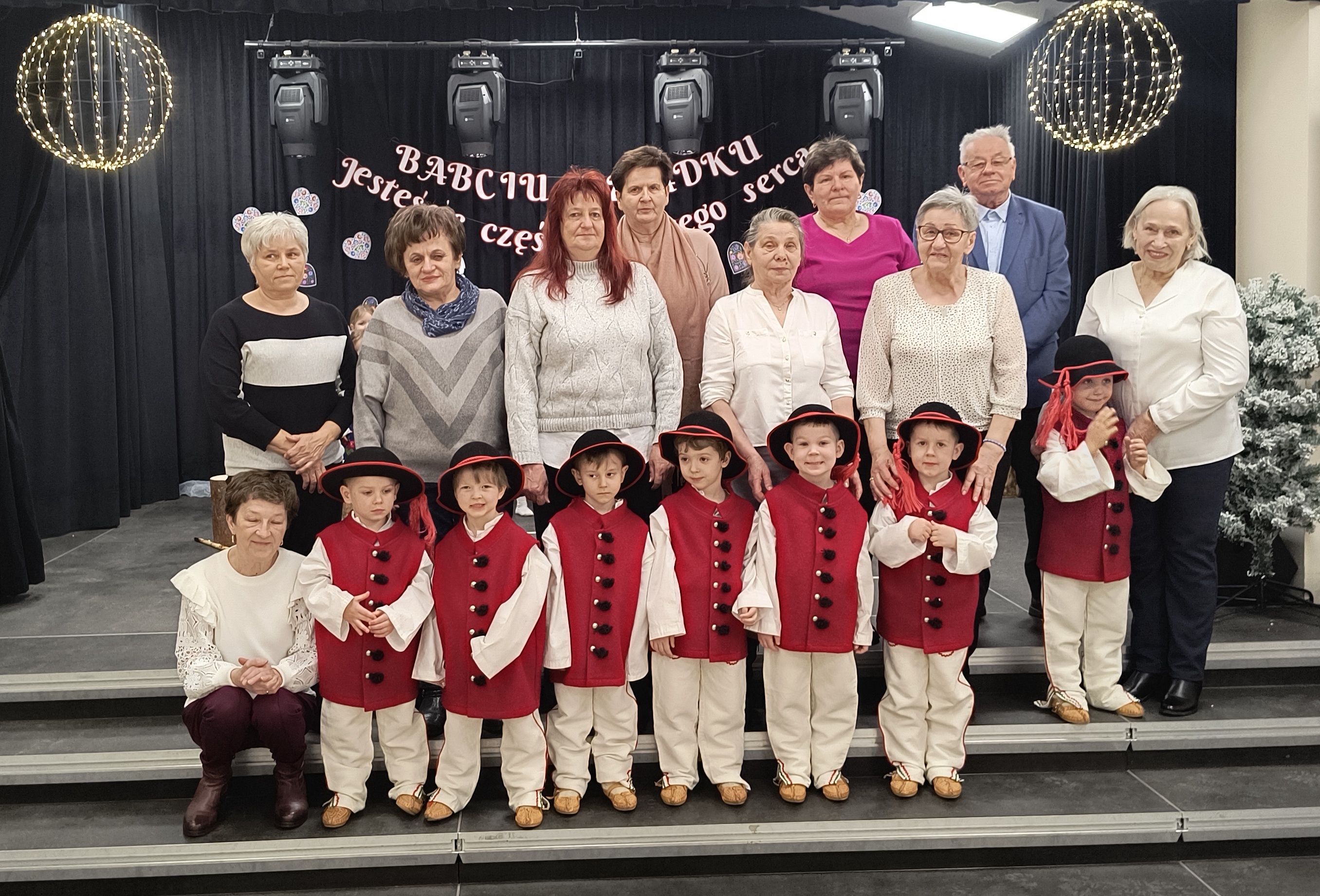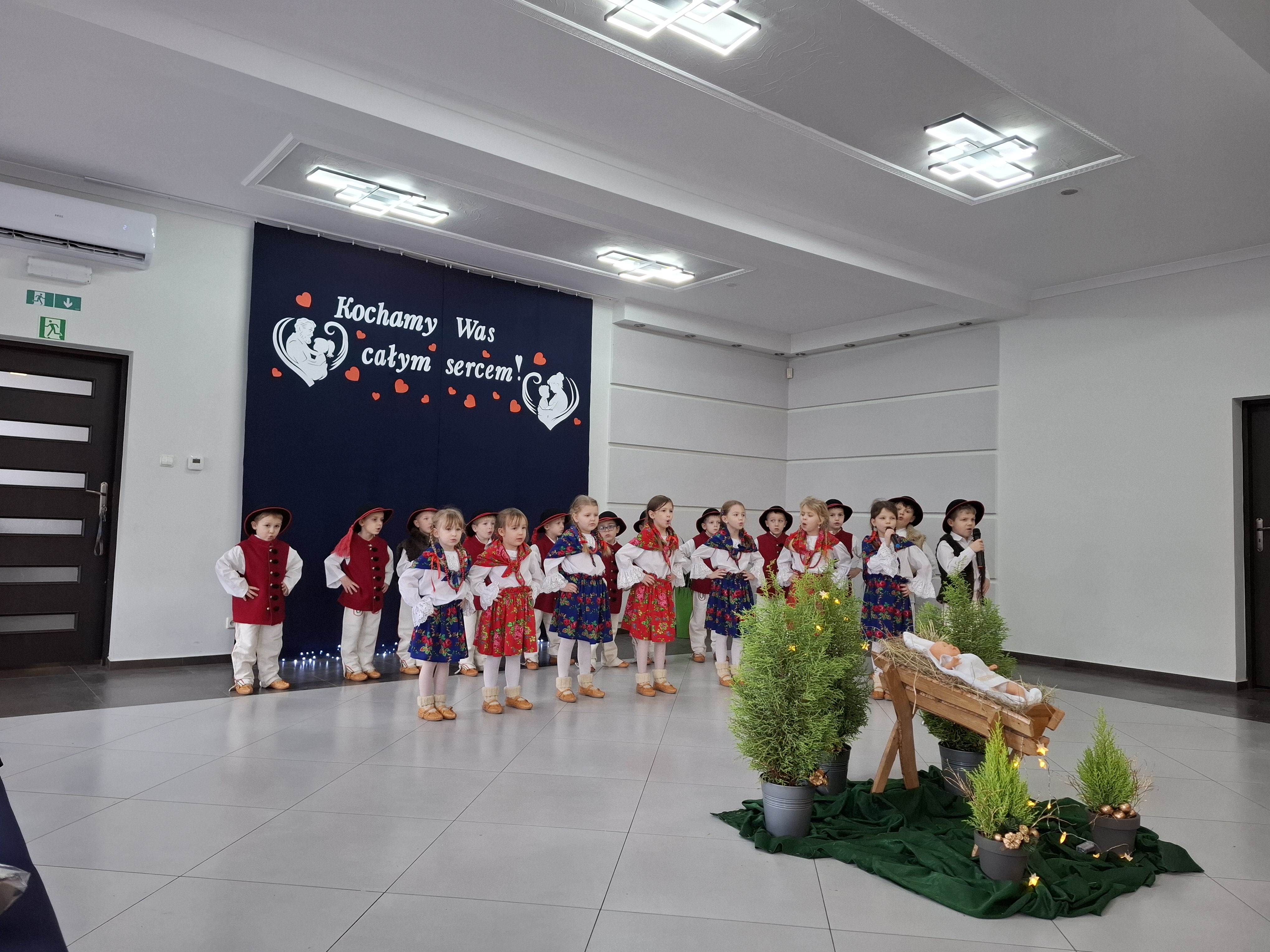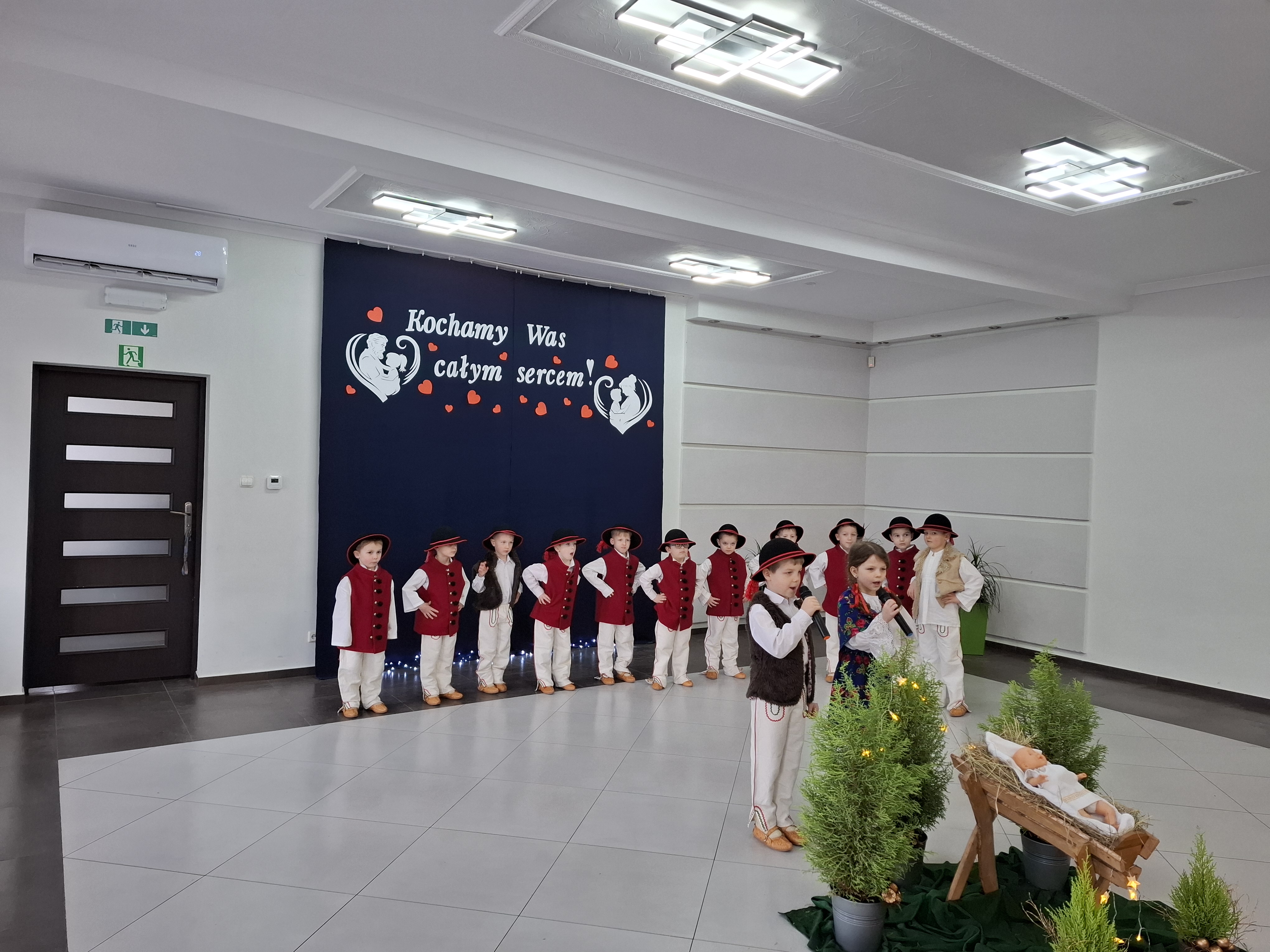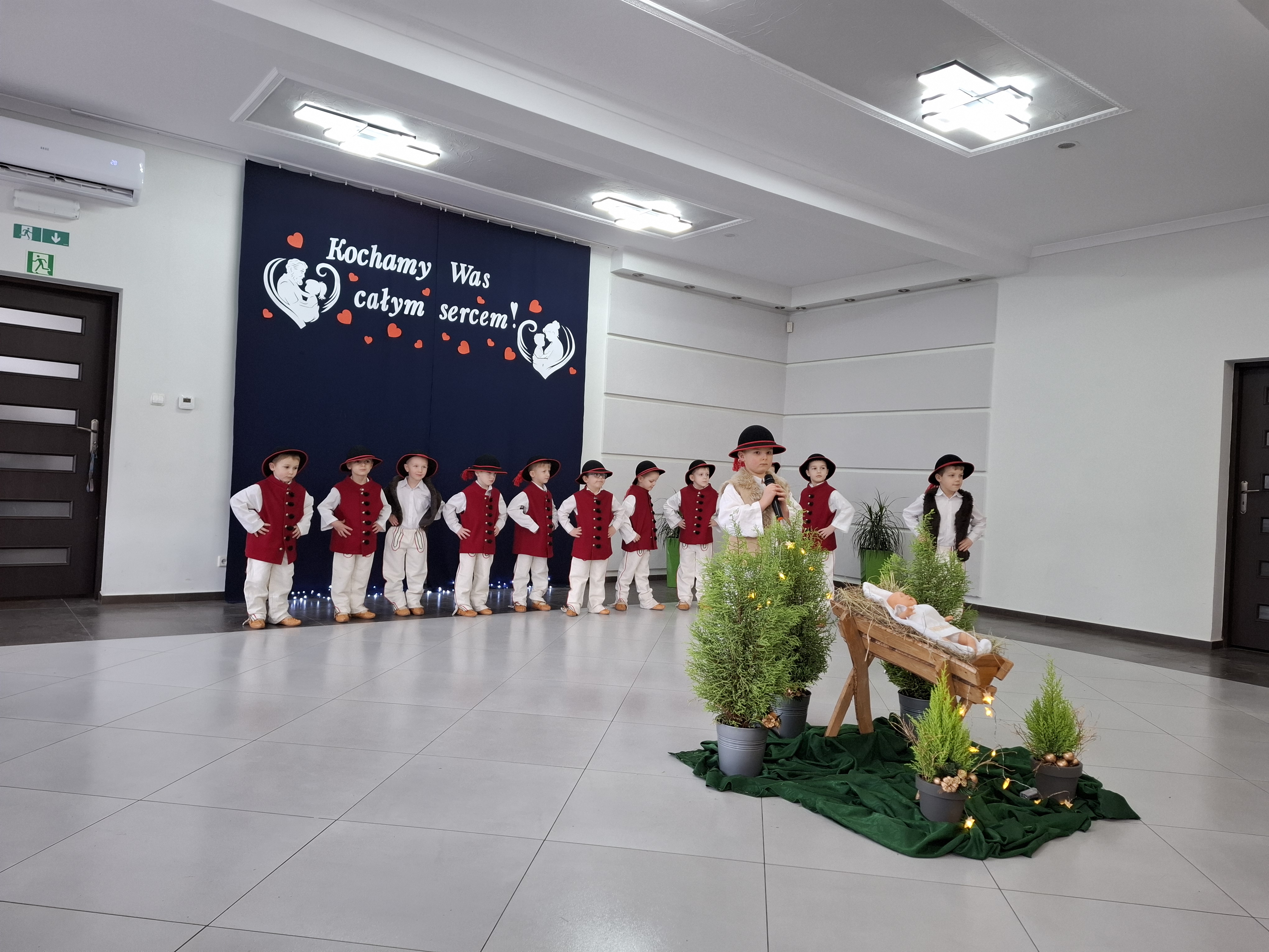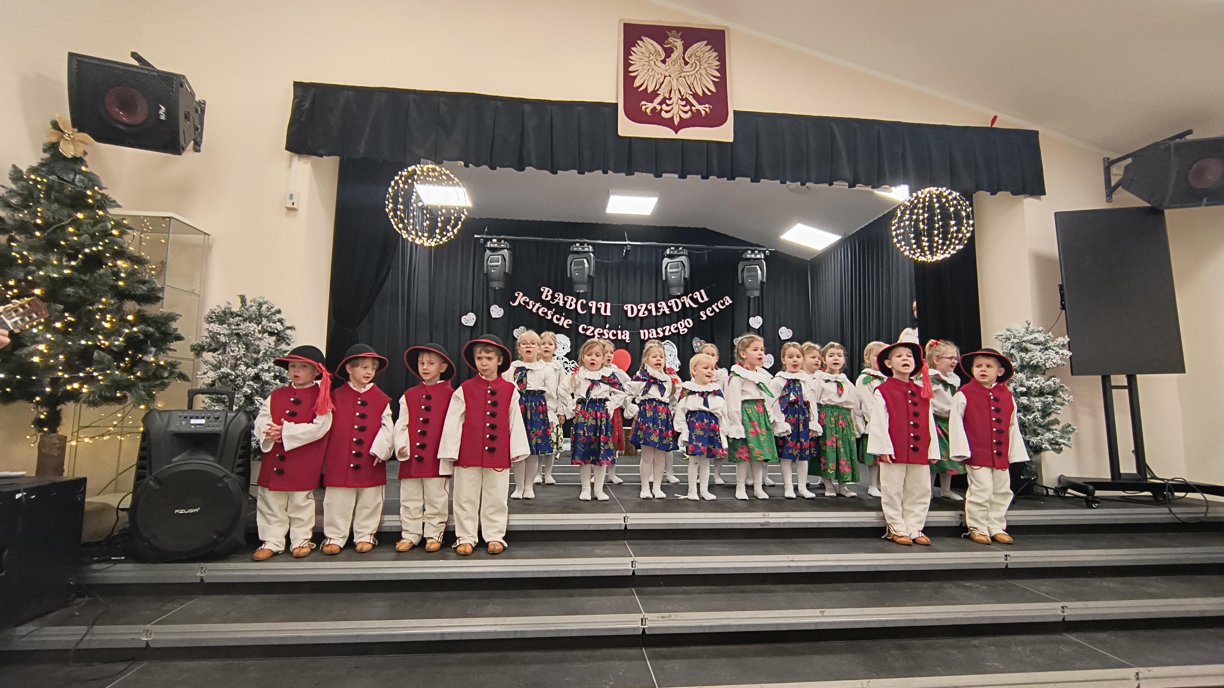 6-latki zaprosiły swoich gości na wyjątkowe „Kolędowanie dla Babci i Dziadka”. Dzieci złożyły życzenia po góralsku, zaprezentowały taniec góralski do pastorałki „Od serca do ucha” oraz wspólnie śpiewały pastorałki: „Nadzieja Zbawienia”, „Skrzypi wóz”, „Boże Dziecię” oraz Wojtuś T. grał ,,Jezusowi Narodzonemu”. Nie zabrakło również takich utworów jak „W lesie rosła sosna” oraz radosnego „100 lat” zagranego na heligonce, co spotkało się z ogromnym entuzjazmem publiczności.