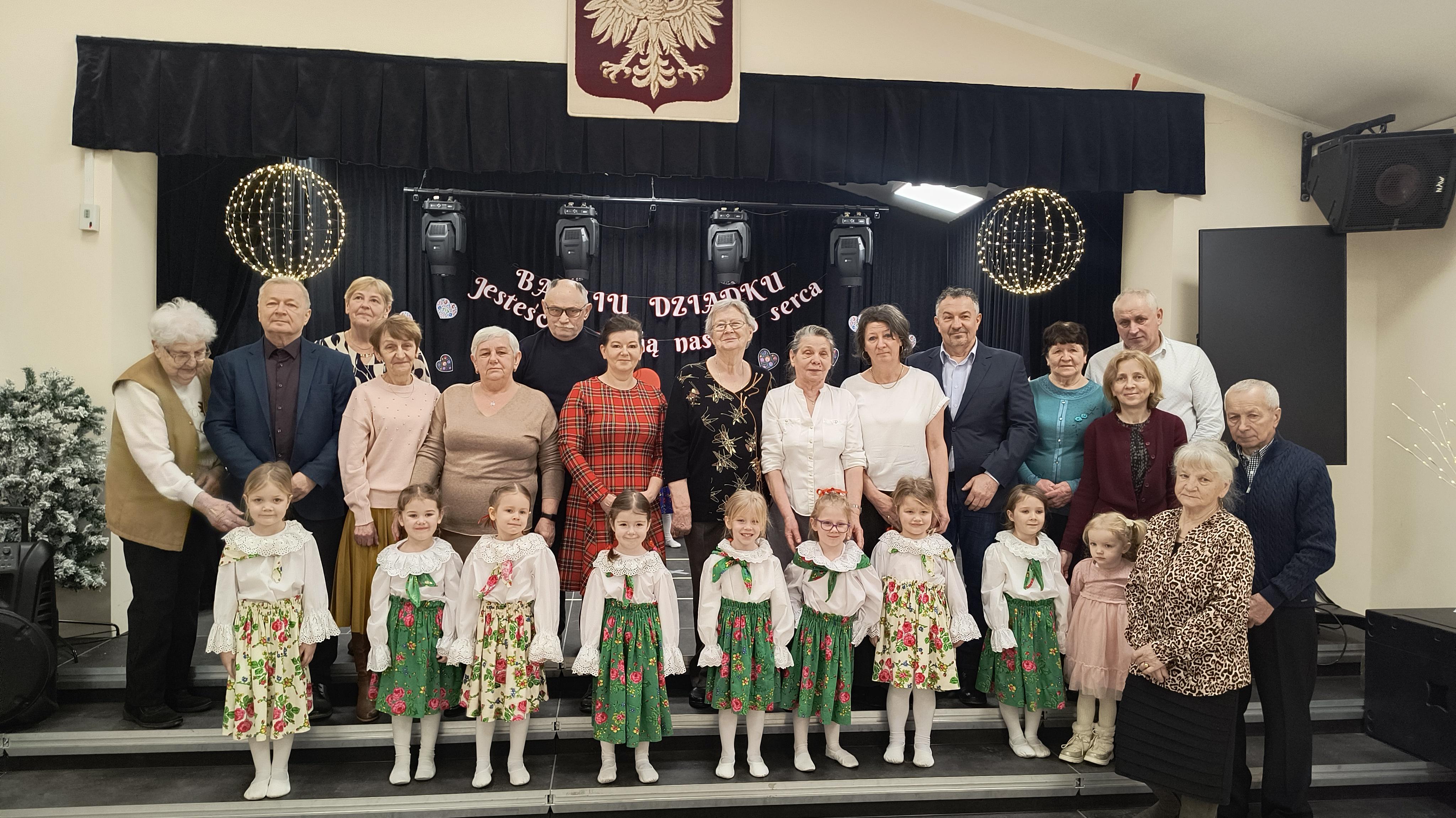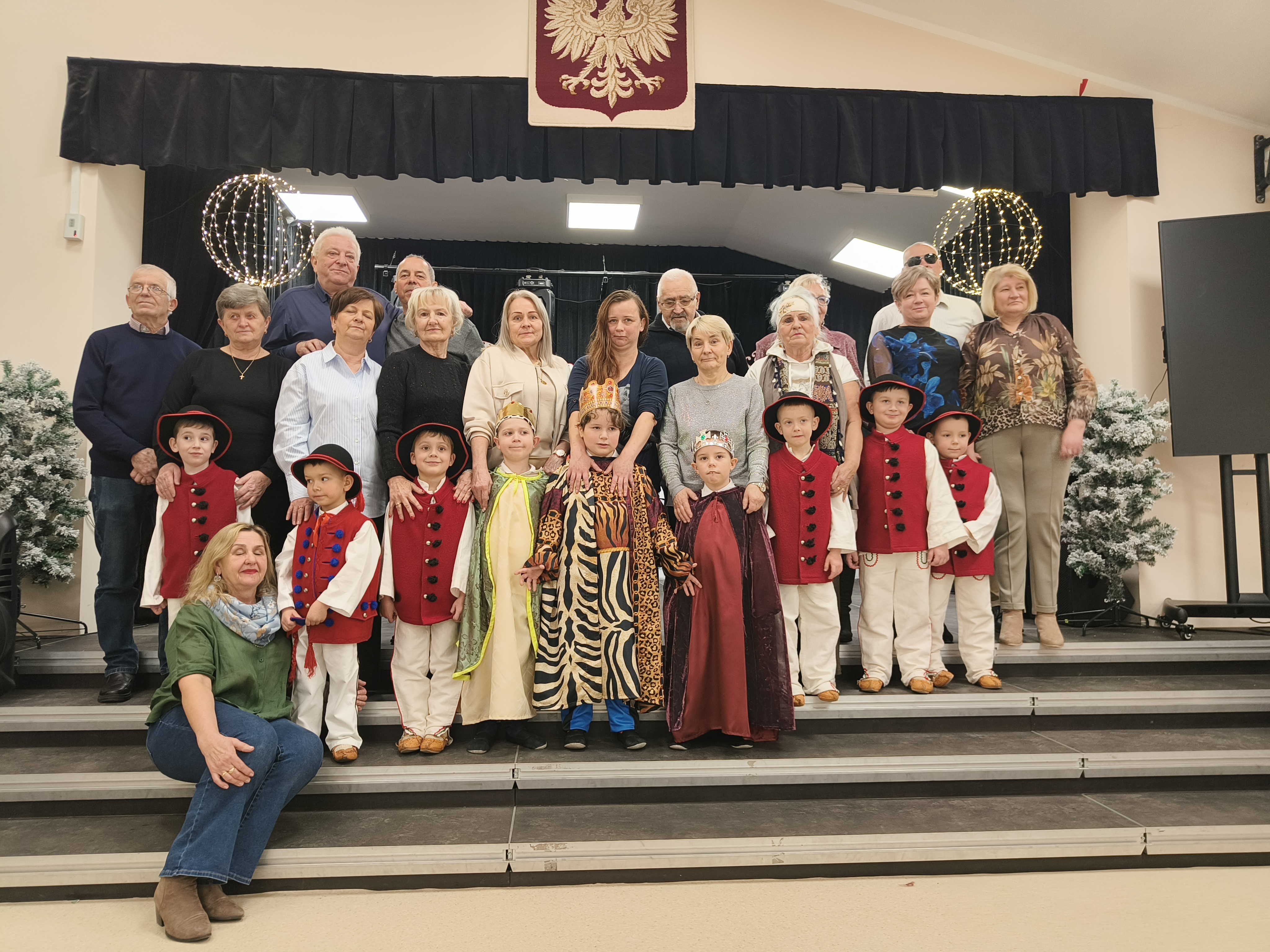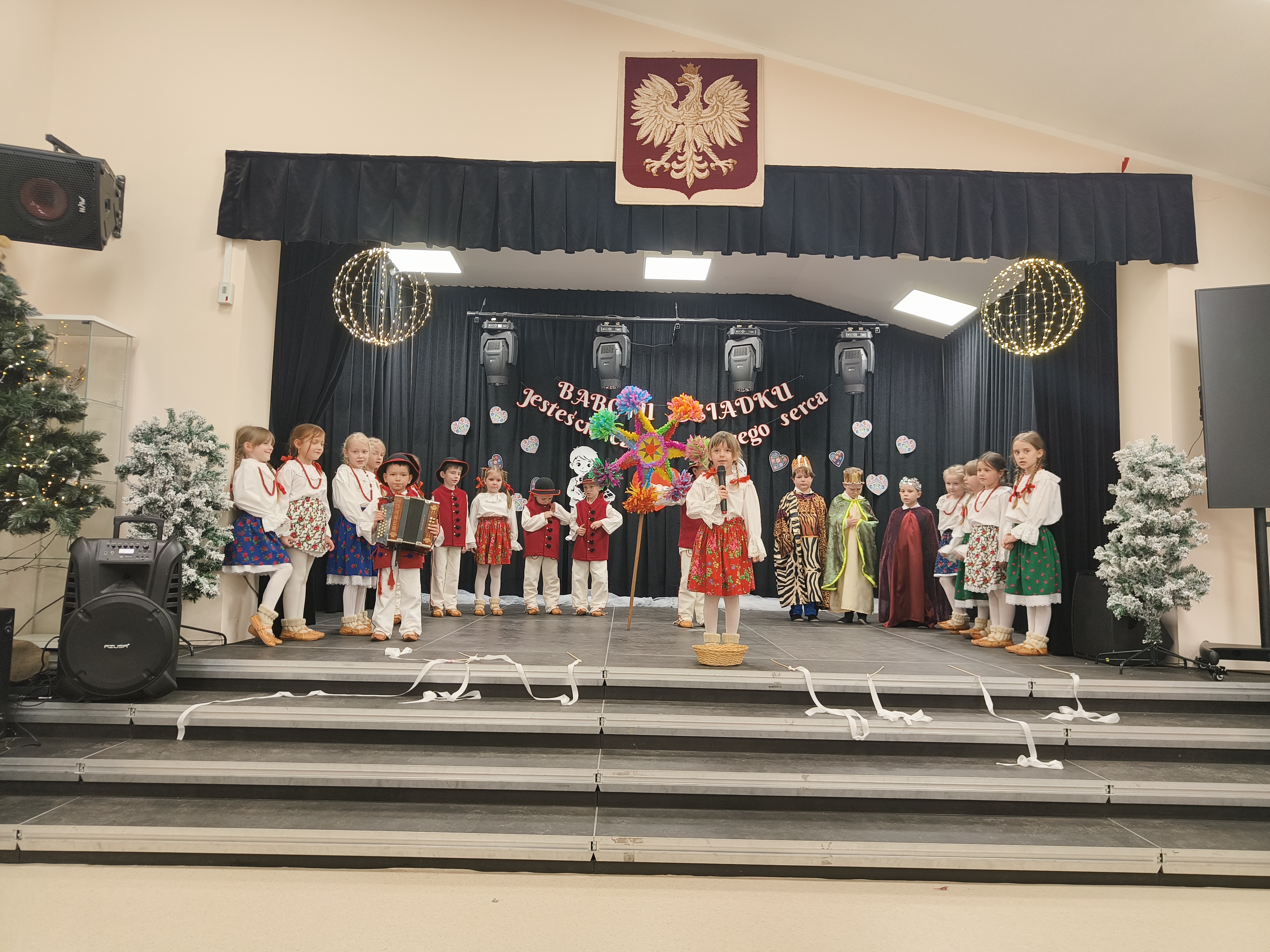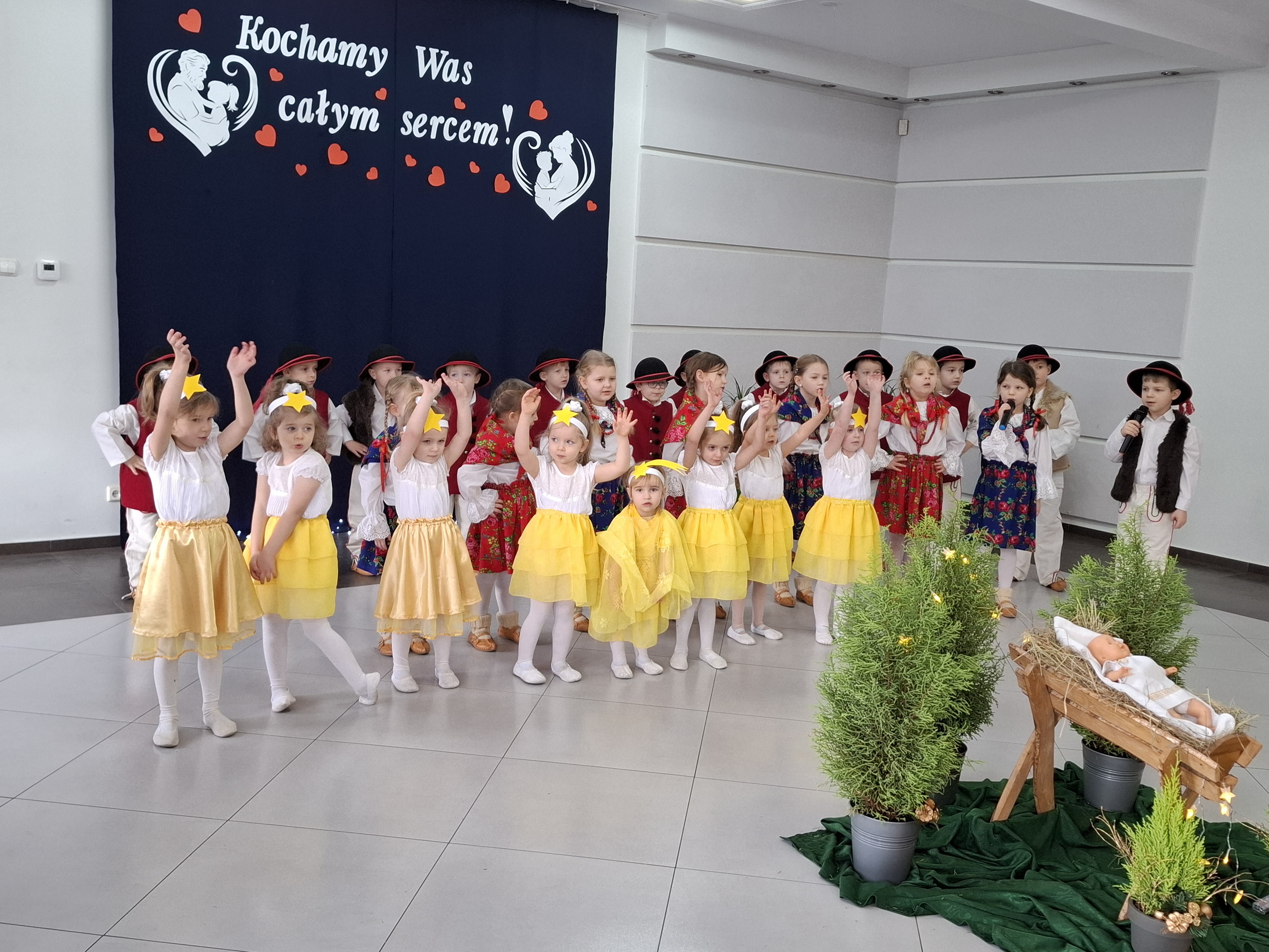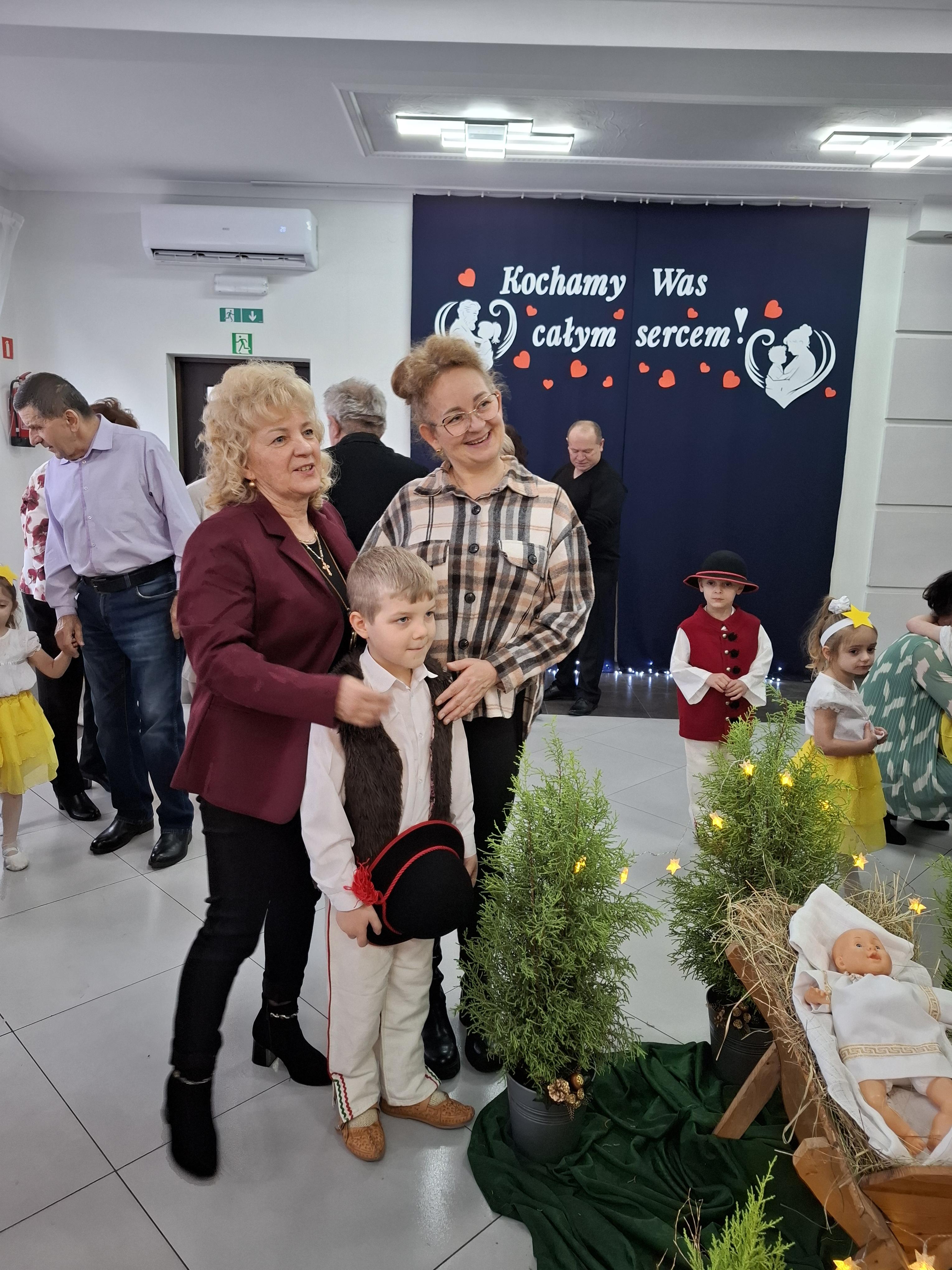 6-latki zaprosiły swoich gości na wyjątkowe „Kolędowanie dla Babci i Dziadka”. Dzieci złożyły życzenia po góralsku, zaprezentowały taniec góralski do pastorałki „Od serca do ucha” oraz wspólnie śpiewały pastorałki: „Nadzieja Zbawienia”, „Skrzypi wóz”, „Boże Dziecię” oraz Wojtuś T. grał ,,Jezusowi Narodzonemu”. Nie zabrakło również takich utworów jak „W lesie rosła sosna” oraz radosnego „100 lat” zagranego na heligonce, co spotkało się z ogromnym entuzjazmem publiczności.
