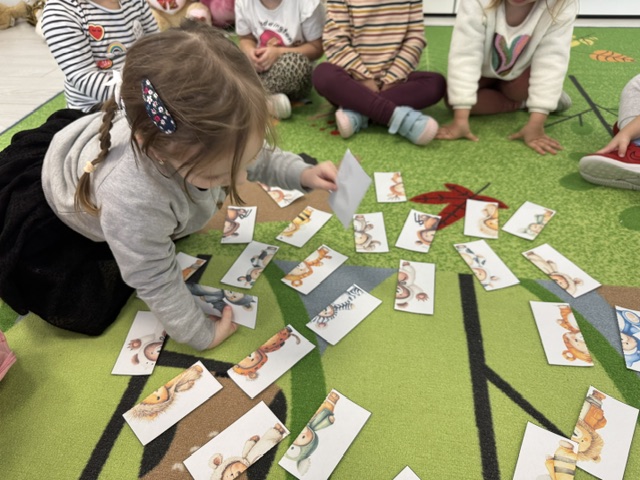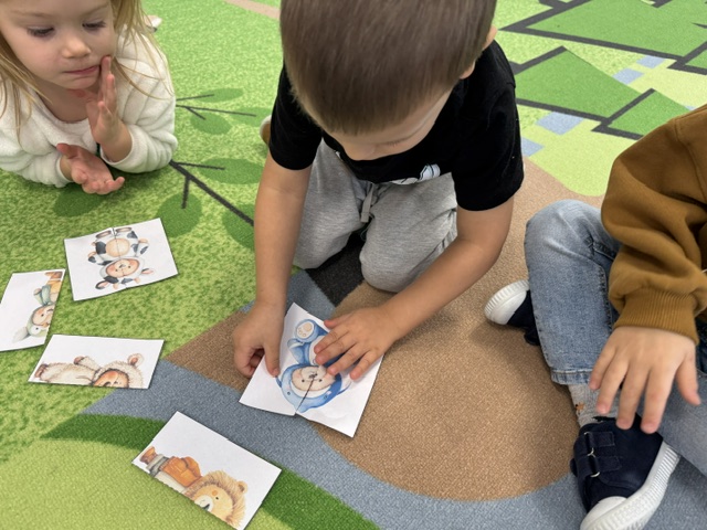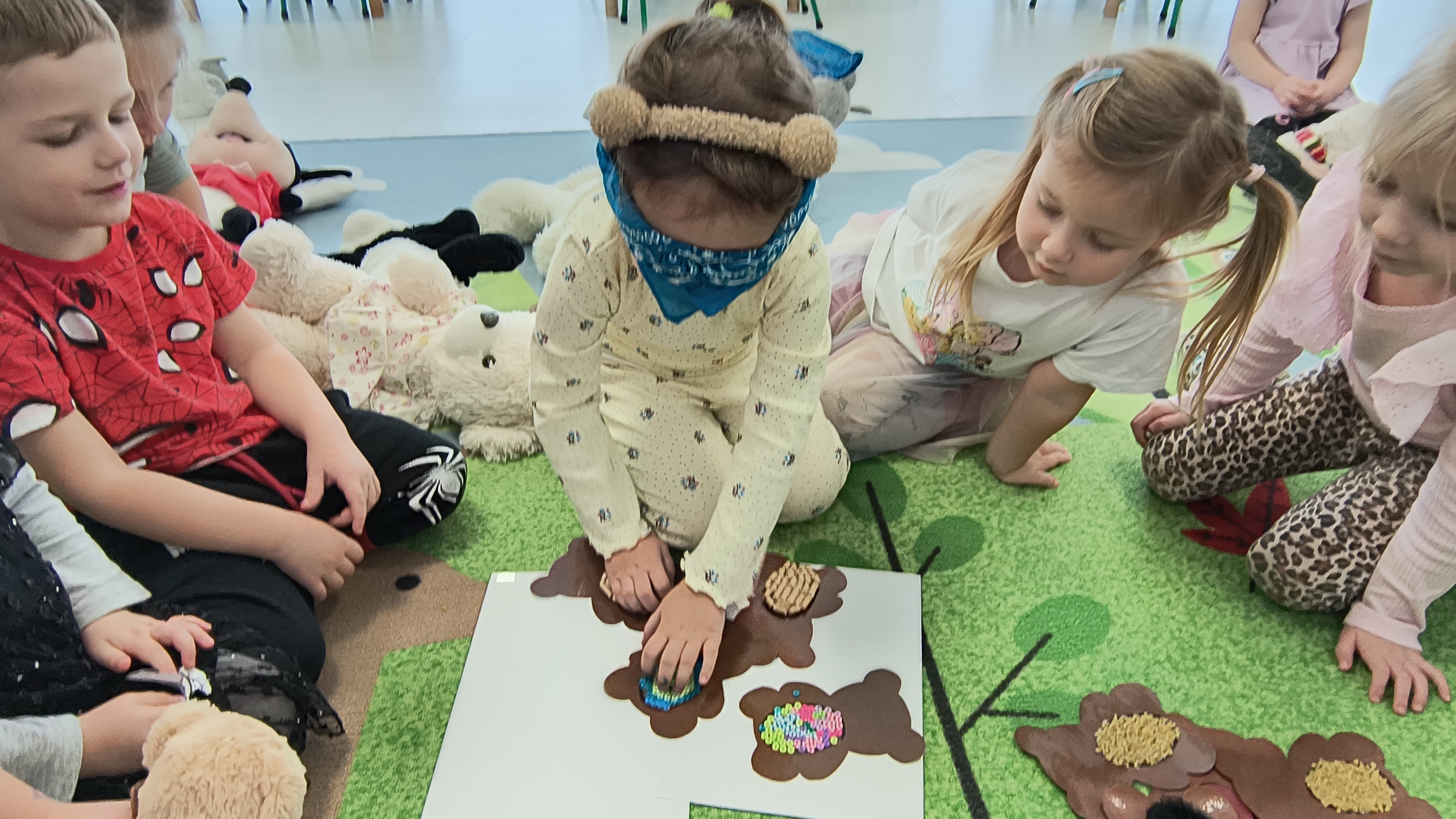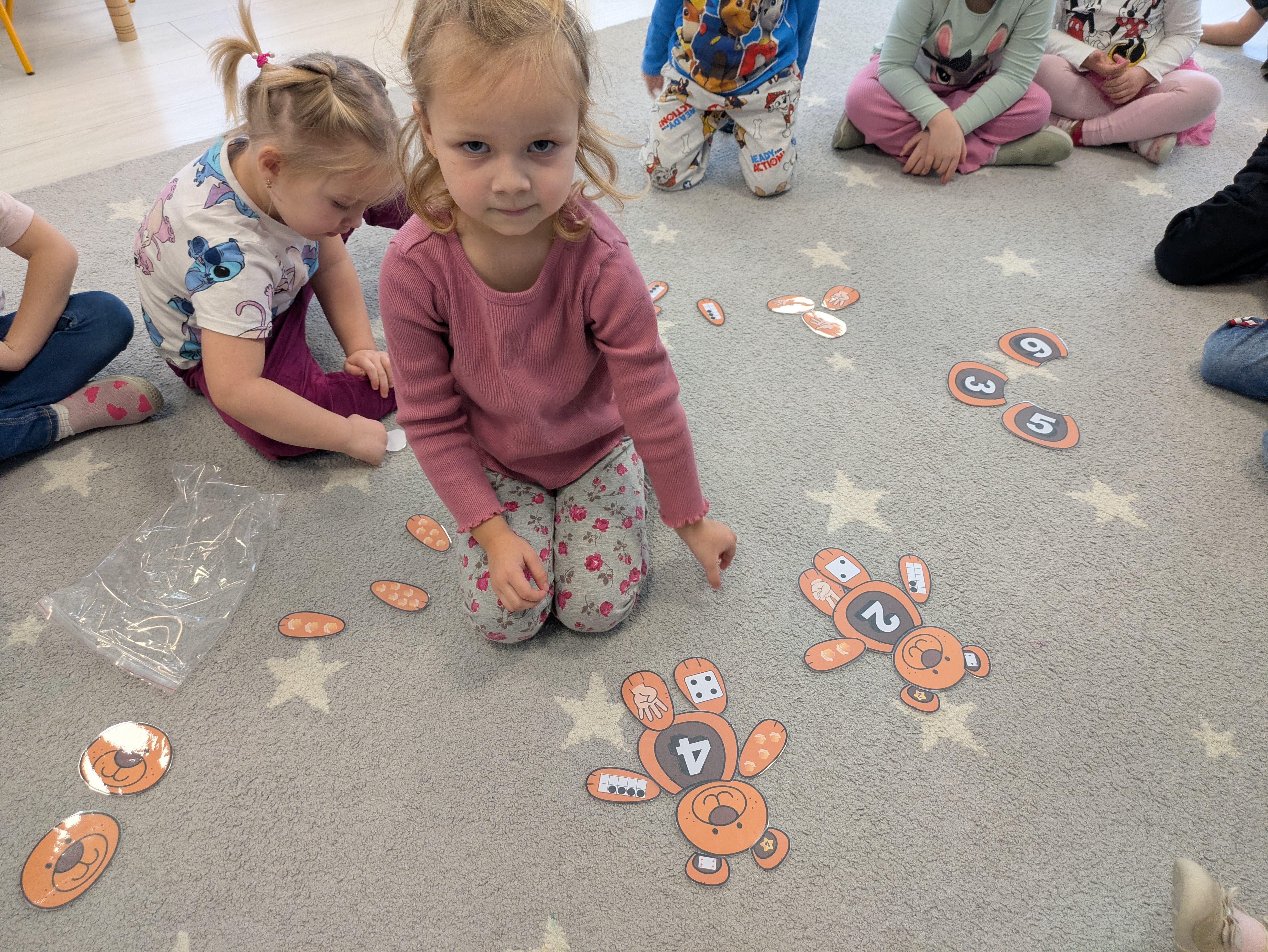 Wspólnie bawiliśmy się w gry dotykowe i ruchowe, które sprawiły dzieciom wiele radości i pozwoliły im rozwijać zmysły oraz koordynację. Na dywanie odbyło się również kodowanie z misiami, podczas którego dzieci uczyły się logicznego myślenia i współpracy, układając proste sekwencje i trasy.