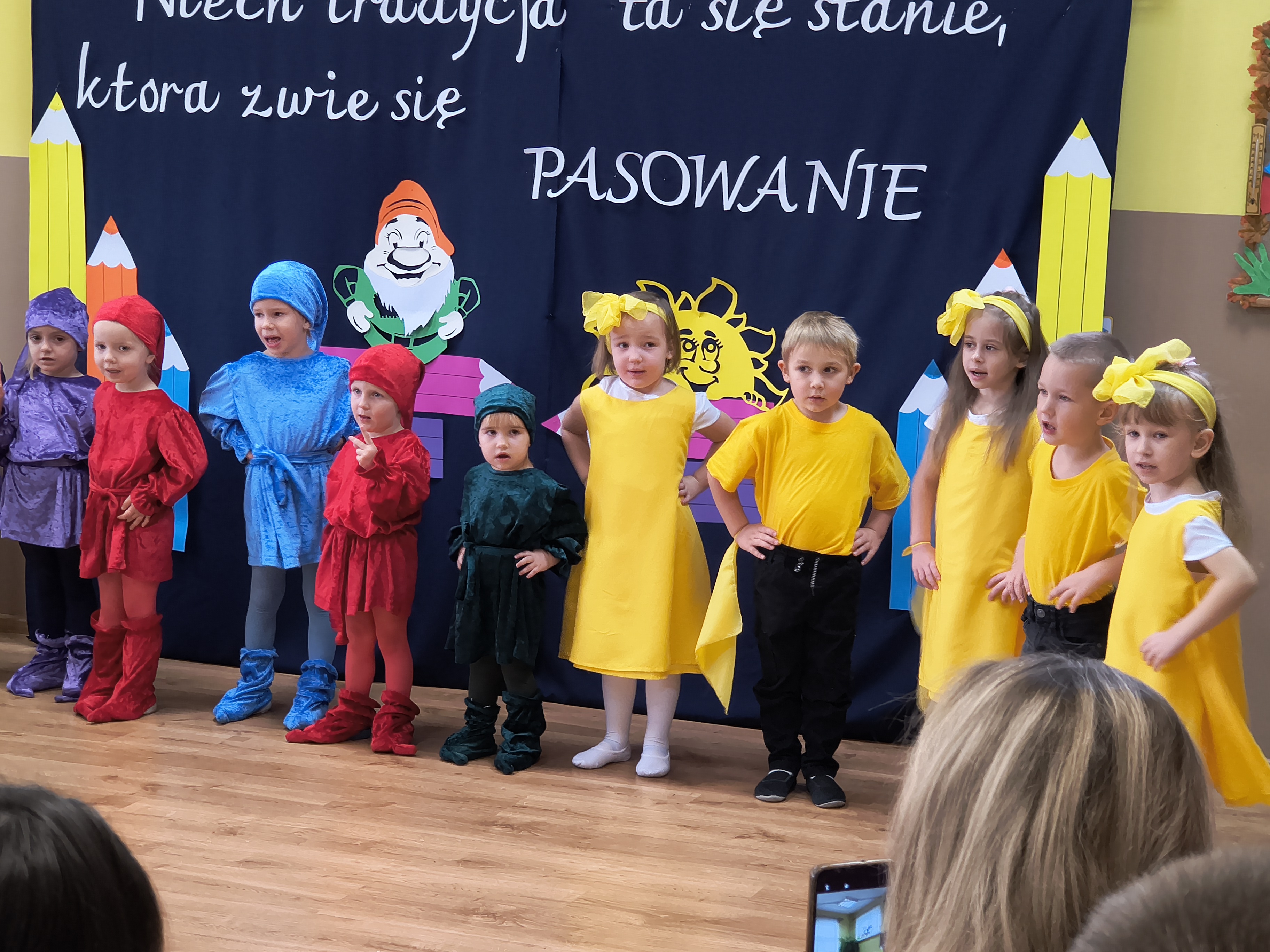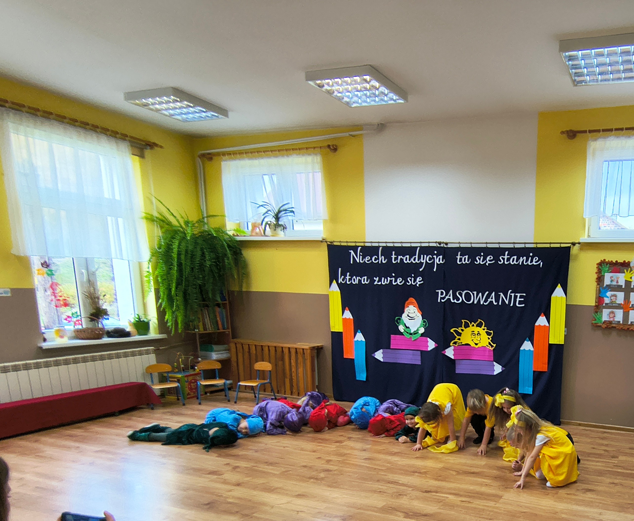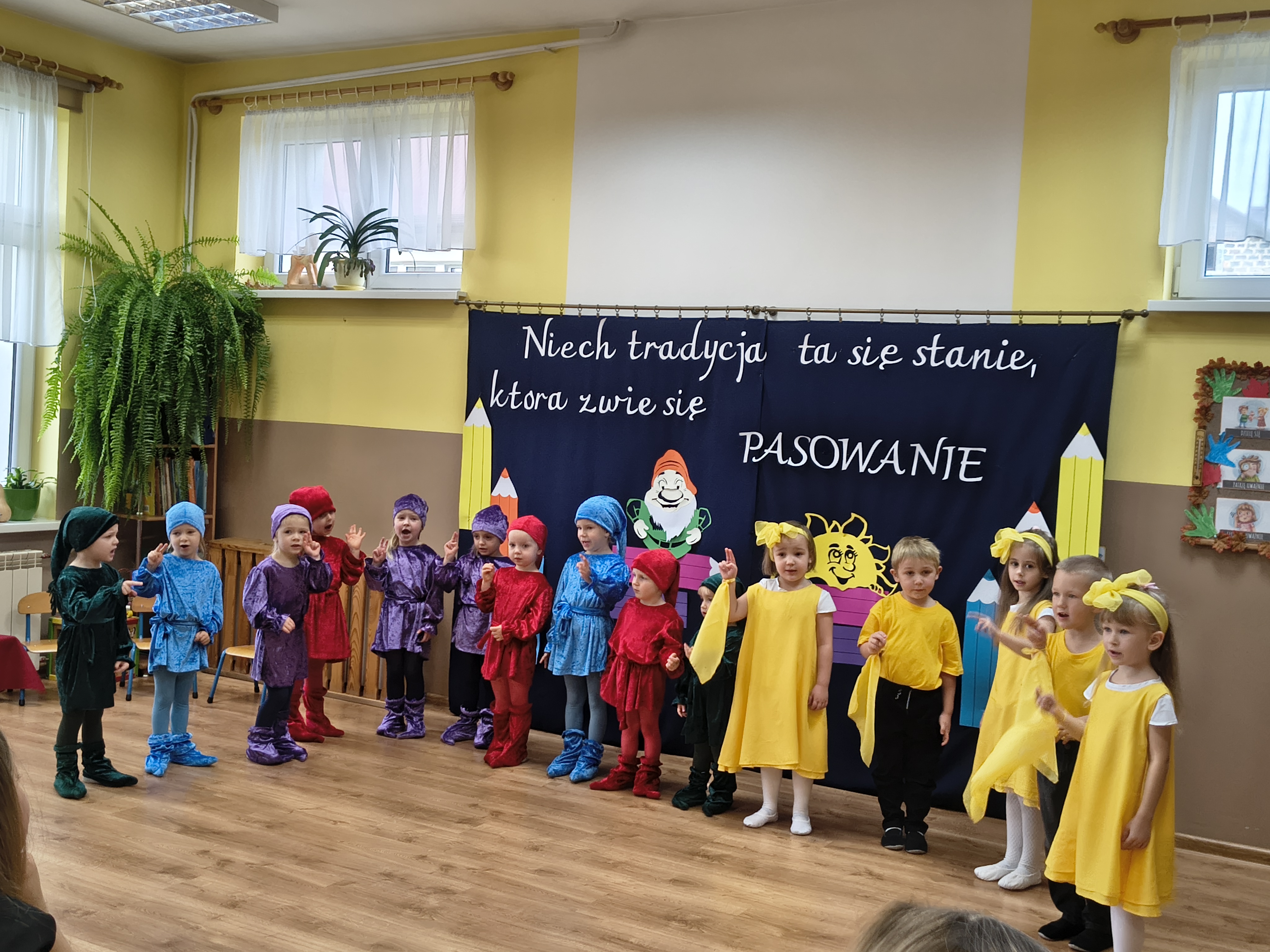 Przedszkolaki zaprezentowały piękną opowieść ruchową, śpiewały piosenki i recytowały wiersze, pokazując wszystkim, jak wiele już potrafią. Ich występ był pełen radości, odwagi i uśmiechu. Najważniejszym momentem uroczystości było oczywiście pasowanie. Pani Dyrektor, przy pomocy magicznego ołówka, zamieniła każde dziecko w prawdziwego przedszkolaka. Na zakończenie wszyscy otrzymali pamiątkowe medale, dyplomy oraz upominki, które przypominać będą o tym ważnym dniu.