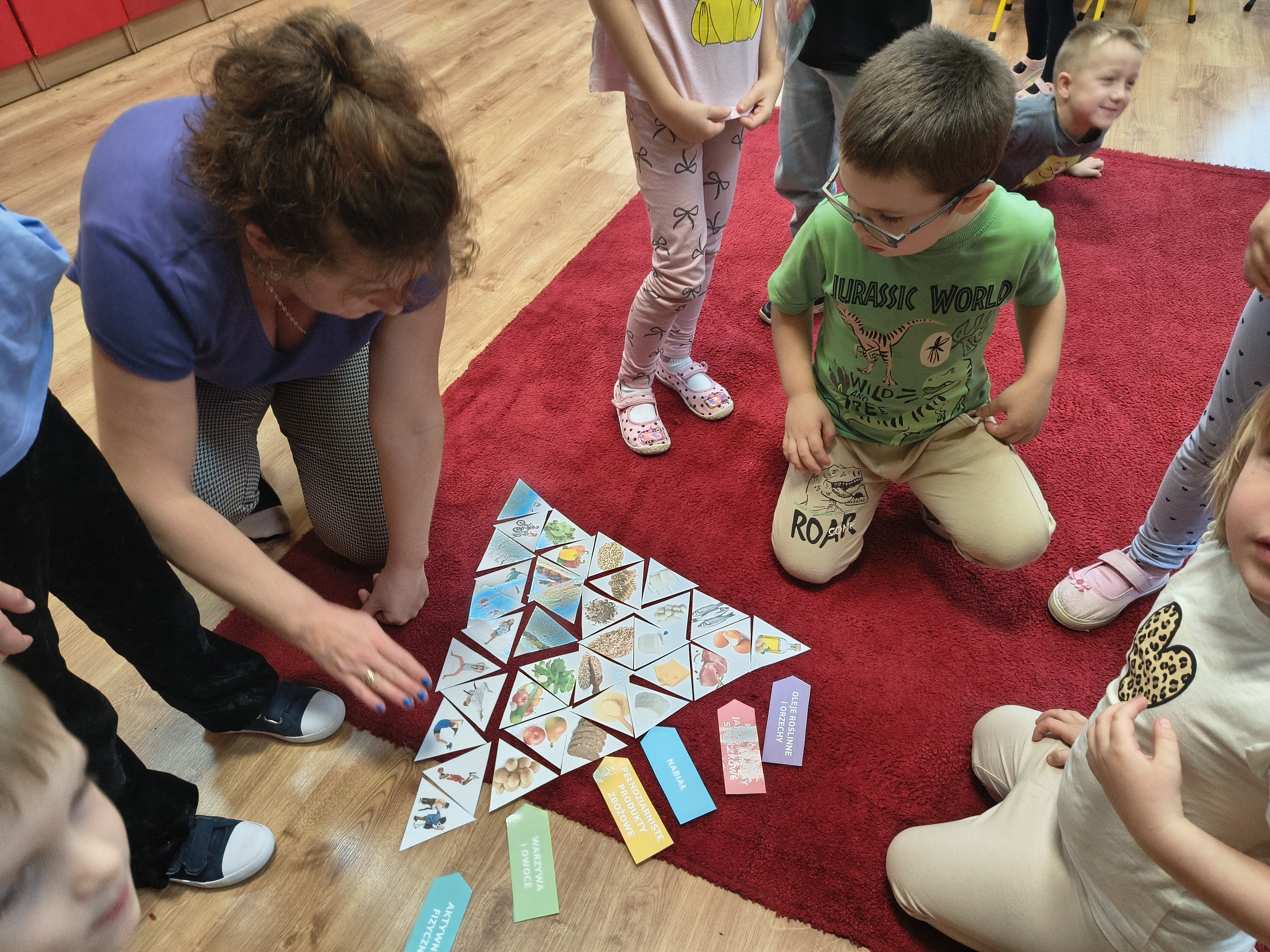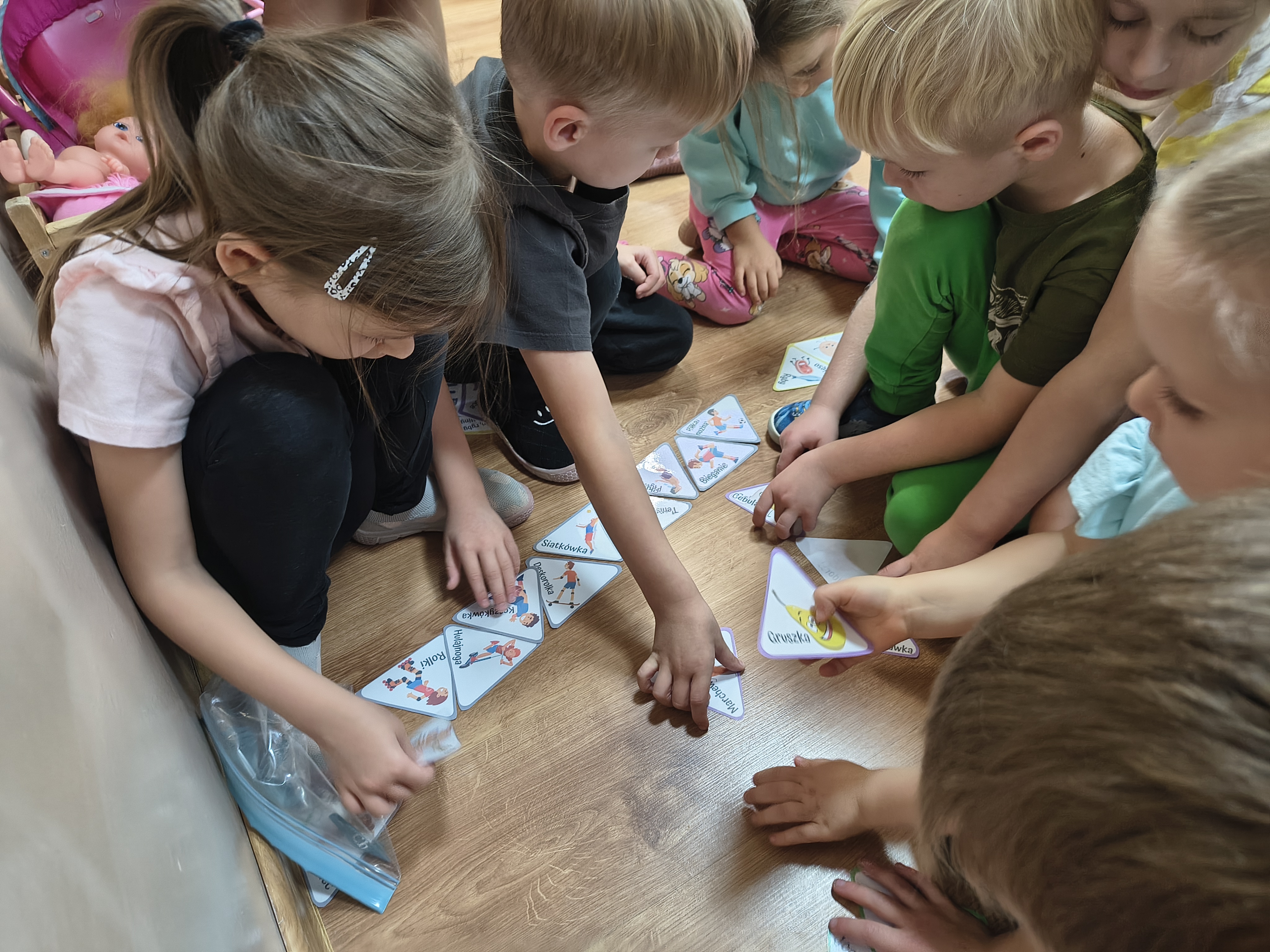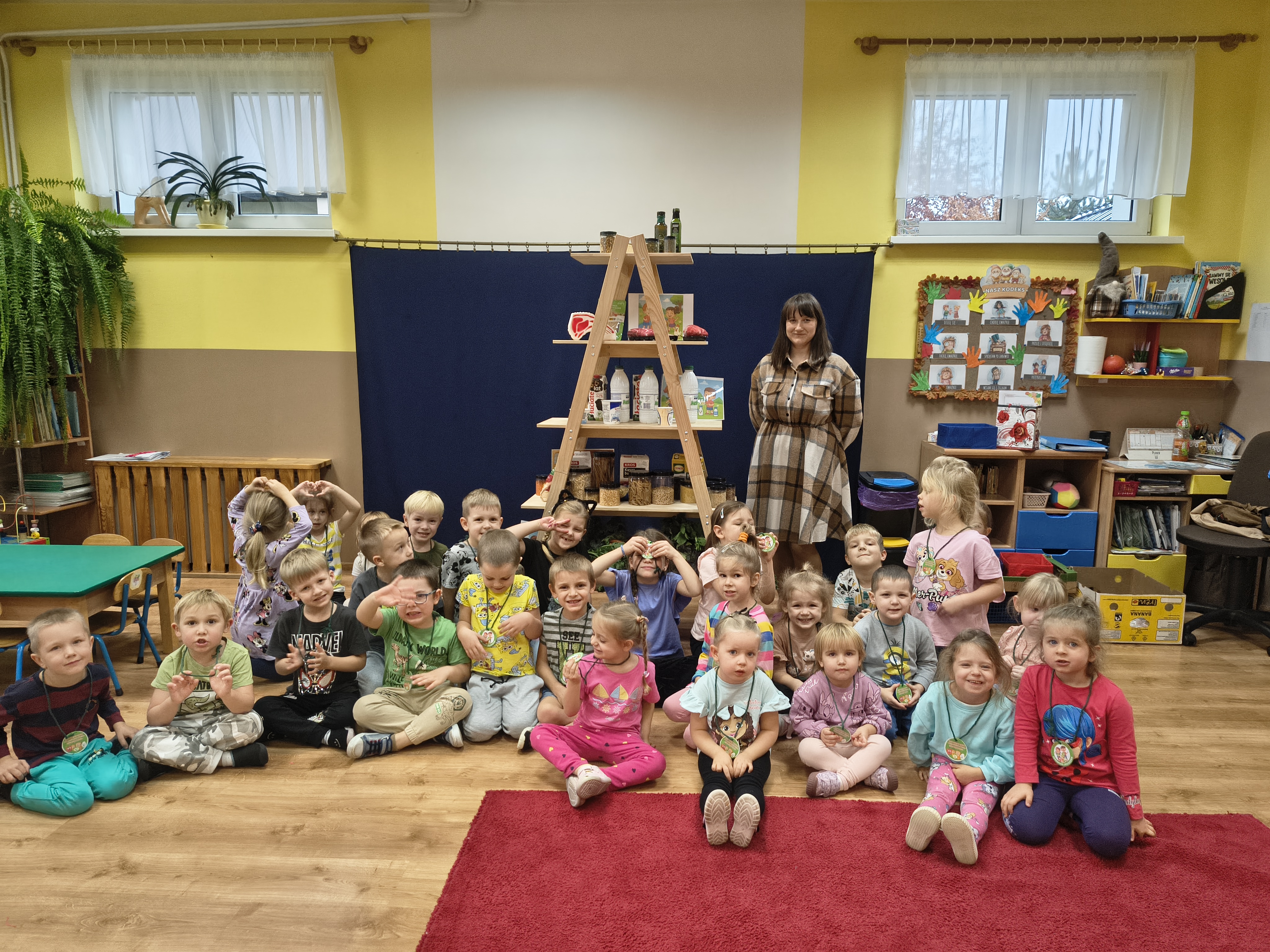W poniedziałek tj 03.11.2025 r. w naszym przedszkolu odbyły się zajęcia dotyczące zdrowego żywienia. Pani Klaudia – mama jednego z naszych przedszkolaków – przyniosła do sali dużą piramidę żywieniową, którą dzieci mogły wspólnie uzupełniać odpowiednimi produktami. Zanim jednak rozpoczęliśmy pracę, Pani Klaudia przeczytała krótką bajkę edukacyjną, dzięki której dzieci łatwiej zrozumiały, jakie jedzenie jest dla nich zdrowe, a czego warto unikać. Następnie dzieci, pracując w grupach, układały piramidę z przygotowanych puzzli. Zajęcia przyniosły wiele uśmiechu, nauki i wspólnej zabawy. Na zakończenie każdy przedszkolak otrzymał pamiątkowy medal.