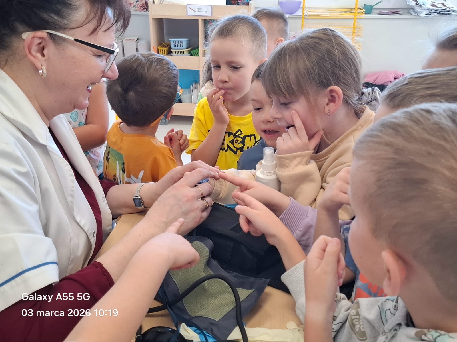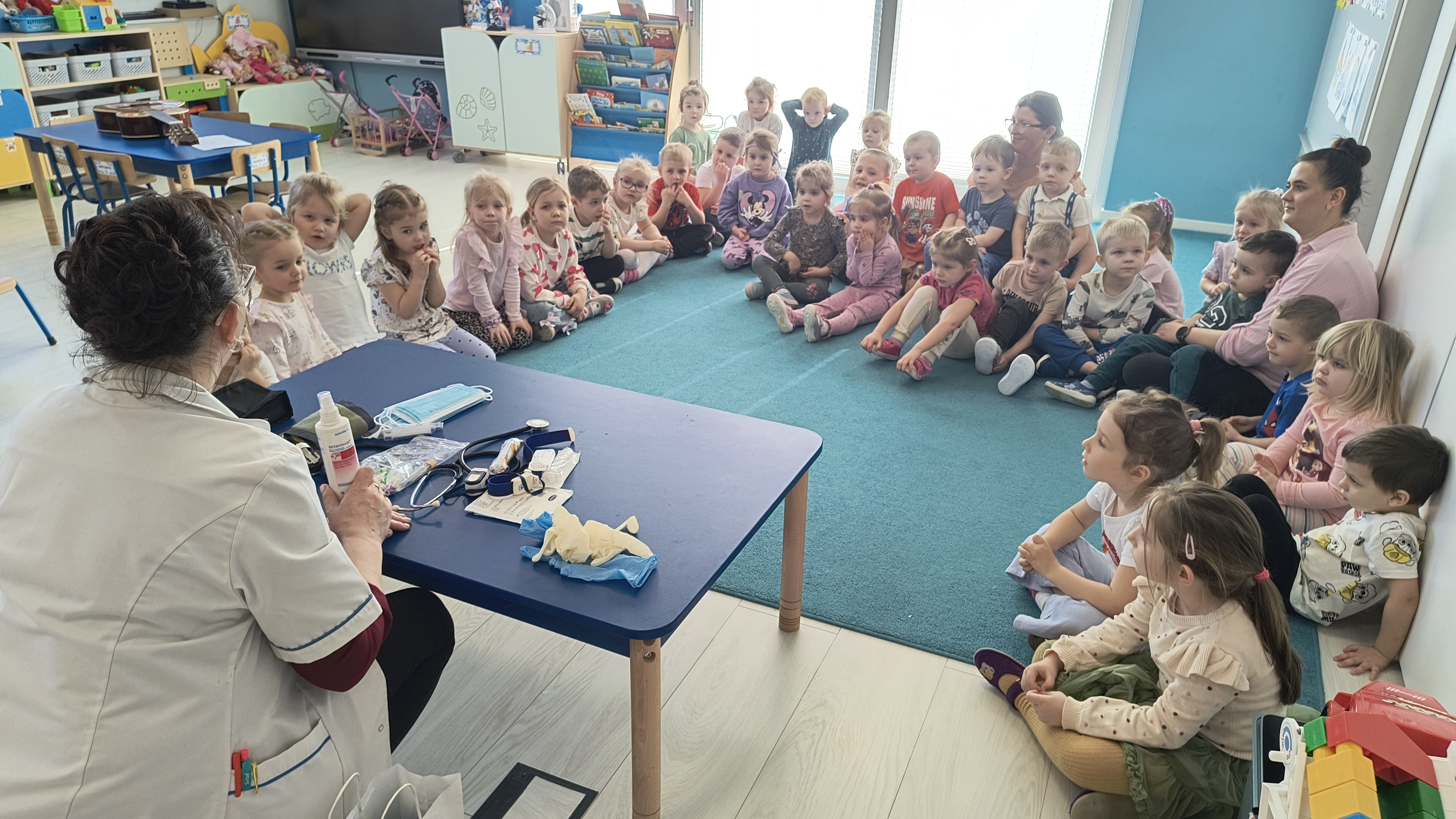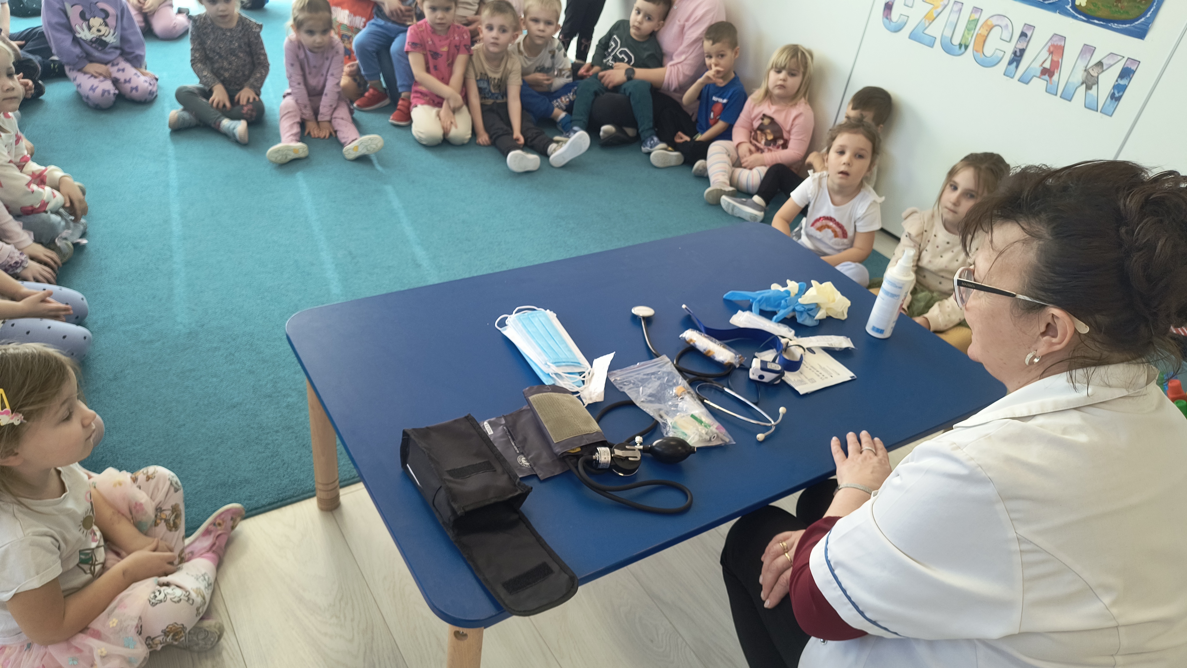 Pani Agnieszka opowiedziała dzieciom o swojej pracy oraz o tym, jak ważna i odpowiedzialna jest rola pielęgniarki w dbaniu o zdrowie pacjentów. Przedszkolaki z ogromnym zainteresowaniem oglądały wyposażenie pielęgniarskiej torby i dowiedziały się, do czego służą poszczególne przyrządy.