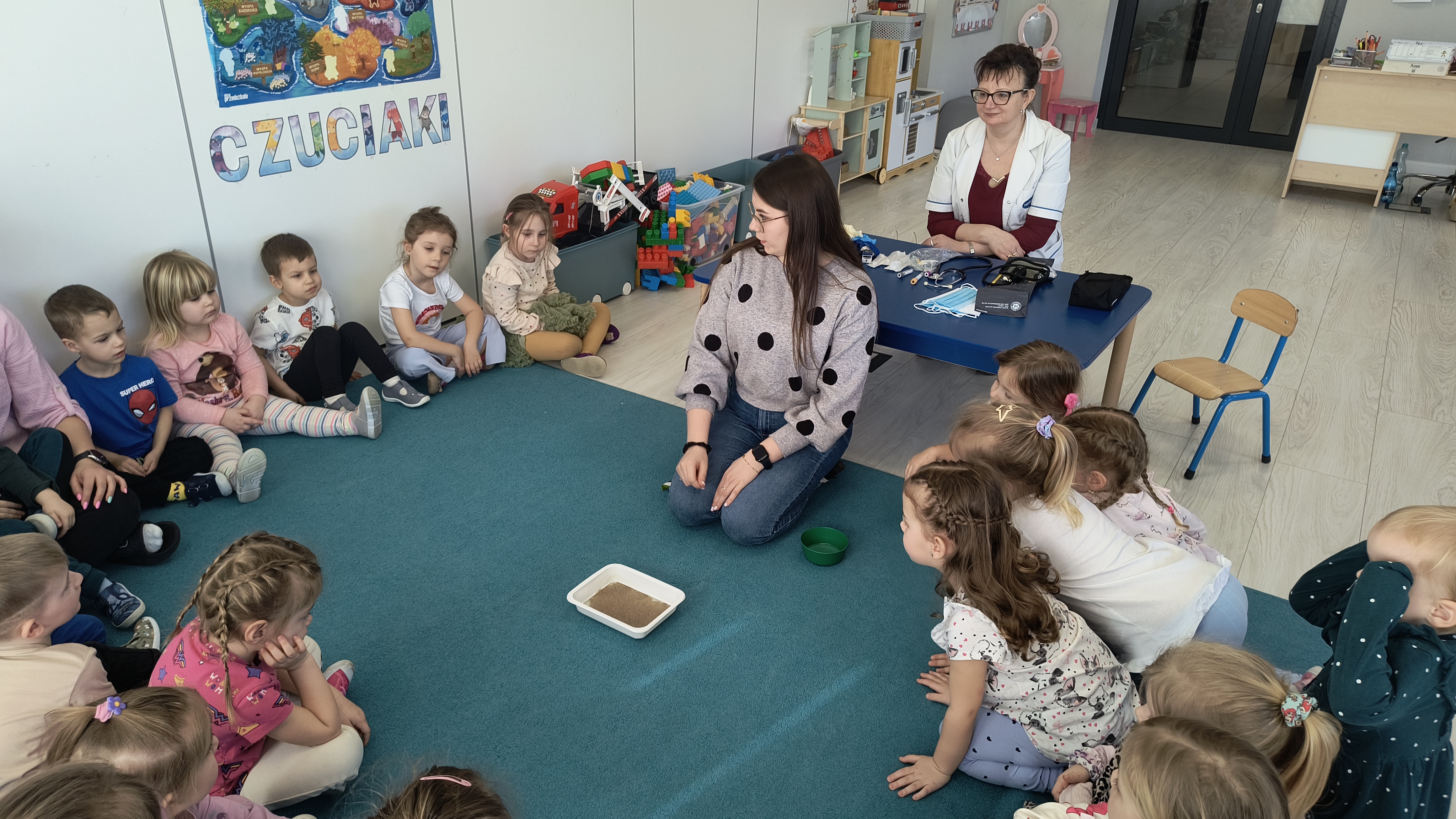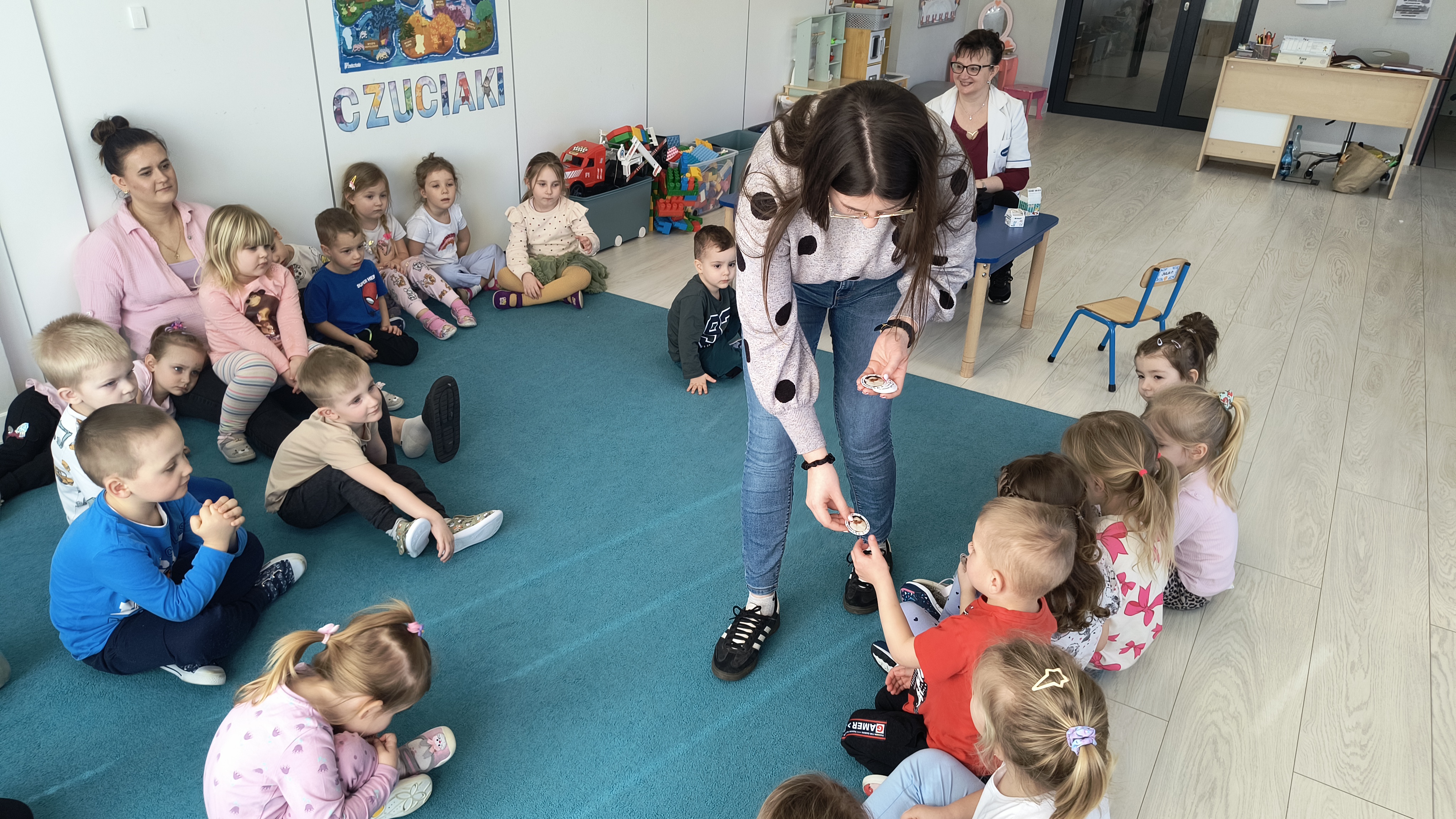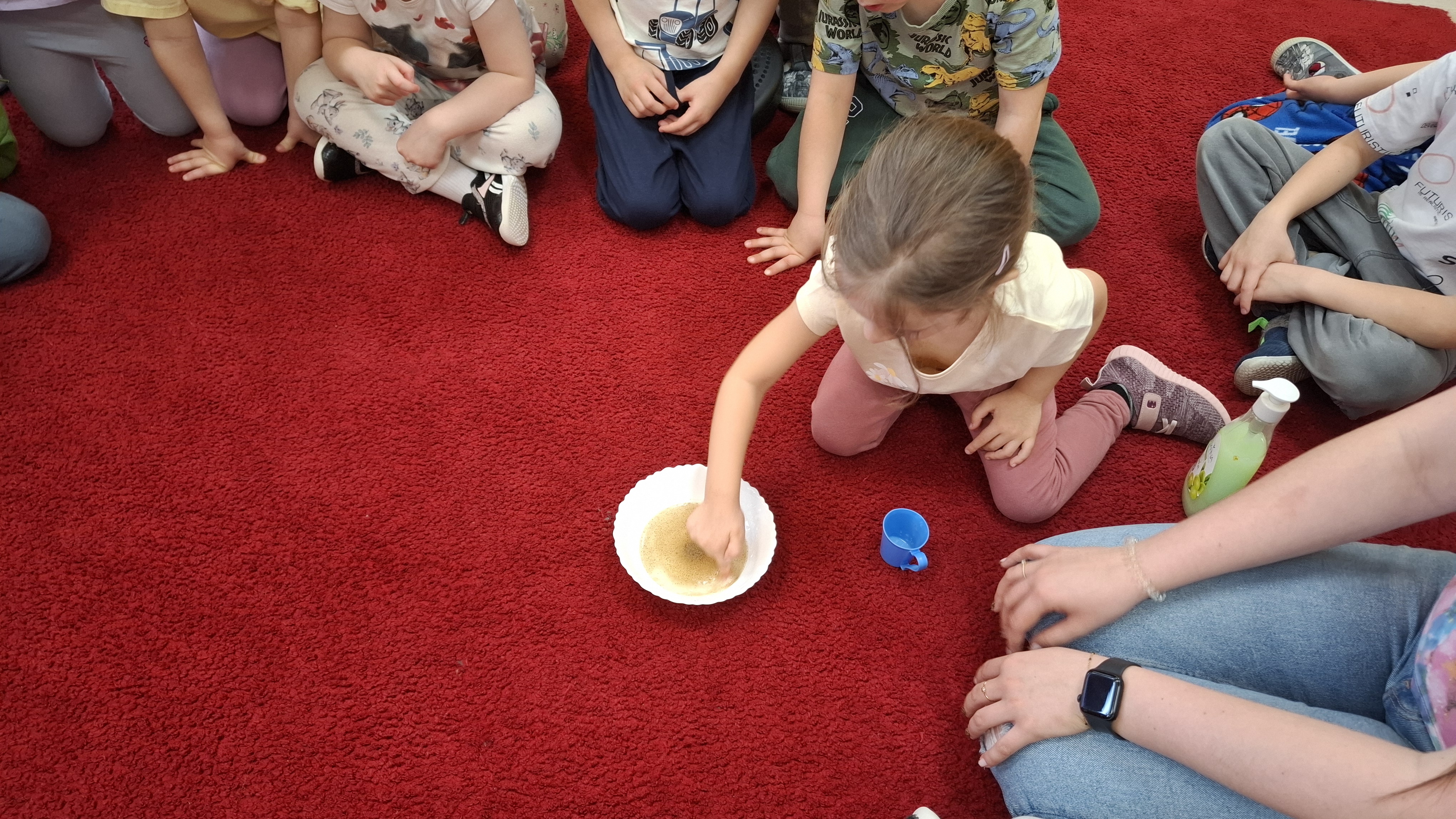 Razem z Panią Agnieszką gościliśmy również jej córkę – Panią Martynę, która przygotowała ciekawy eksperyment. W prosty i obrazowy sposób pokazała nam, jak brud i zarazki mogą utrudniać codzienne życie oraz dlaczego tak ważne jest dokładne mycie rąk.