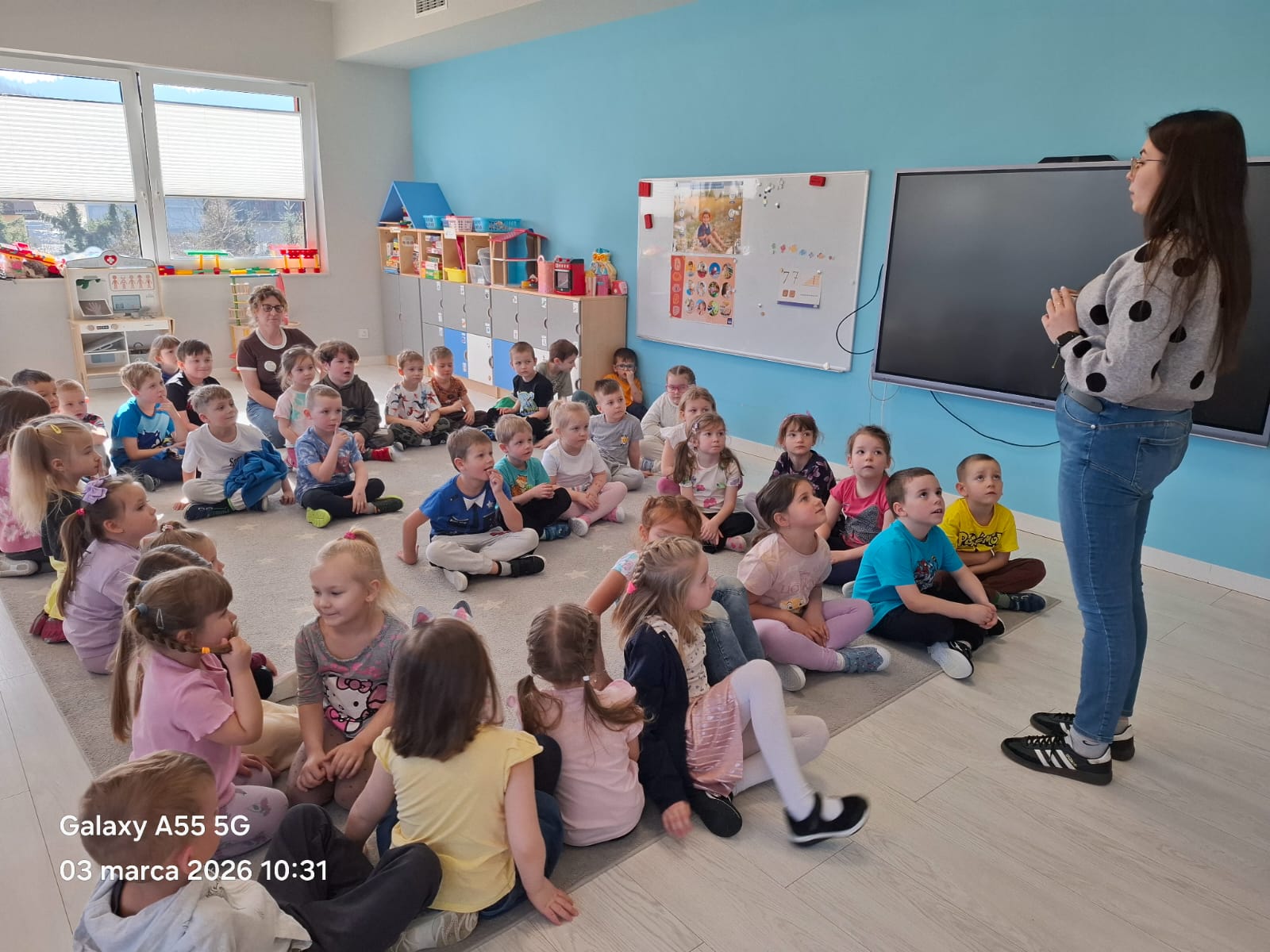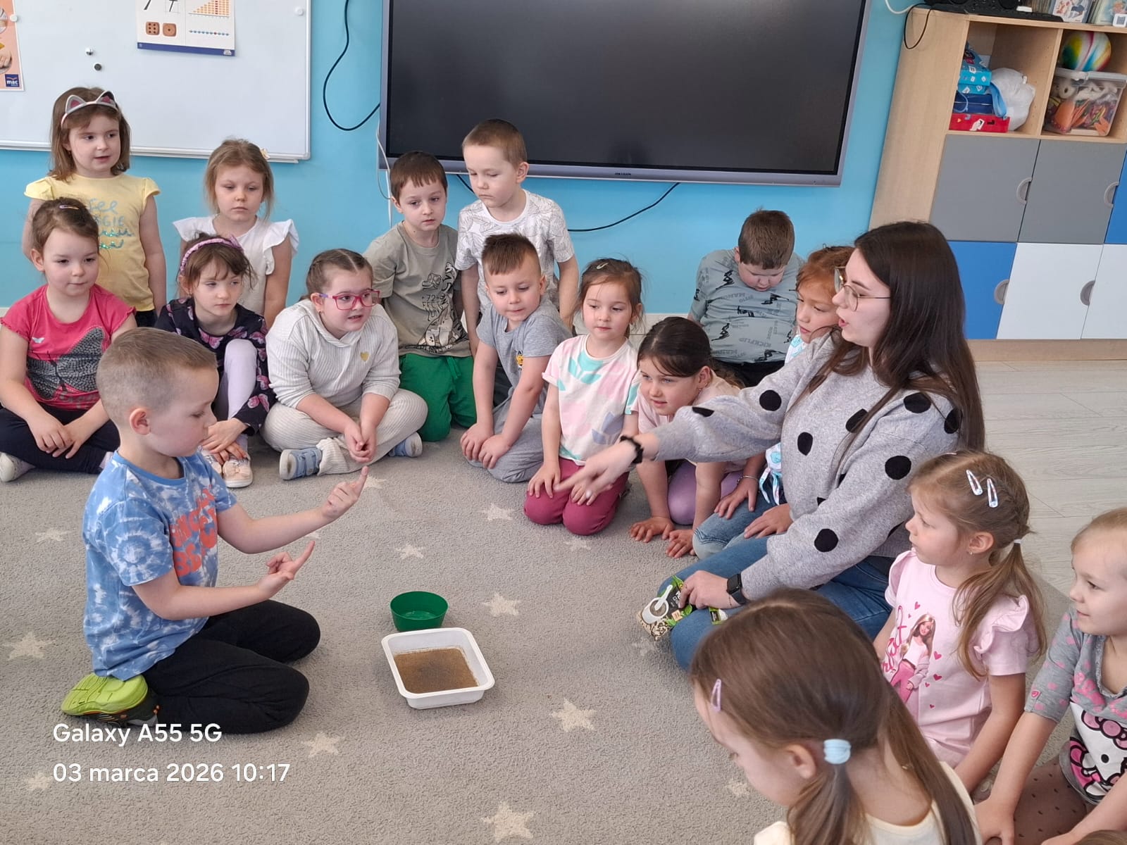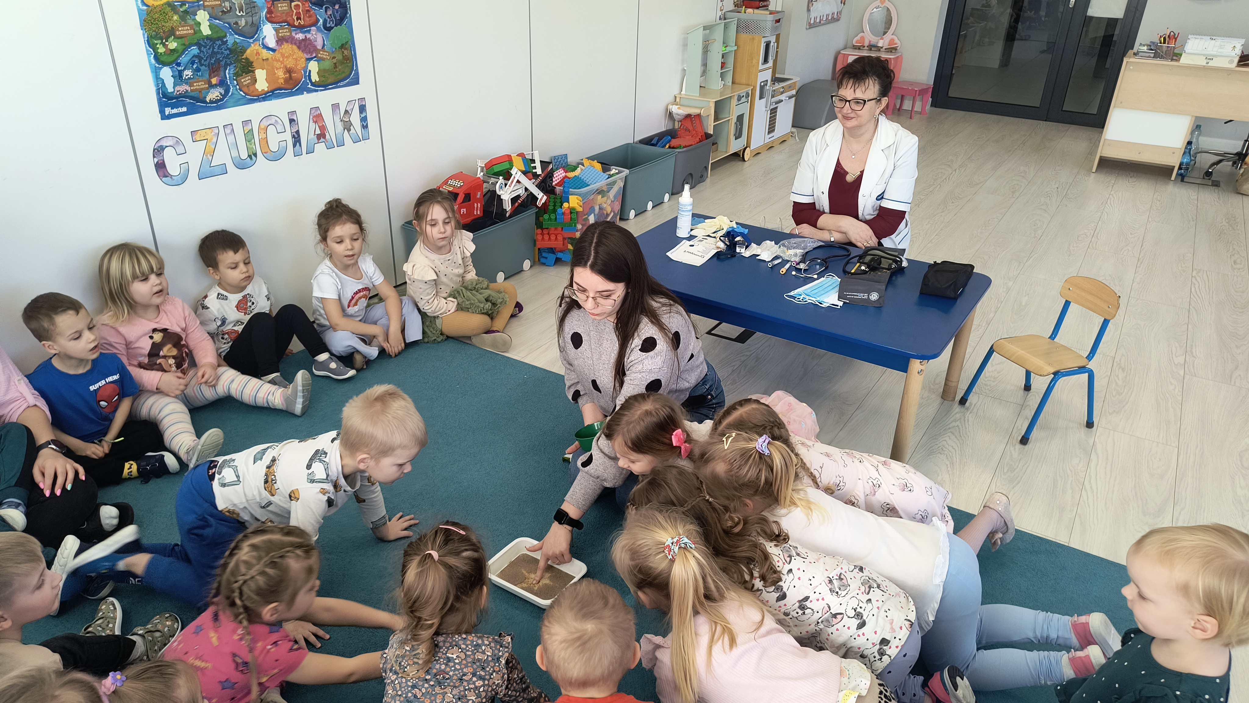 Razem z Panią Agnieszką gościliśmy również jej córkę – Panią Martynę, która przygotowała ciekawy eksperyment. W prosty i obrazowy sposób pokazała nam, jak brud i zarazki mogą utrudniać codzienne życie oraz dlaczego tak ważne jest dokładne mycie rąk.