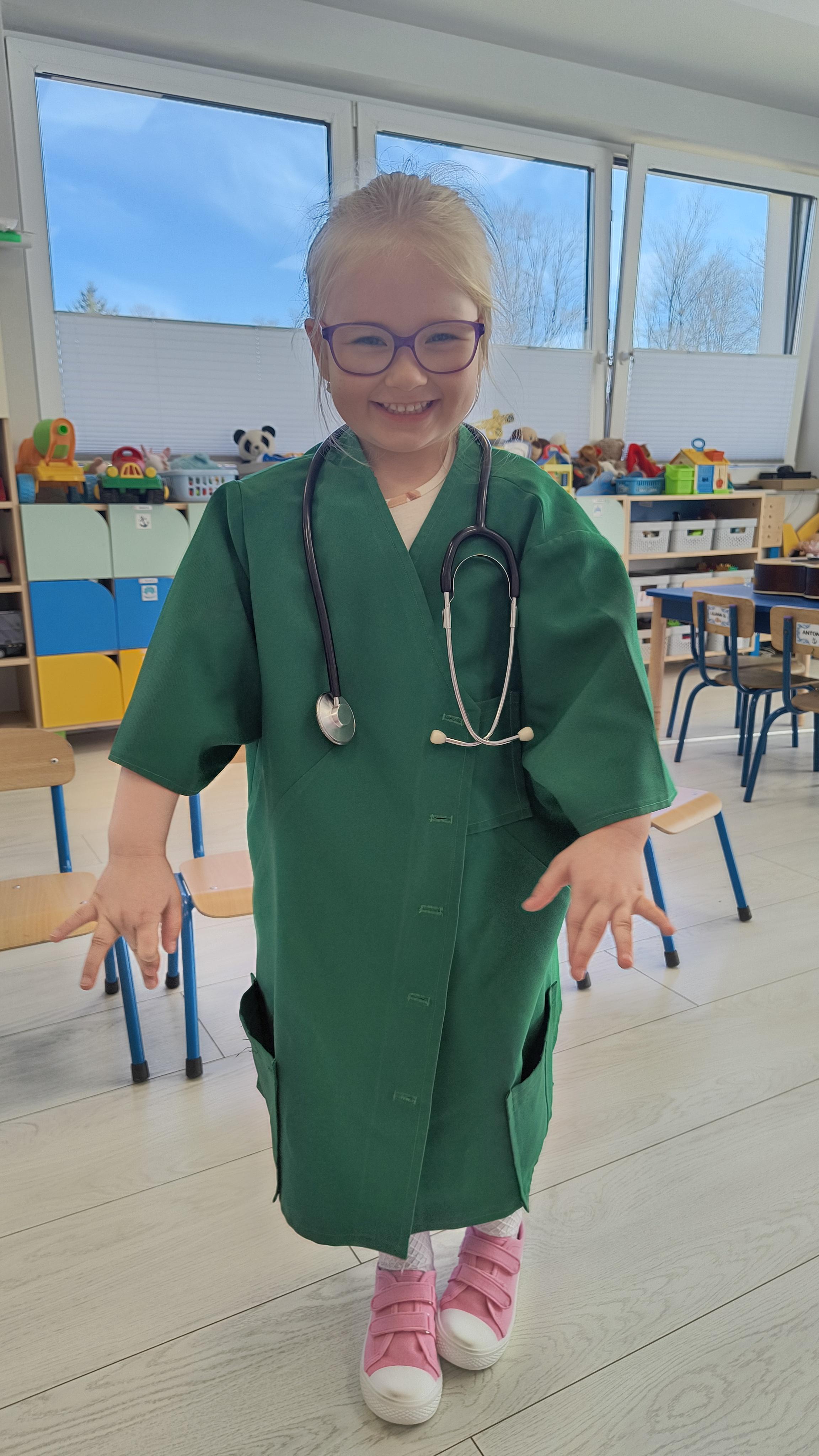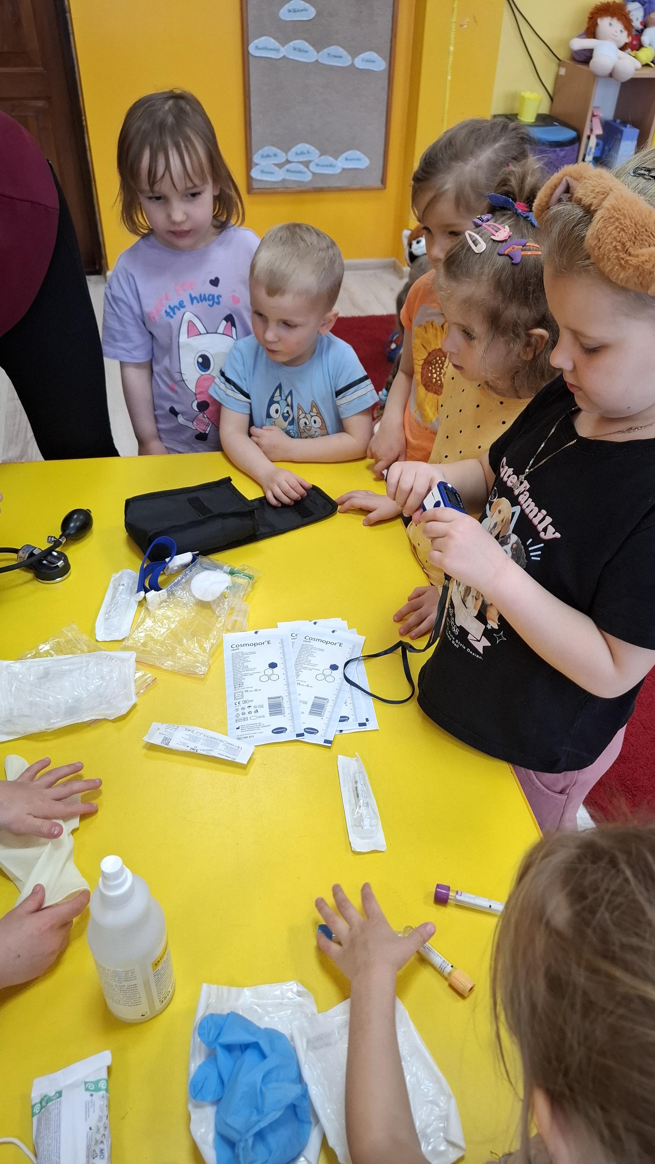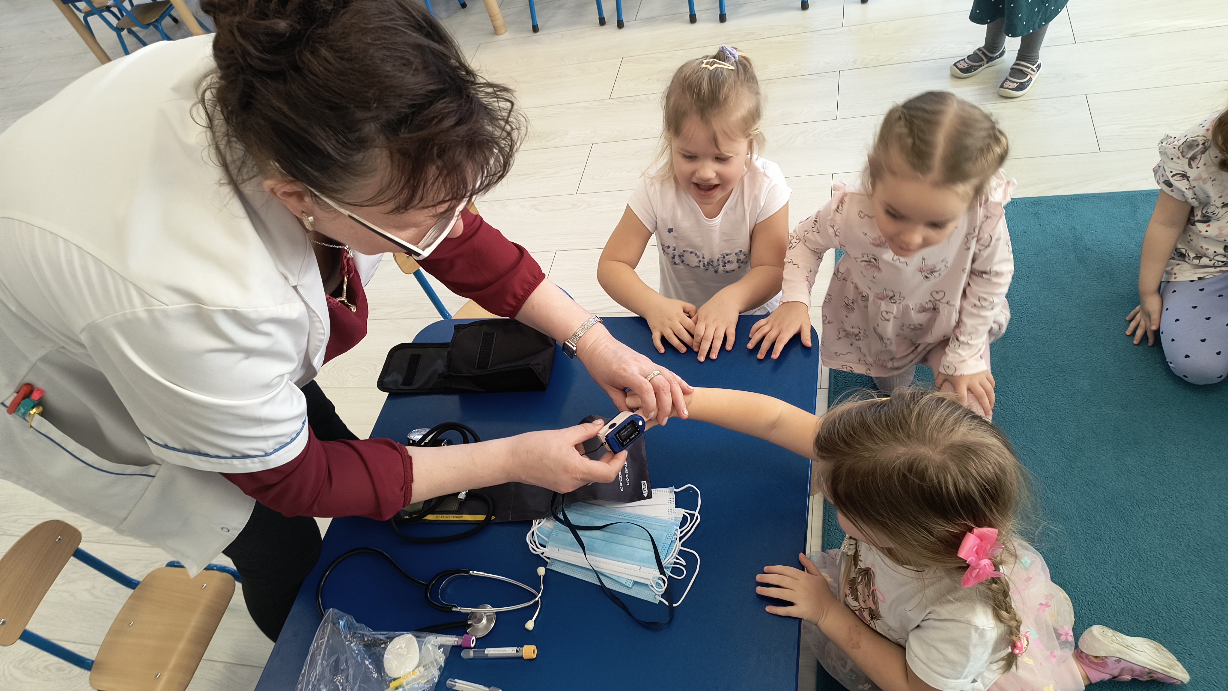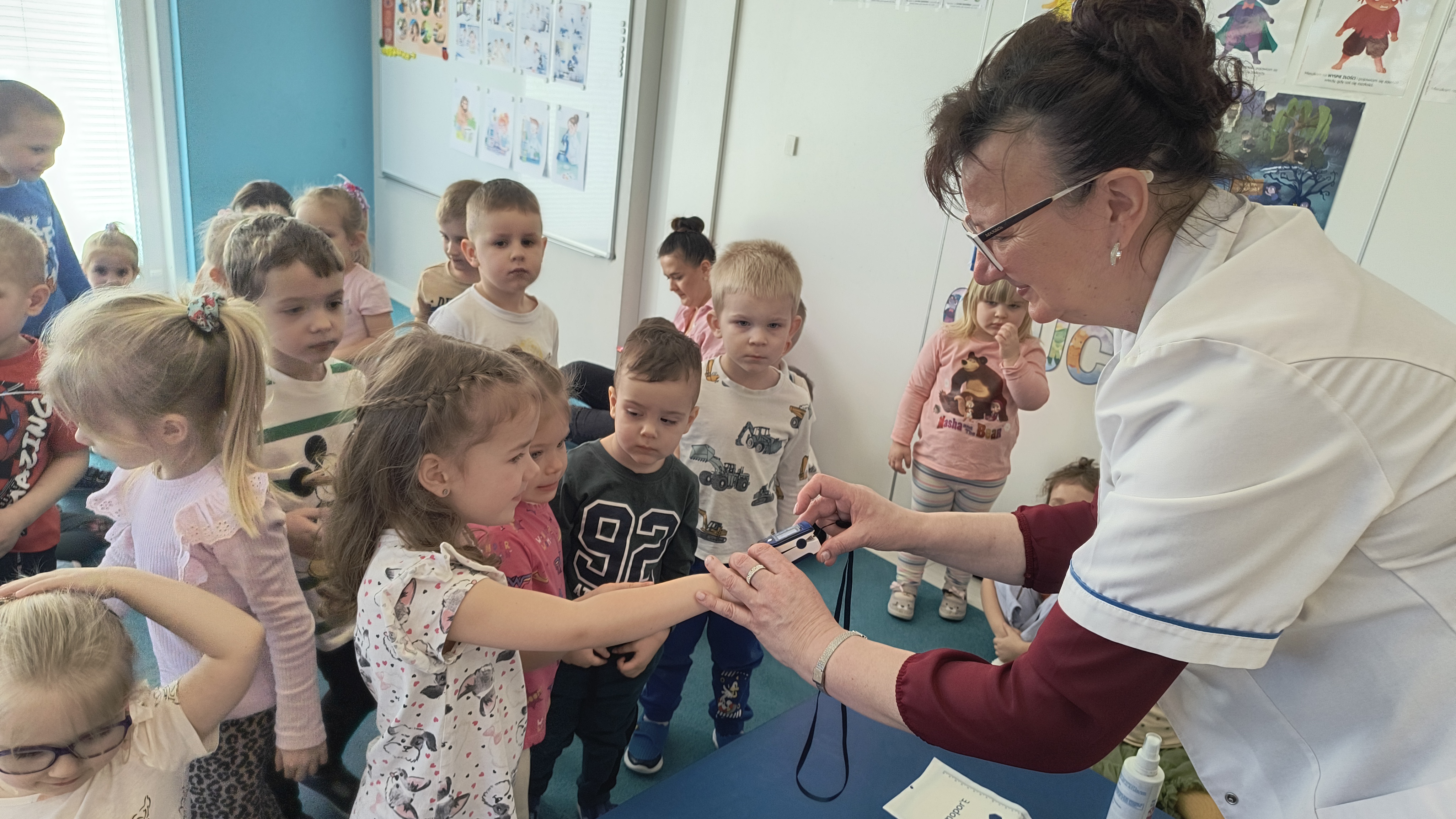 Dodatkową atrakcją była możliwość wcielenia się w rolę pielęgniarki. Każde dziecko mogło przymierzyć strój pielęgniarski, spróbować swoich sił w zakładaniu rękawiczek oraz sprawdzić poziom saturacji przy użyciu pulsoksymetru. To doświadczenie wzbudziło wiele emocji i radości!
