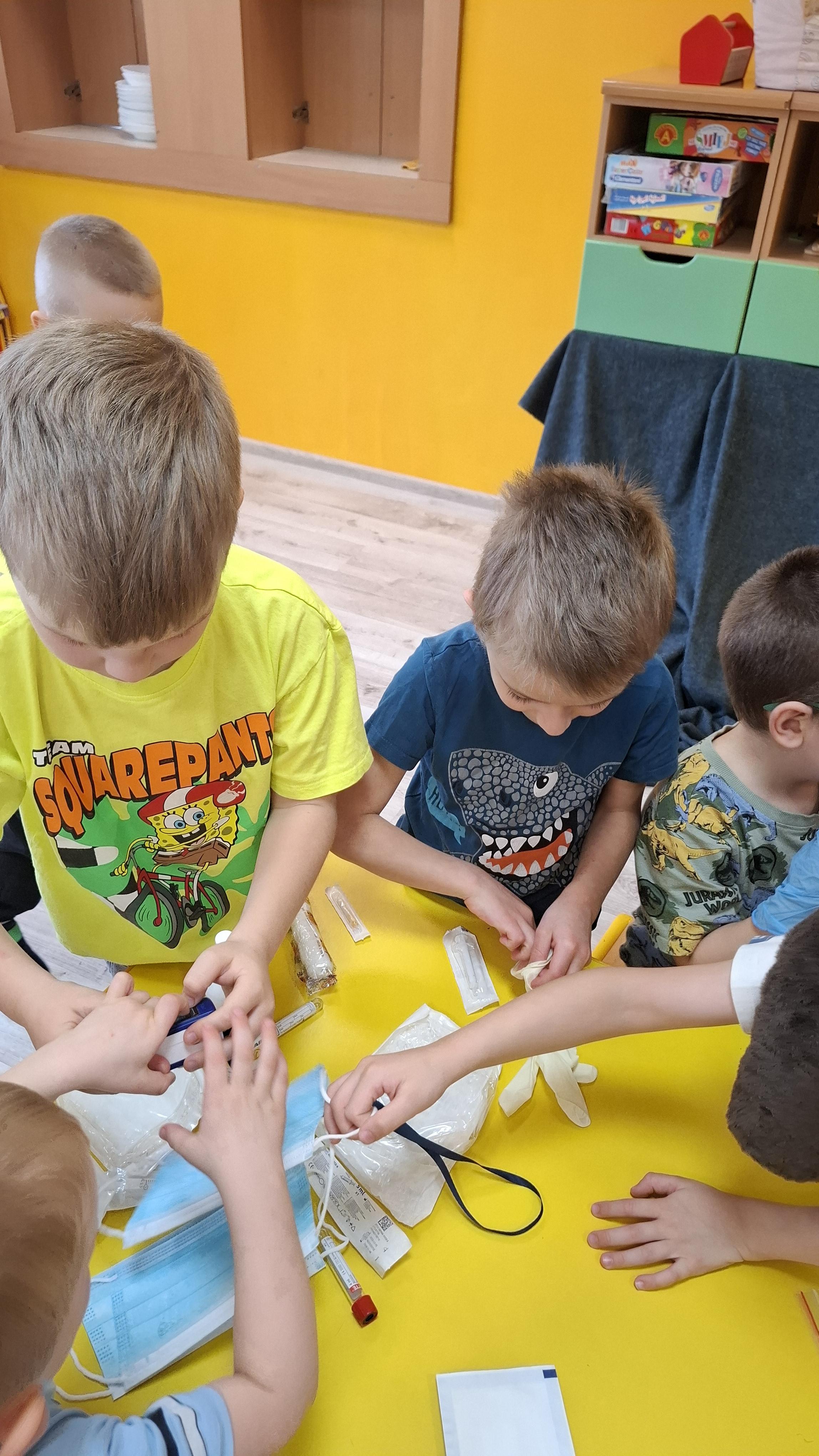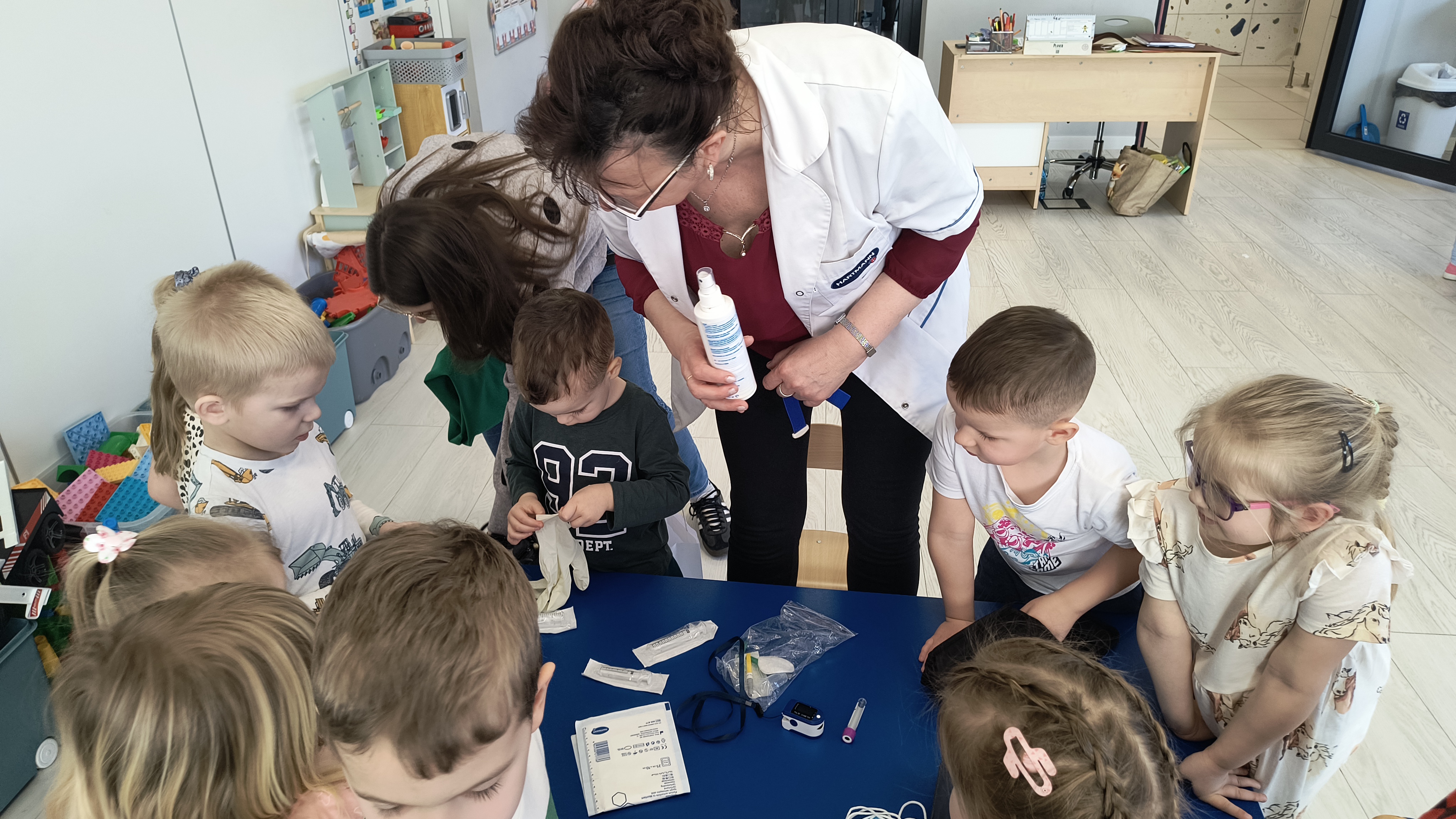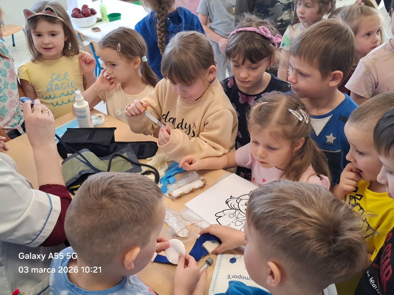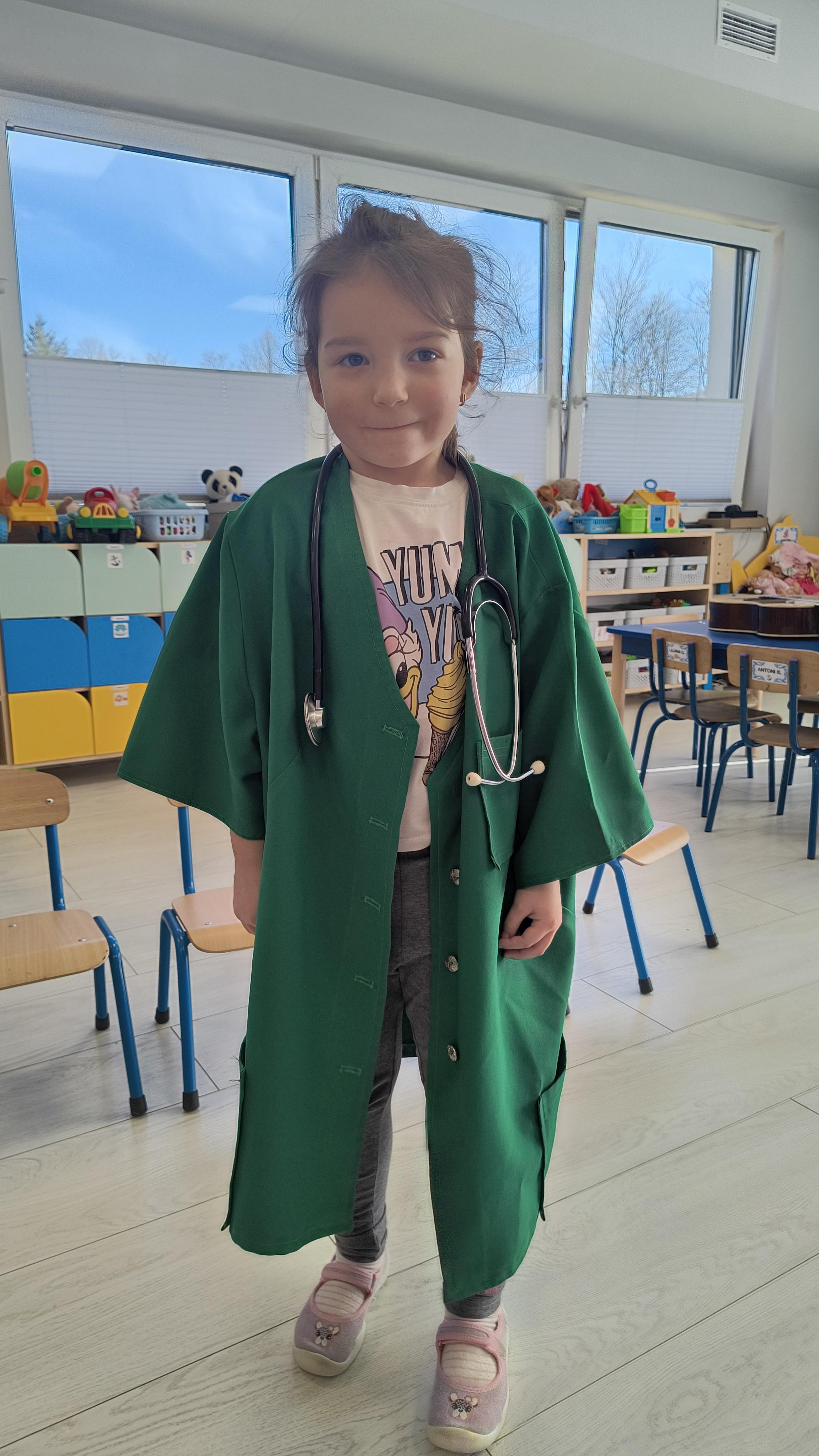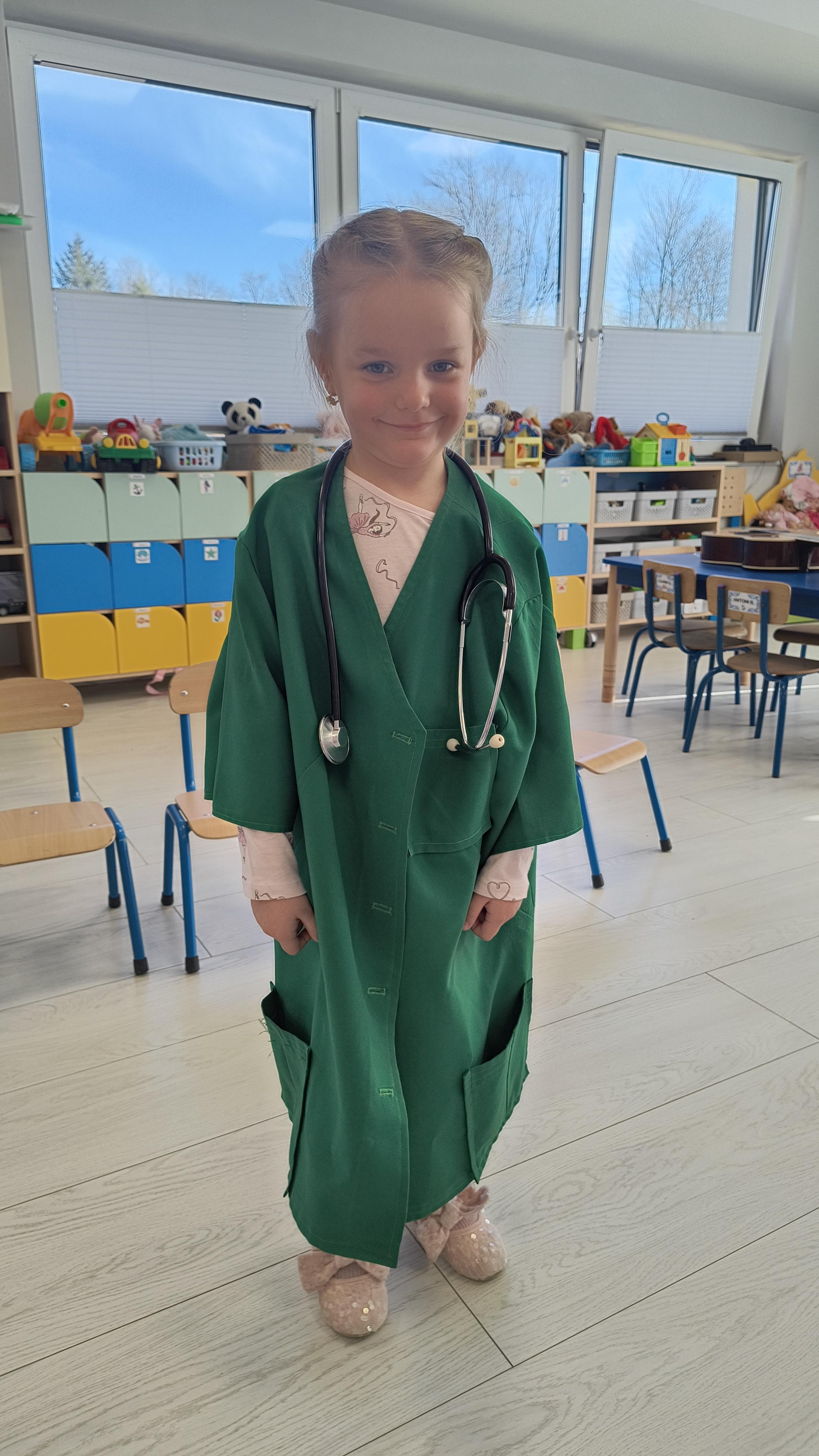 Dodatkową atrakcją była możliwość wcielenia się w rolę pielęgniarki. Każde dziecko mogło przymierzyć strój pielęgniarski, spróbować swoich sił w zakładaniu rękawiczek oraz sprawdzić poziom saturacji przy użyciu pulsoksymetru. To doświadczenie wzbudziło wiele emocji i radości!
