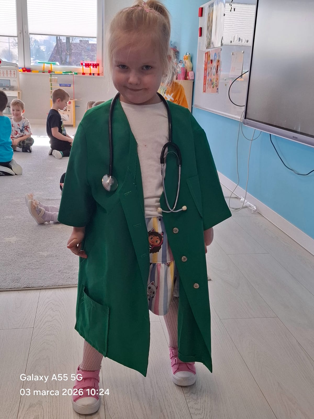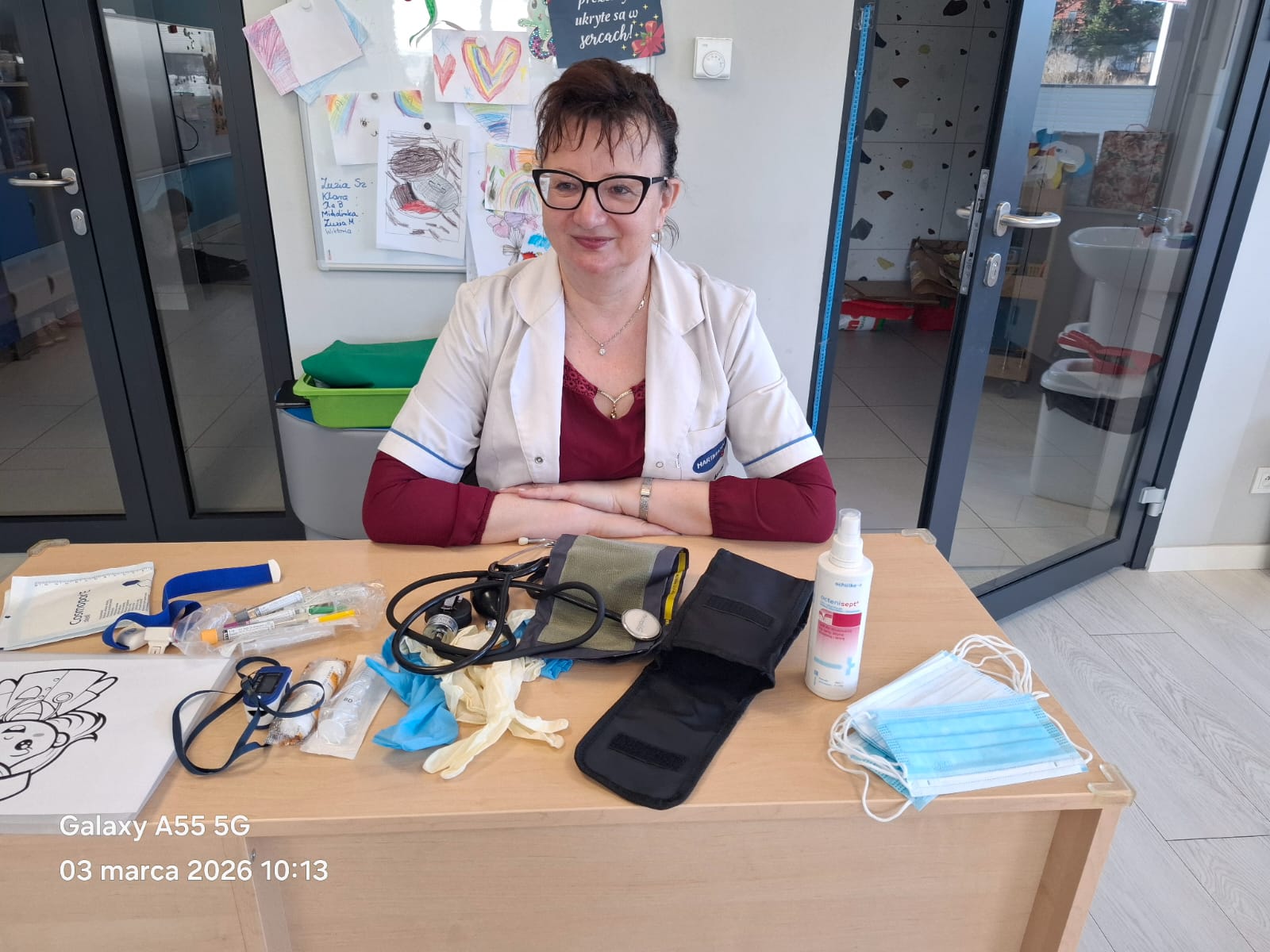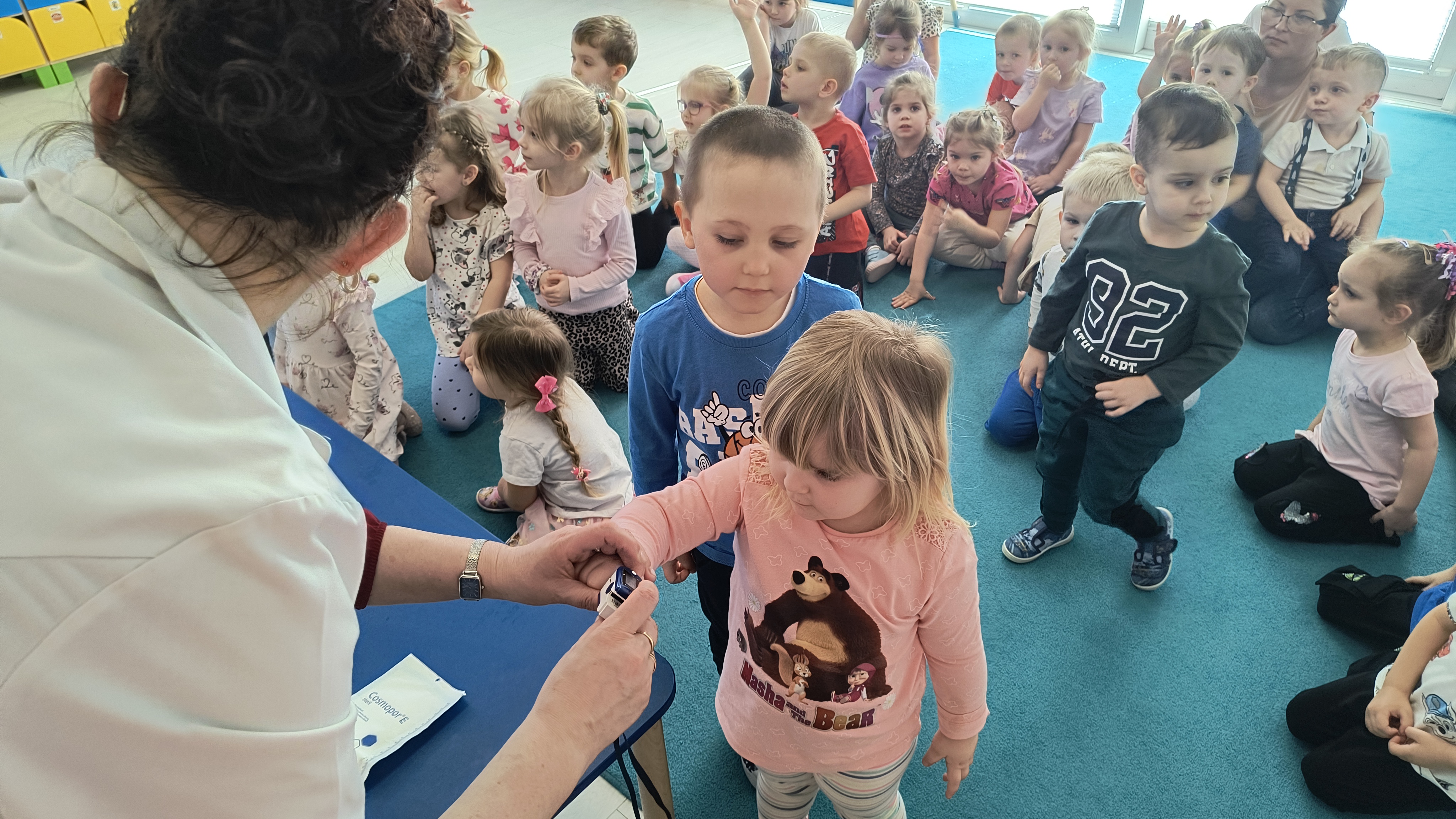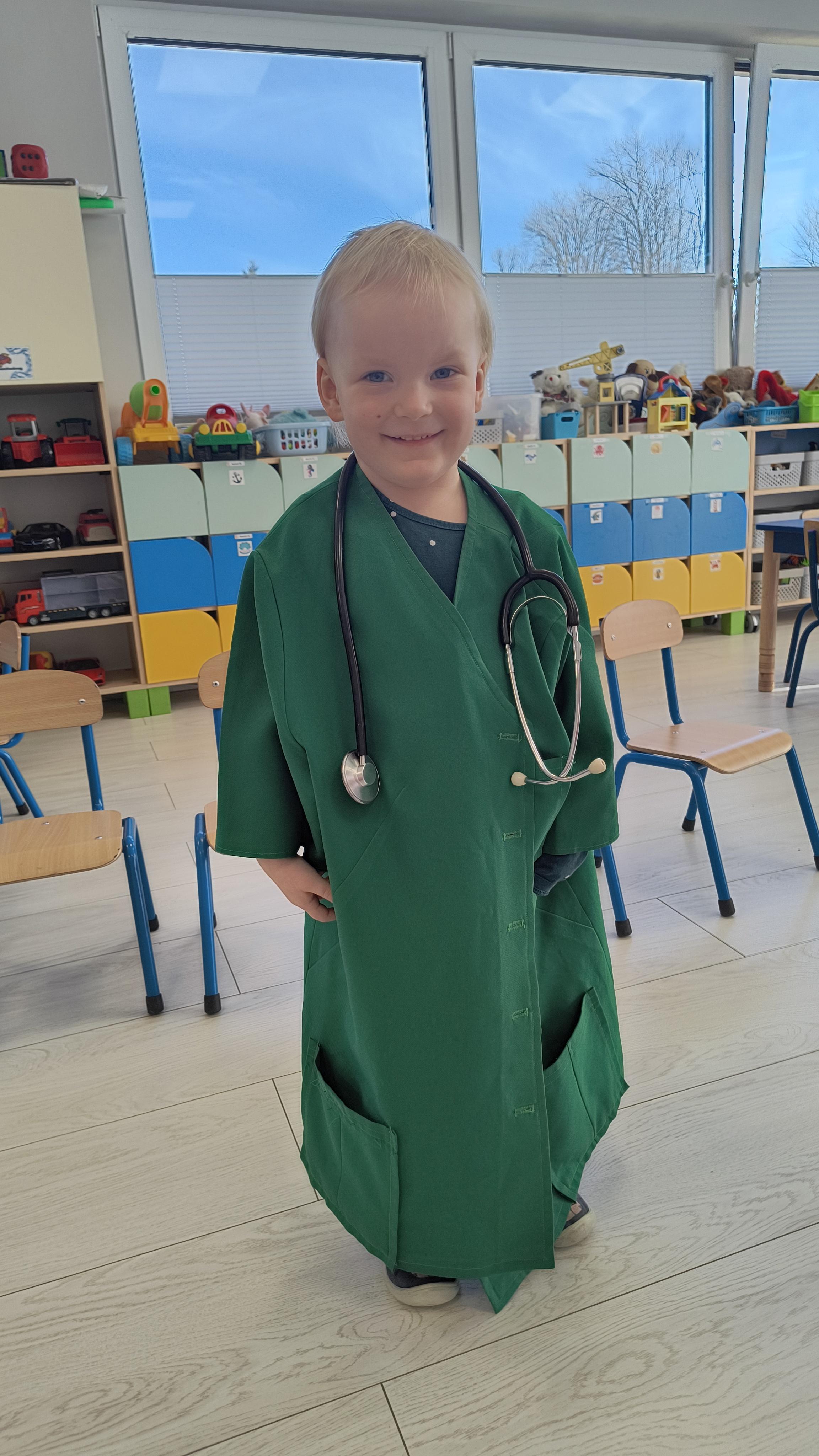 Dodatkową atrakcją była możliwość wcielenia się w rolę pielęgniarki. Każde dziecko mogło przymierzyć strój pielęgniarski, spróbować swoich sił w zakładaniu rękawiczek oraz sprawdzić poziom saturacji przy użyciu pulsoksymetru. To doświadczenie wzbudziło wiele emocji i radości!