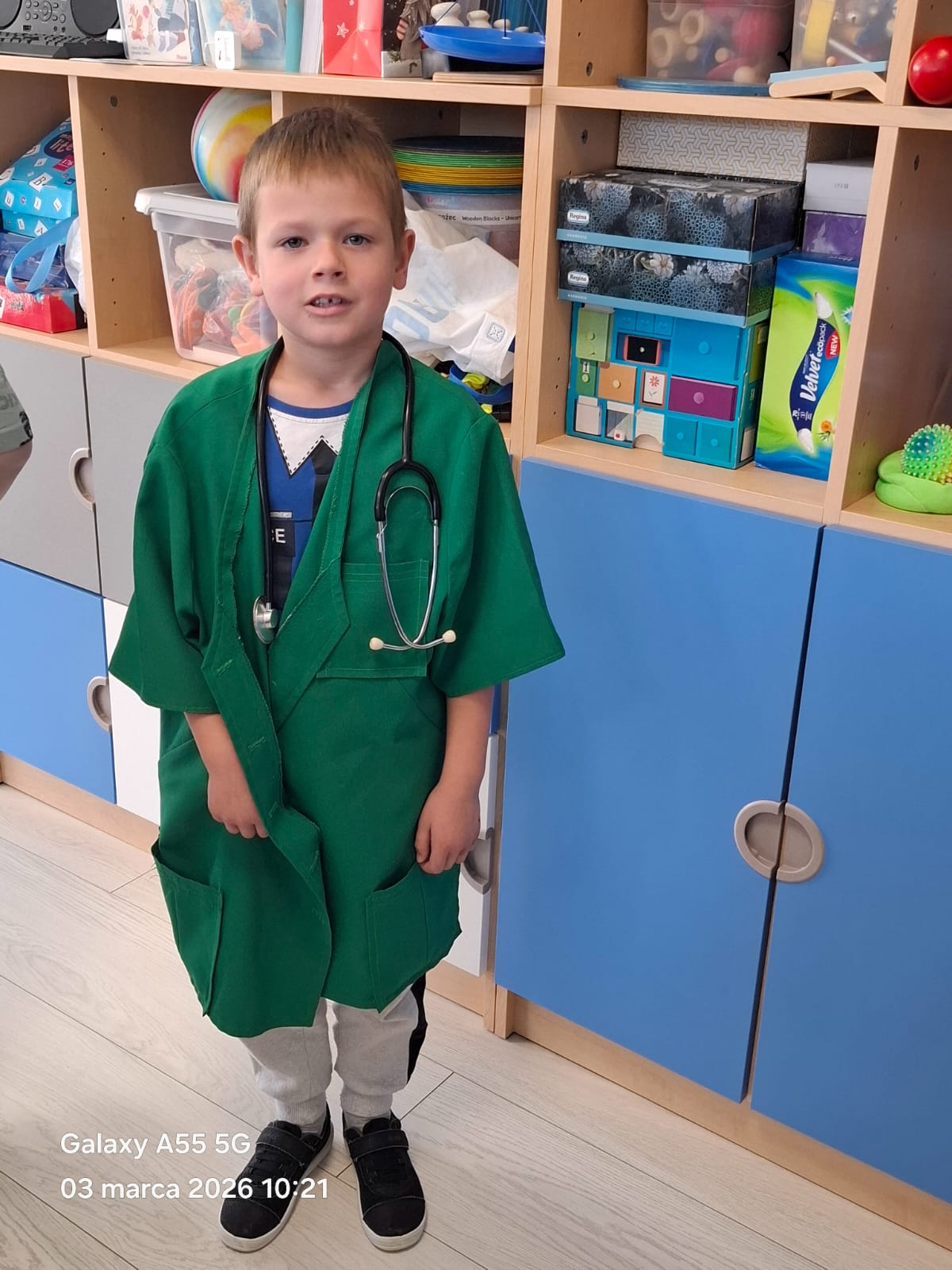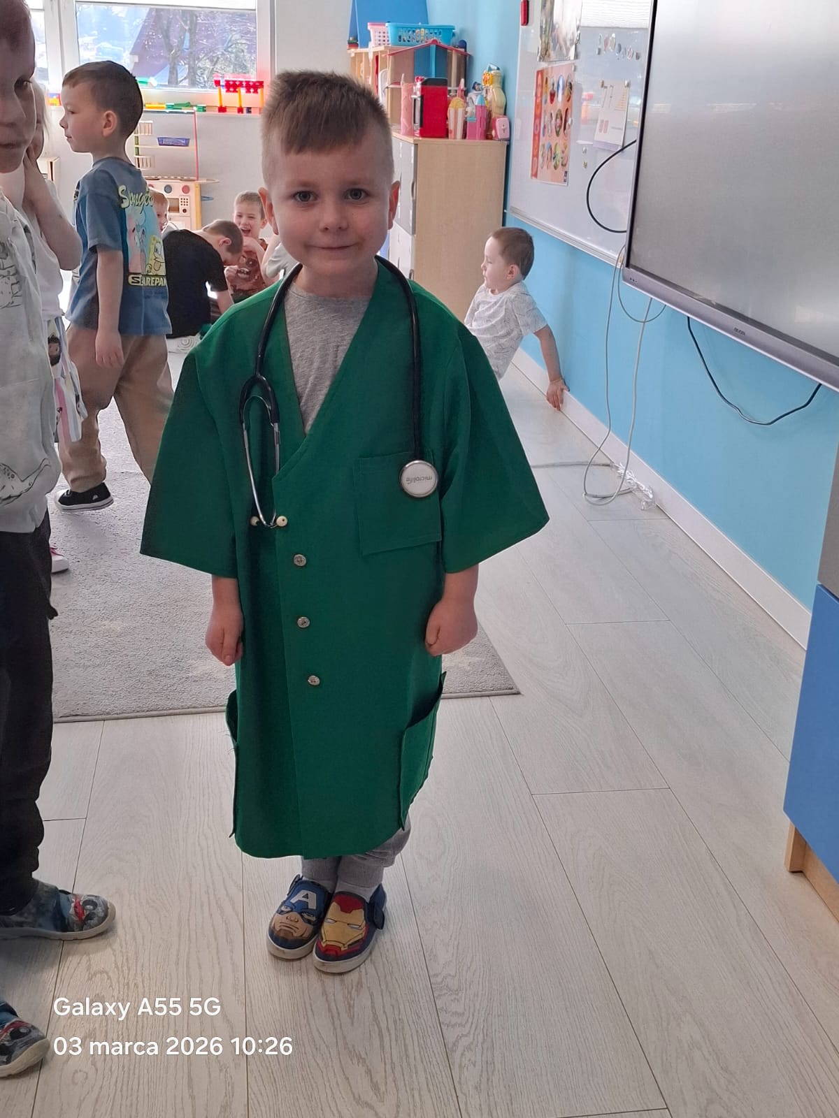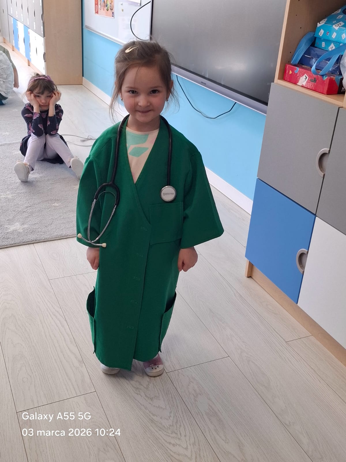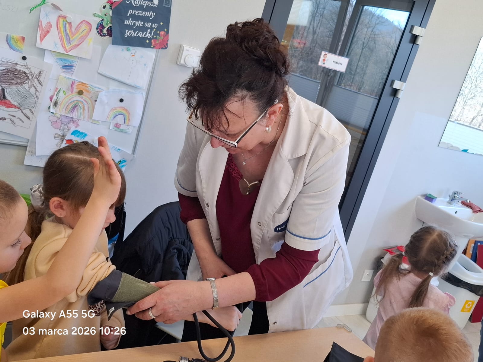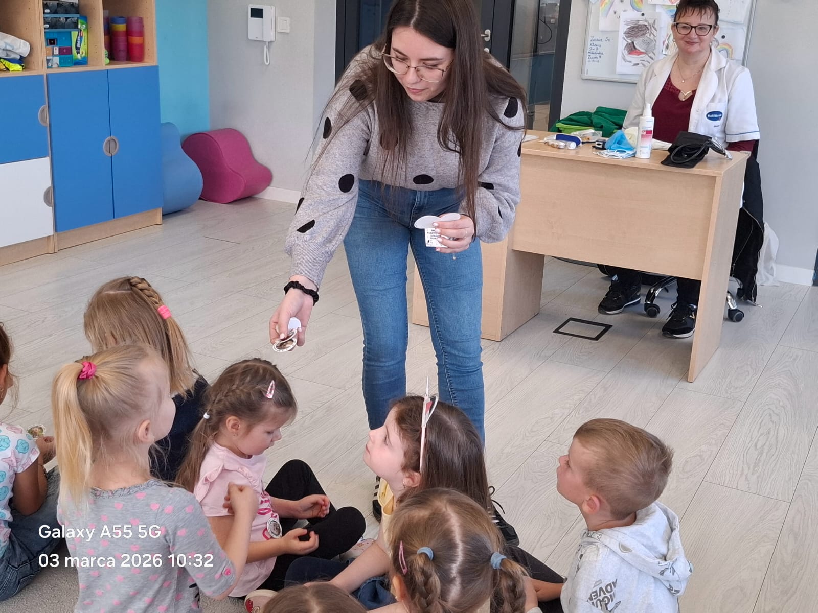 Dodatkową atrakcją była możliwość wcielenia się w rolę pielęgniarki. Każde dziecko mogło przymierzyć strój pielęgniarski, spróbować swoich sił w zakładaniu rękawiczek oraz sprawdzić poziom saturacji przy użyciu pulsoksymetru. To doświadczenie wzbudziło wiele emocji i radości!