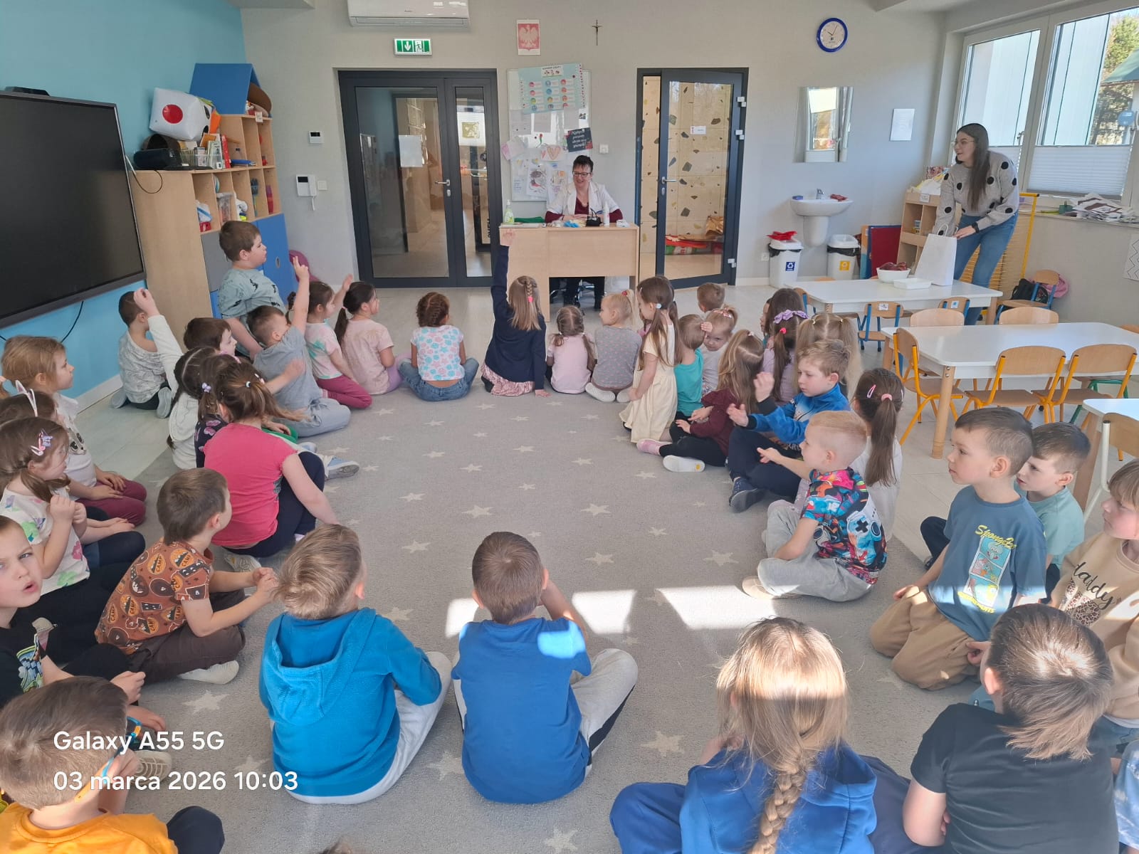 Pani Agnieszka zachęcała wszystkich do dbania o zdrowie, przypominała o higienie oraz zdrowych nawykach. Dzieci miały możliwość zadawania pytań, na które Pani Agnieszka chętnie i wyczerpująco odpowiadała.