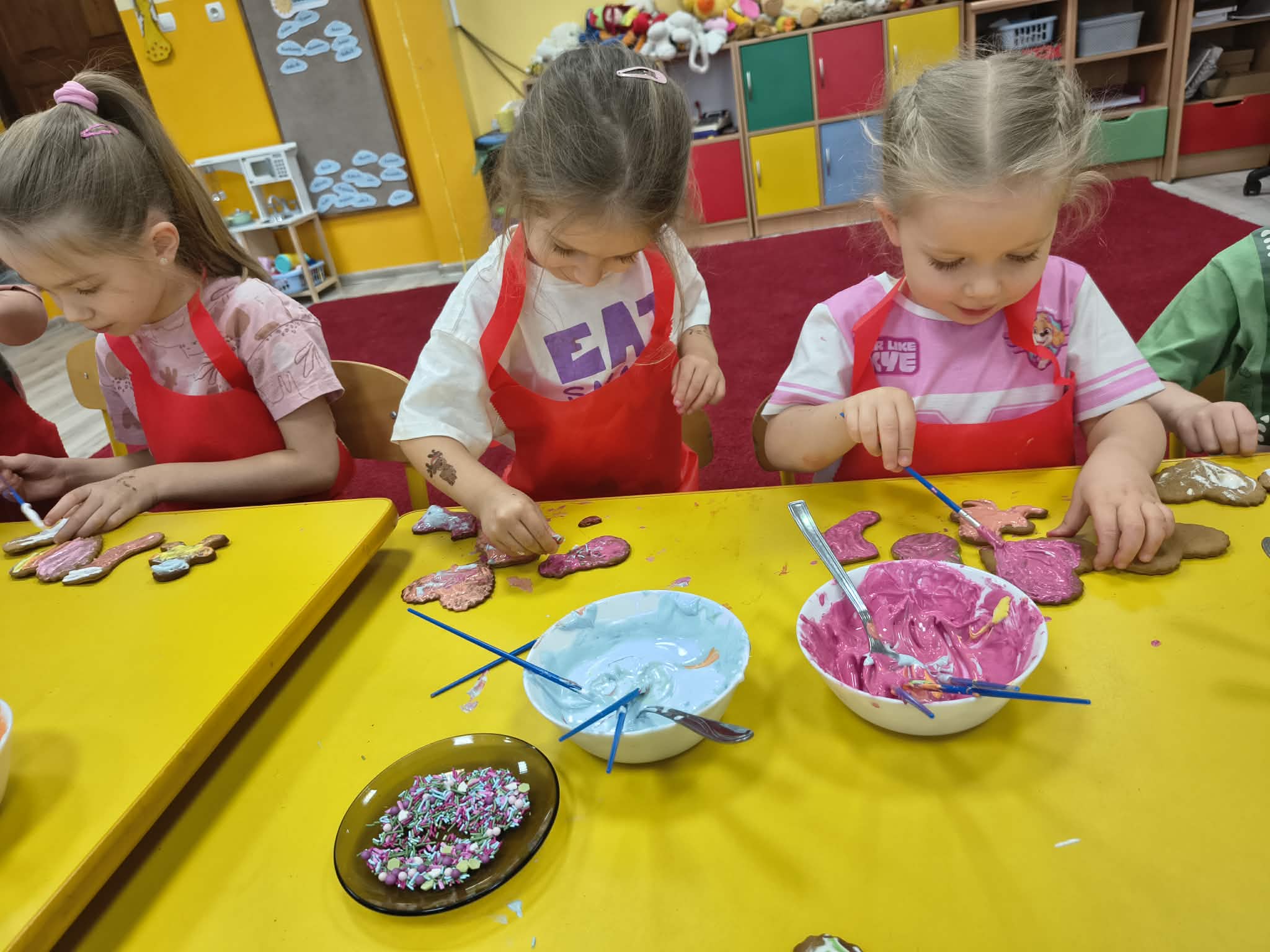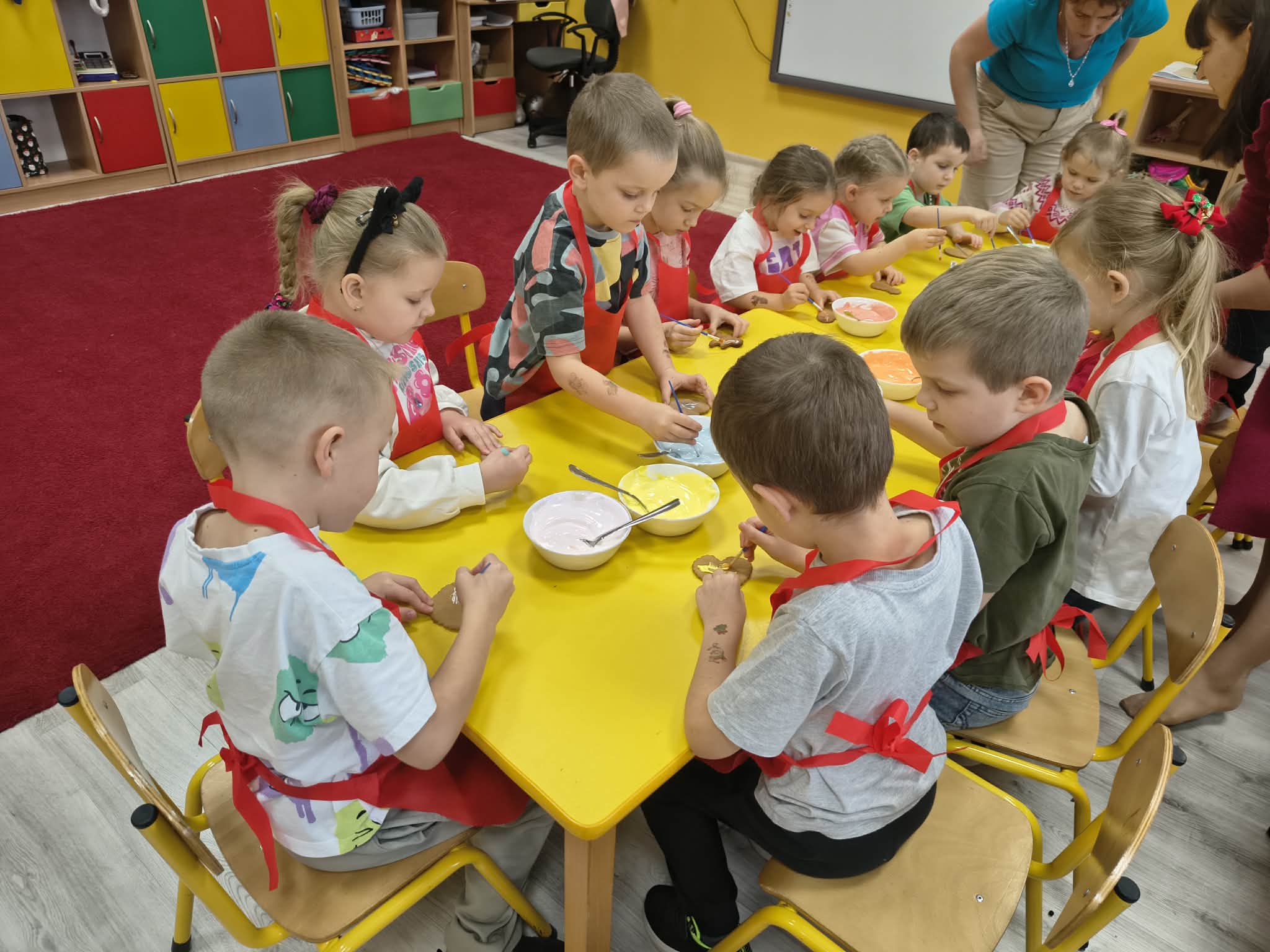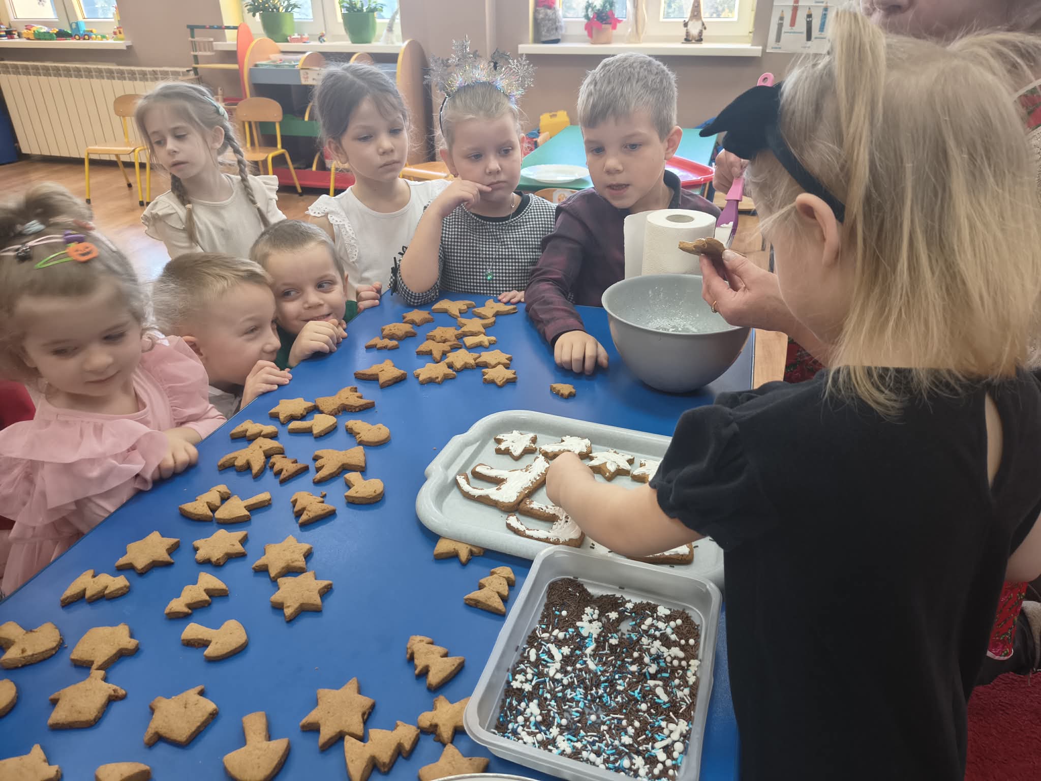 W tym wyjątkowym czasie nasze przedszkole odwiedziła również pani Klaudia oraz panie z Koła Gospodyń Wiejskich. Dzięki nim dzieci mogły zobaczyć, jak powstają tradycyjne pierniki, a także spróbować swoich sił w ich dekorowaniu. Było to niezwykle ciekawe i radosne doświadczenie, które sprawiło dzieciom wiele radości.