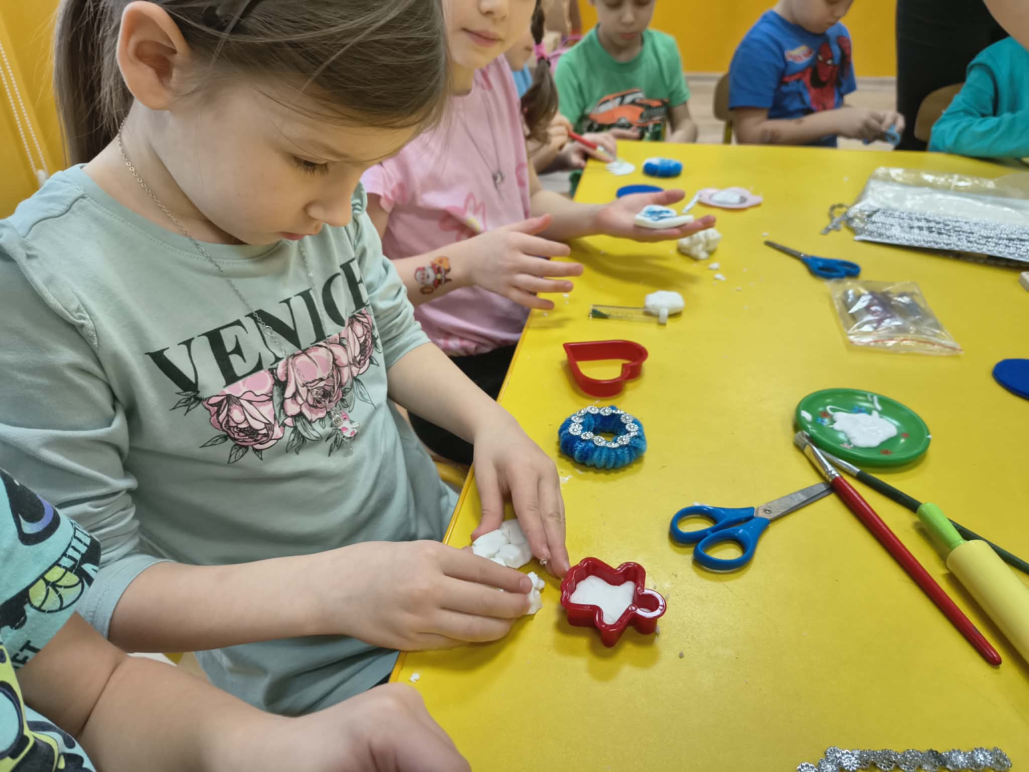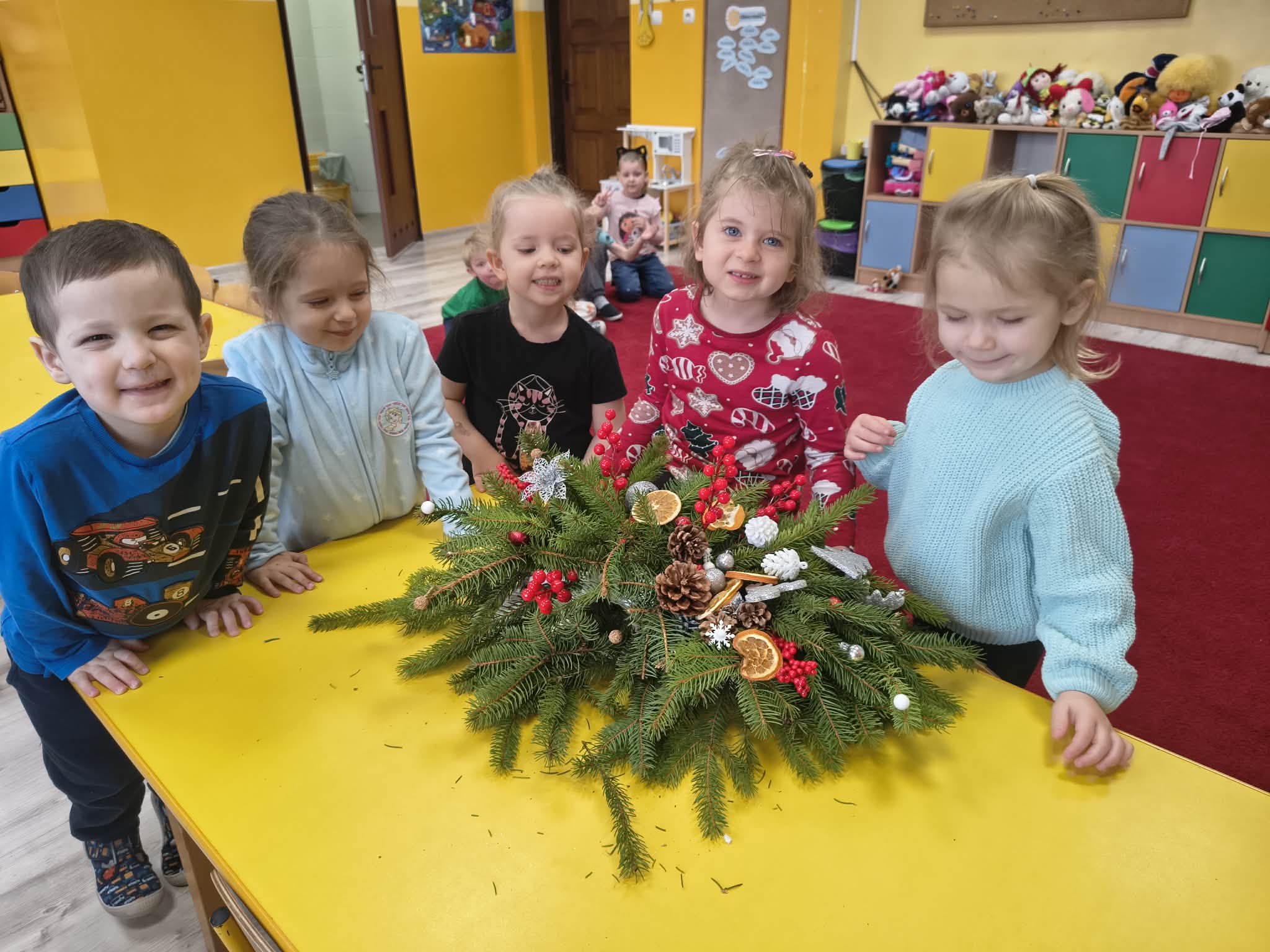 Dzieci samodzielnie wykonywały piękne ozdoby choinkowe z drucików, masy porcelanowej oraz innych różnorodnych materiałów. Każda dekoracja była wyjątkowa i wykonana z wielkim sercem. Następnie przedszkolaki stworzyły stroiki na stół wigilijny, które zachwycały pomysłowością i świątecznym urokiem.