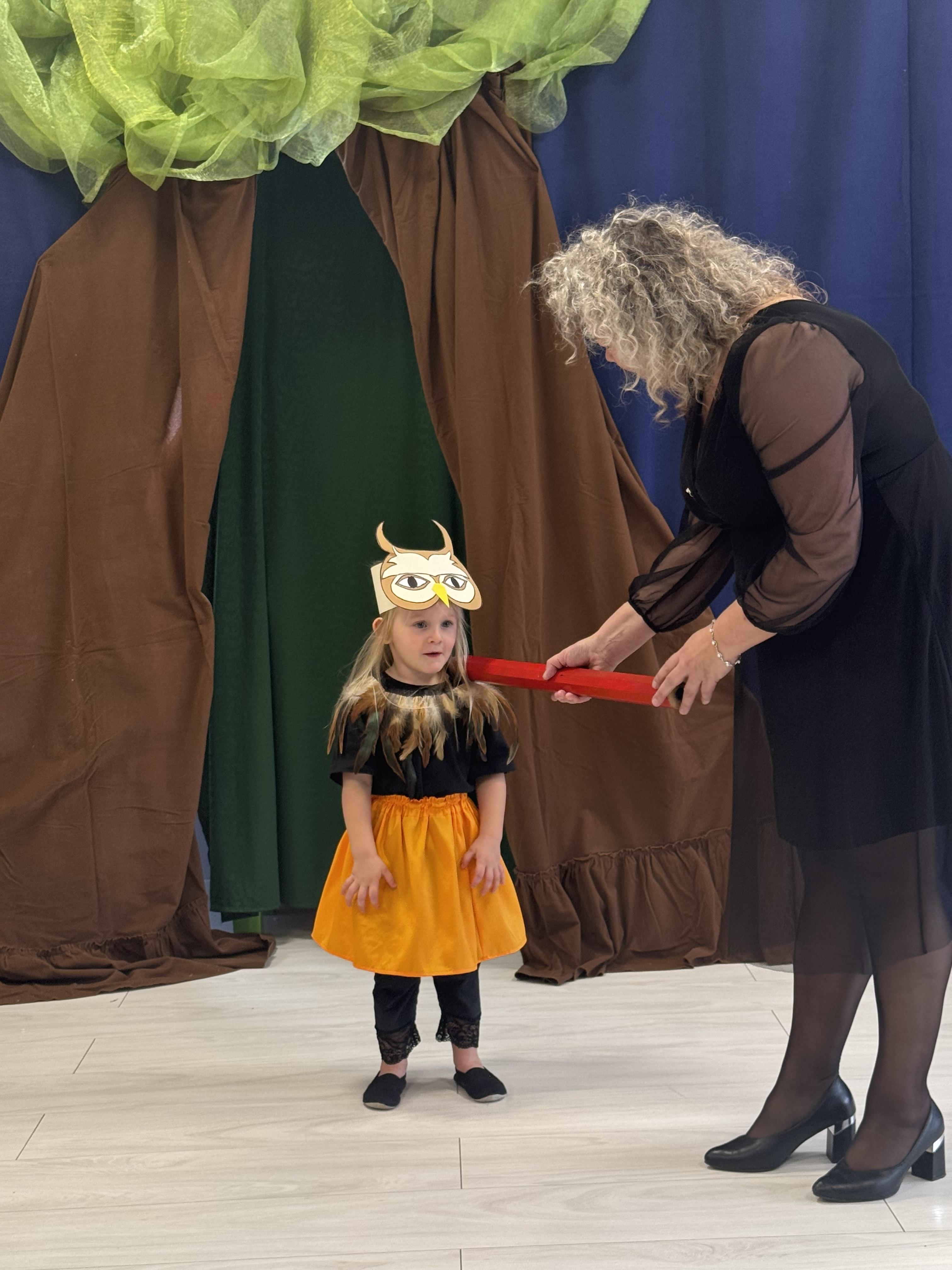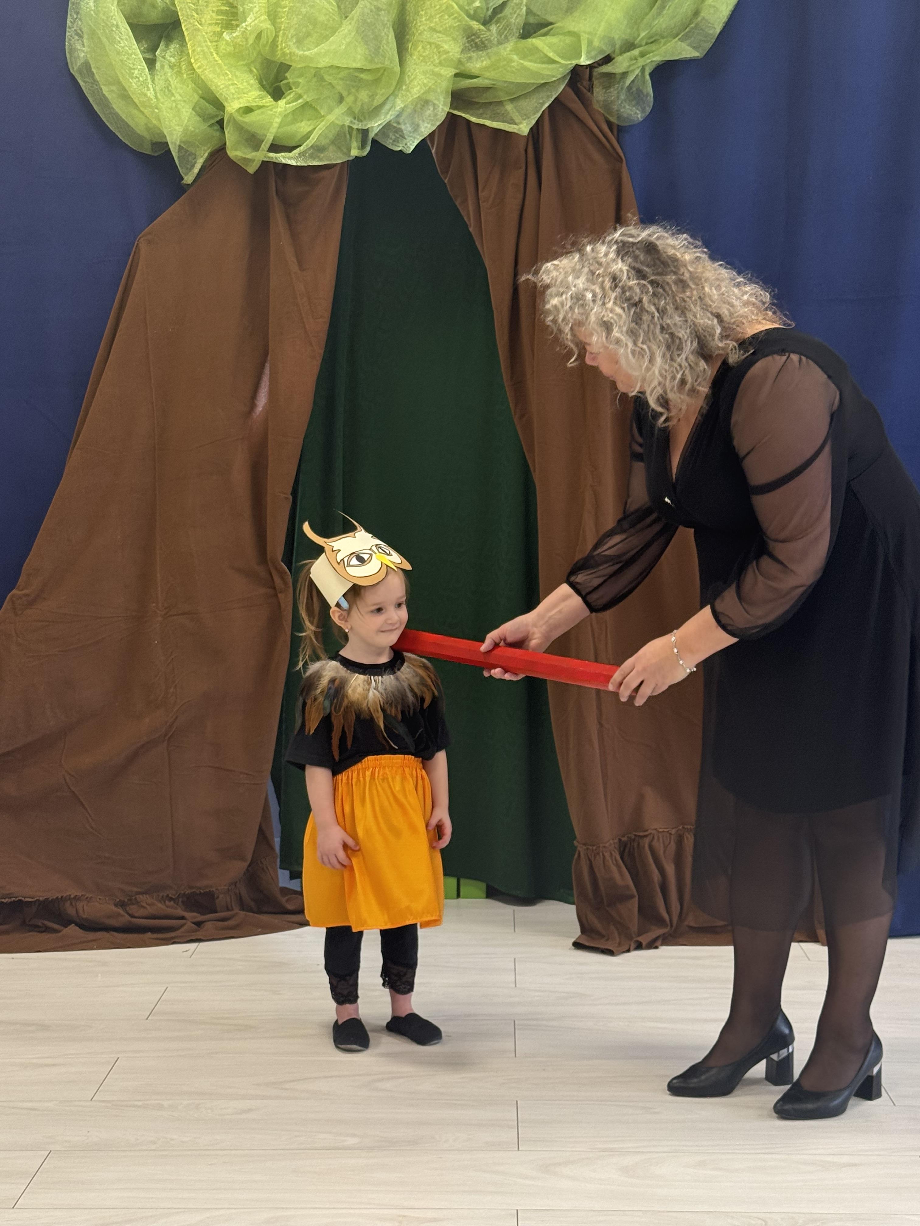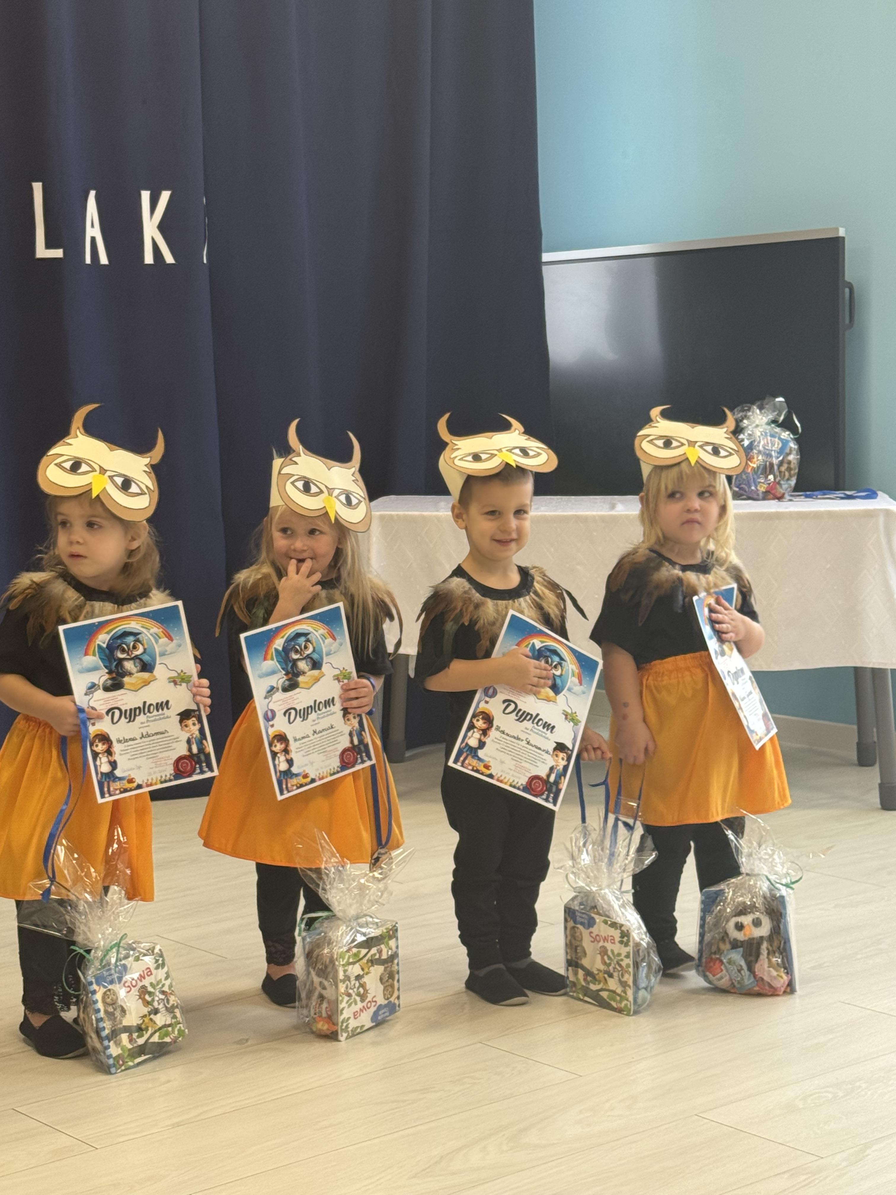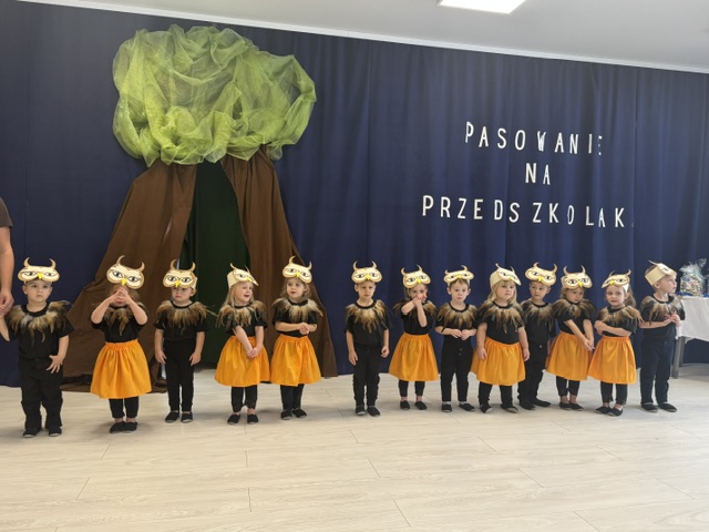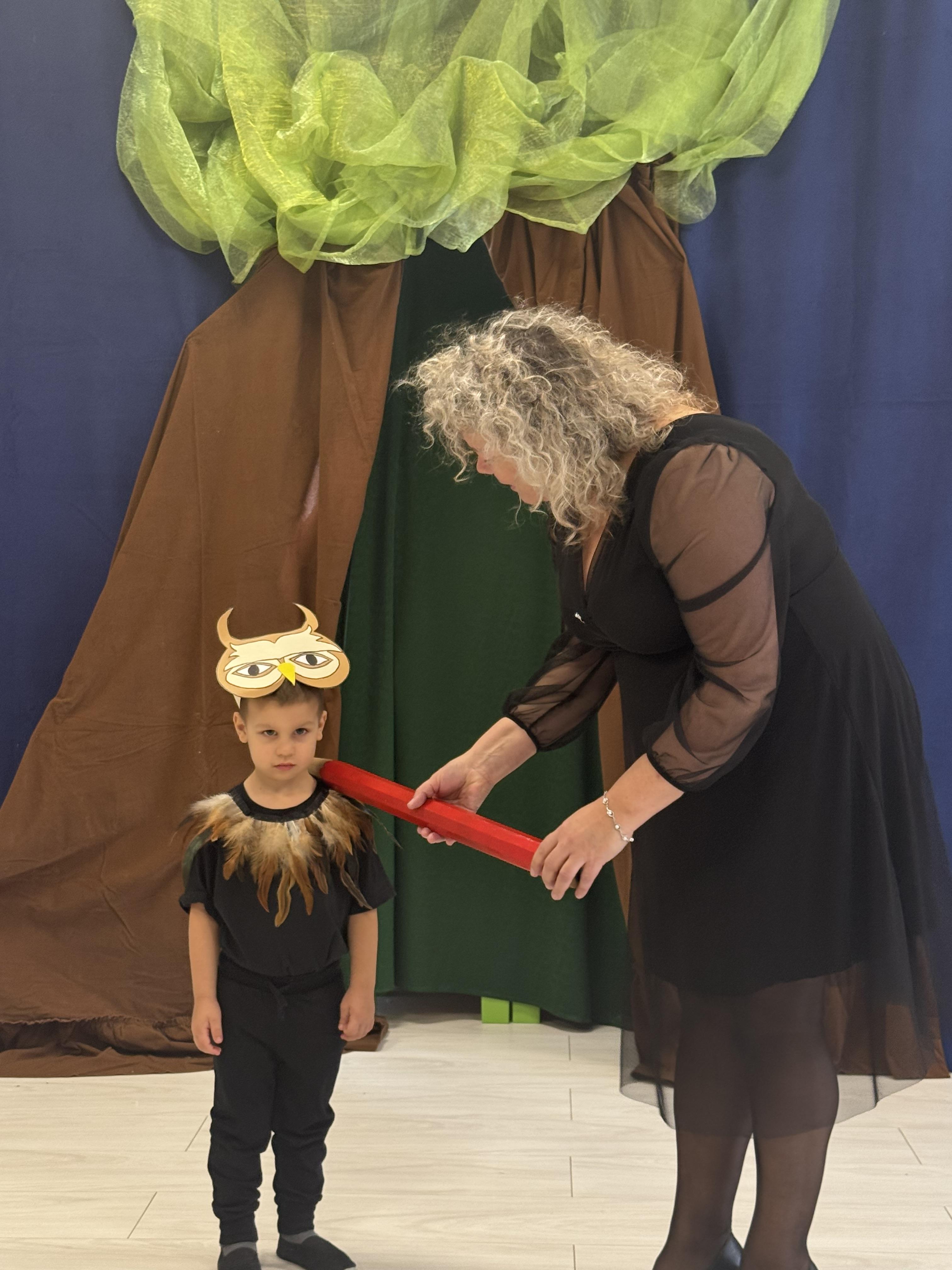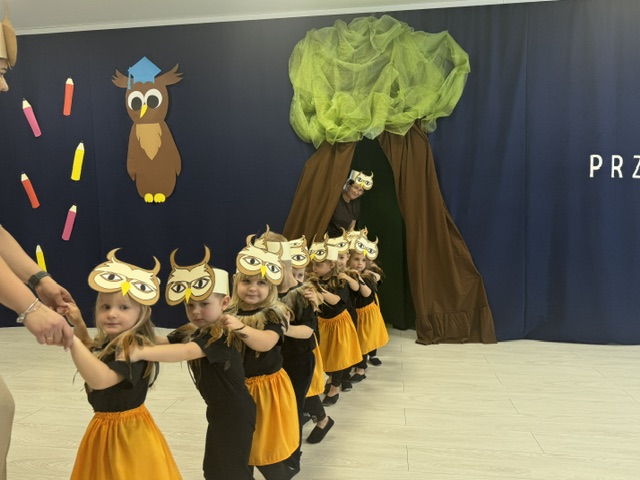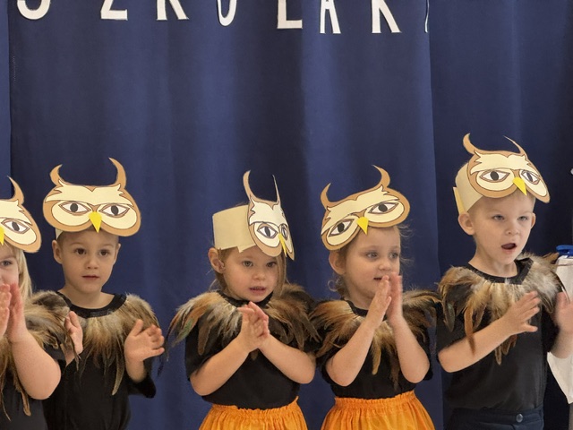 Dzieci, ubrane w piękne stroje sowy, z ogromnym zaangażowaniem zaśpiewały piosenki o sowie i jesieni, a także zaprezentowały krótkie wierszyki. Nie zabrakło również muzycznych akcentów – przedszkolaki z dumą wykonały rytmiczny występ z użyciem kubeczków.
