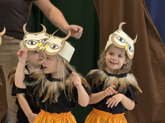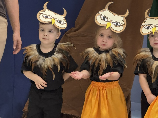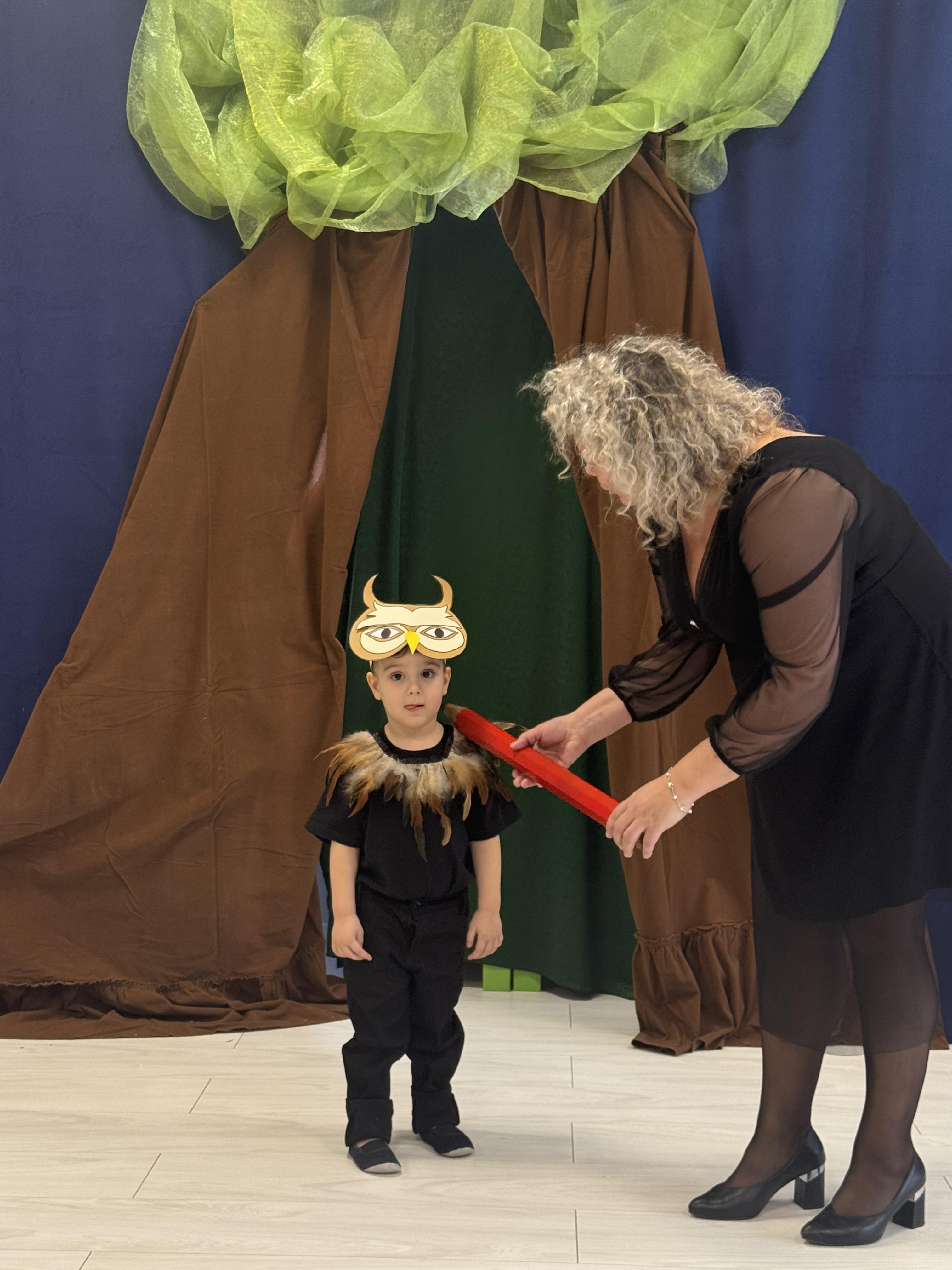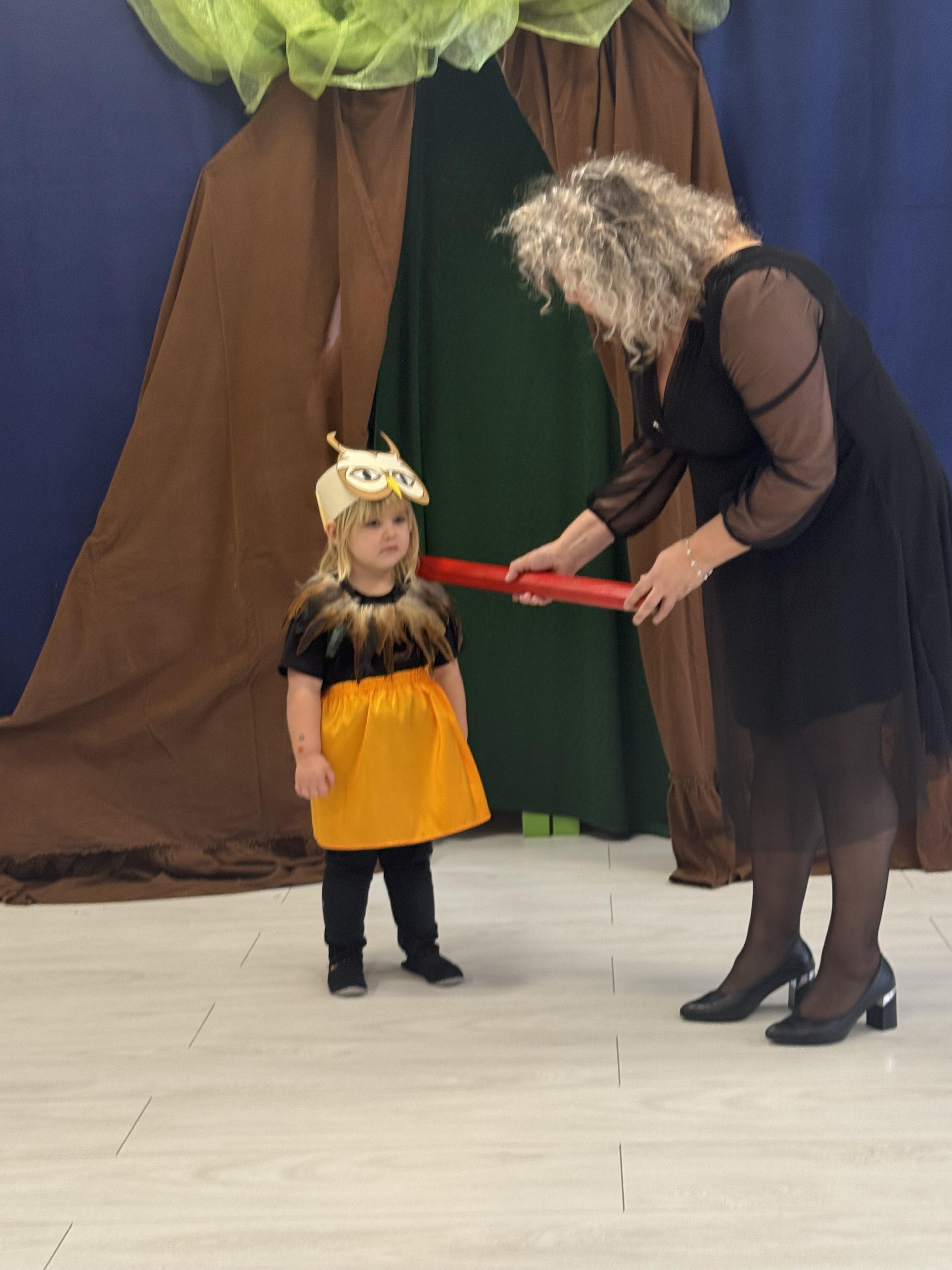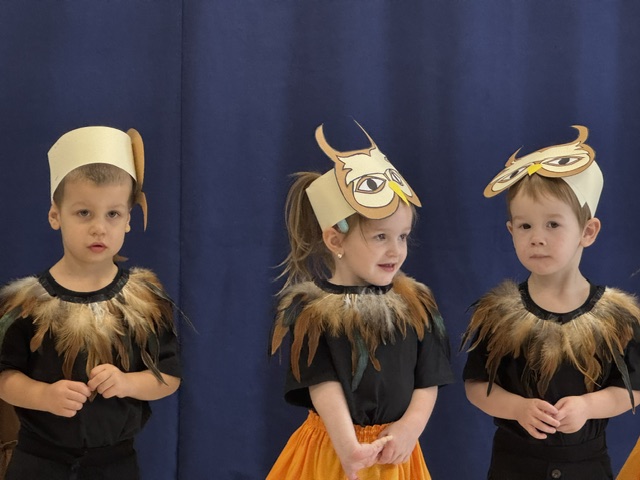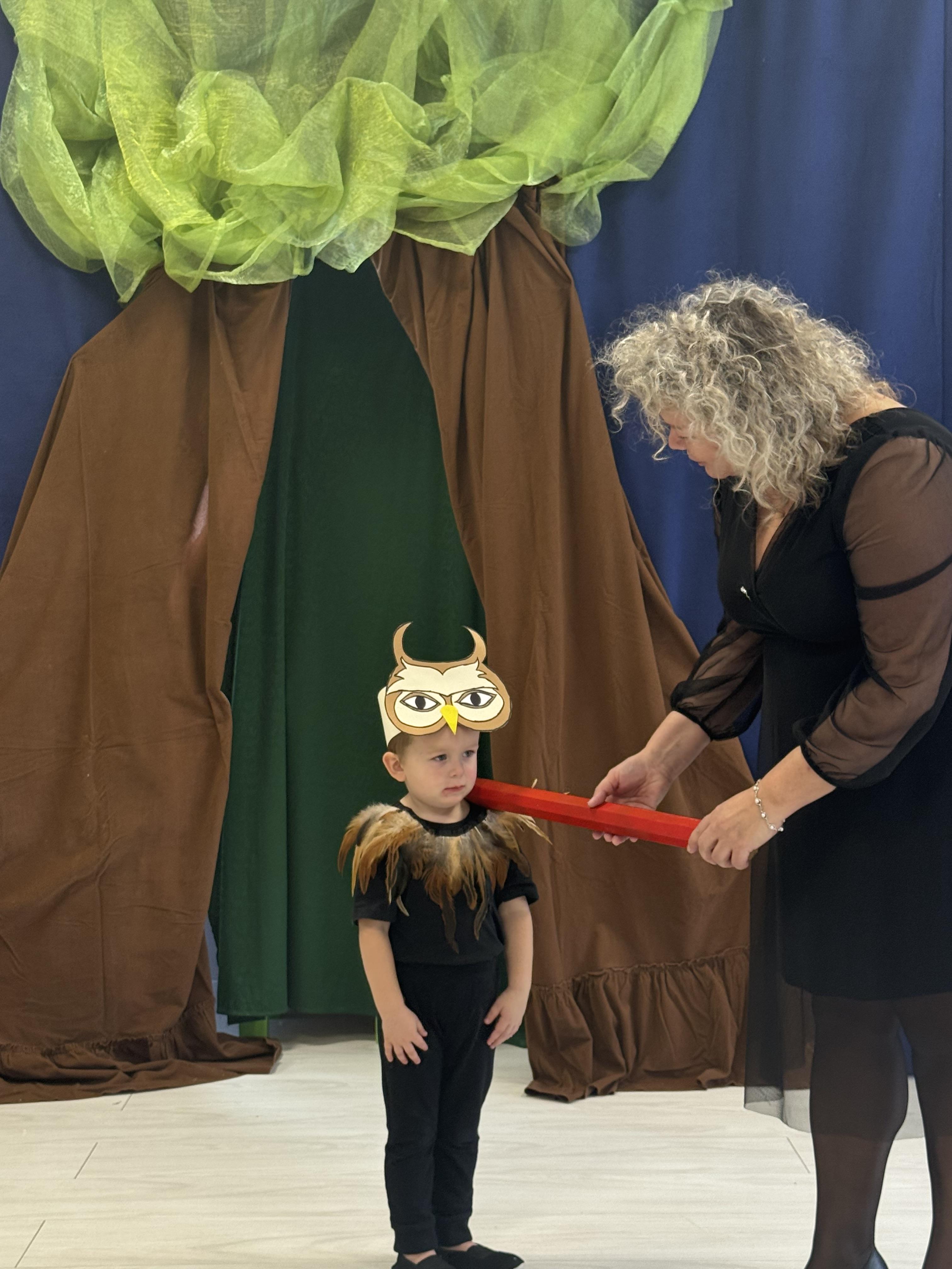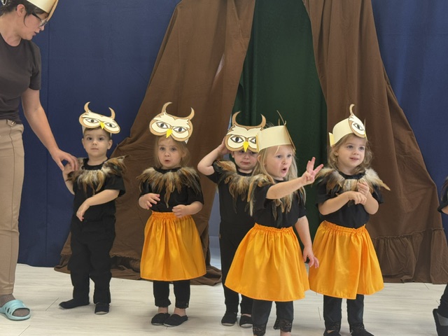 Dzieci, ubrane w piękne stroje sowy, z ogromnym zaangażowaniem zaśpiewały piosenki o sowie i jesieni, a także zaprezentowały krótkie wierszyki. Nie zabrakło również muzycznych akcentów – przedszkolaki z dumą wykonały rytmiczny występ z użyciem kubeczków.