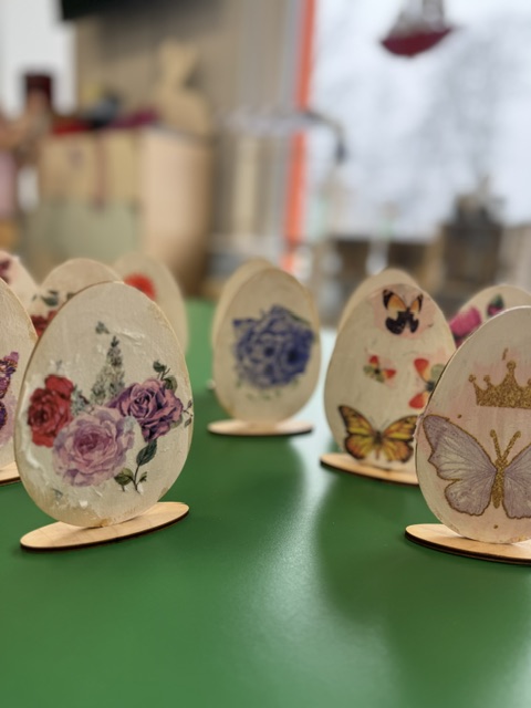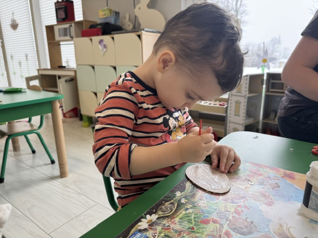Podczas zajęć przedszkolaki z ogromnym zaangażowaniem wyklejały drewniane jajka wielkanocne, wykorzystując barwne, wiosenne elementy wycięte z serwetek. Kolorowe kwiaty, motyle i inne motywy wprowadziły wszystkich w radosny, świąteczny nastrój.