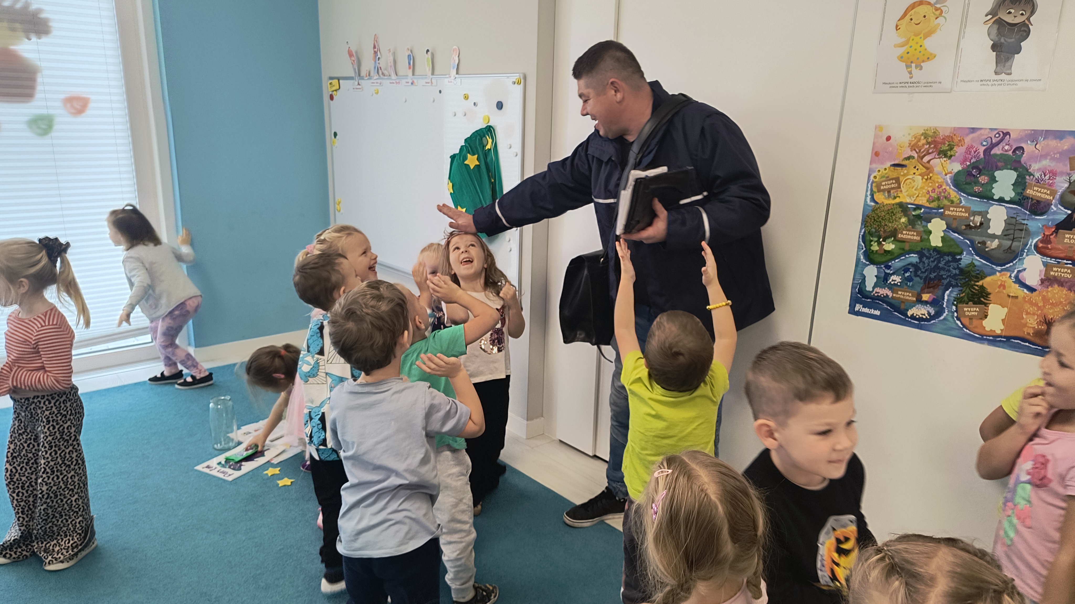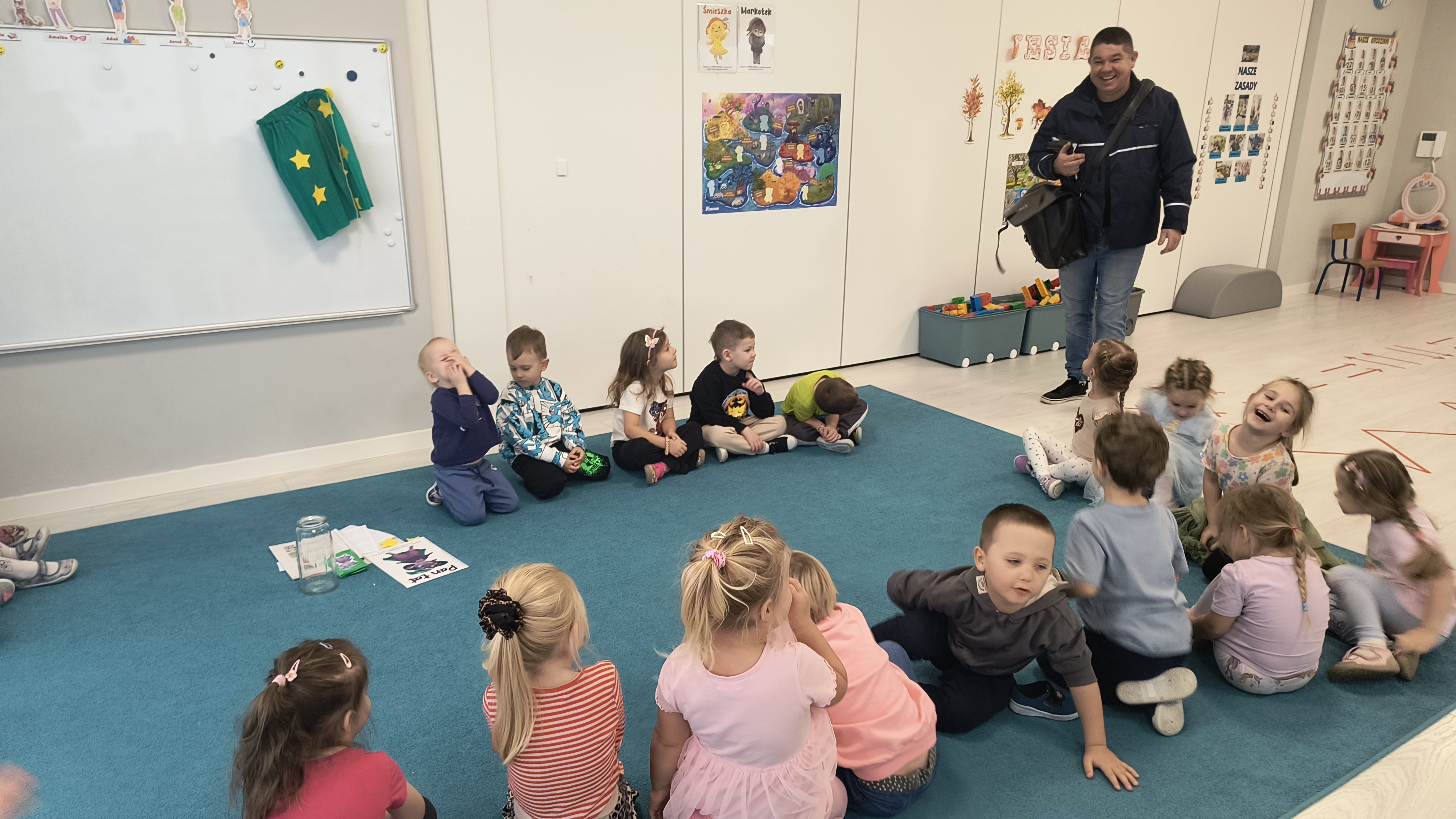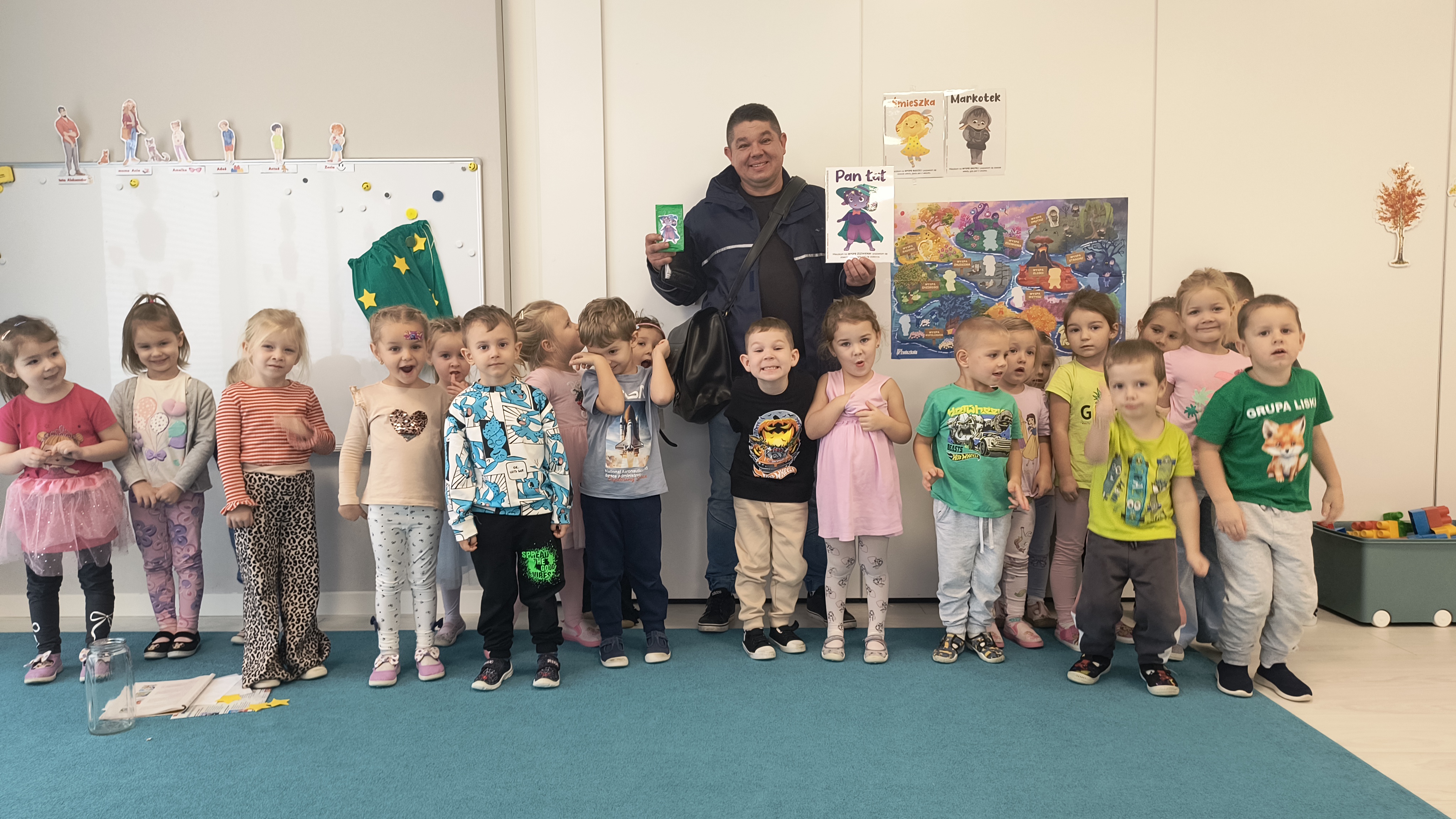 Przedszkolaki mogły z bliska obejrzeć prawdziwą torbę listonosza, a nawet sprawdzić, ile waży, kiedy jest pełna przesyłek. Największe emocje wśród 4-latków, wzbudziła jednak wyjątkowa paczka, którą Pan Sławek przyniósł od ,,Pana Łał" – była to przesyłka w ramach projektu edukacyjnego „Czuciaki w krainie emocji”.