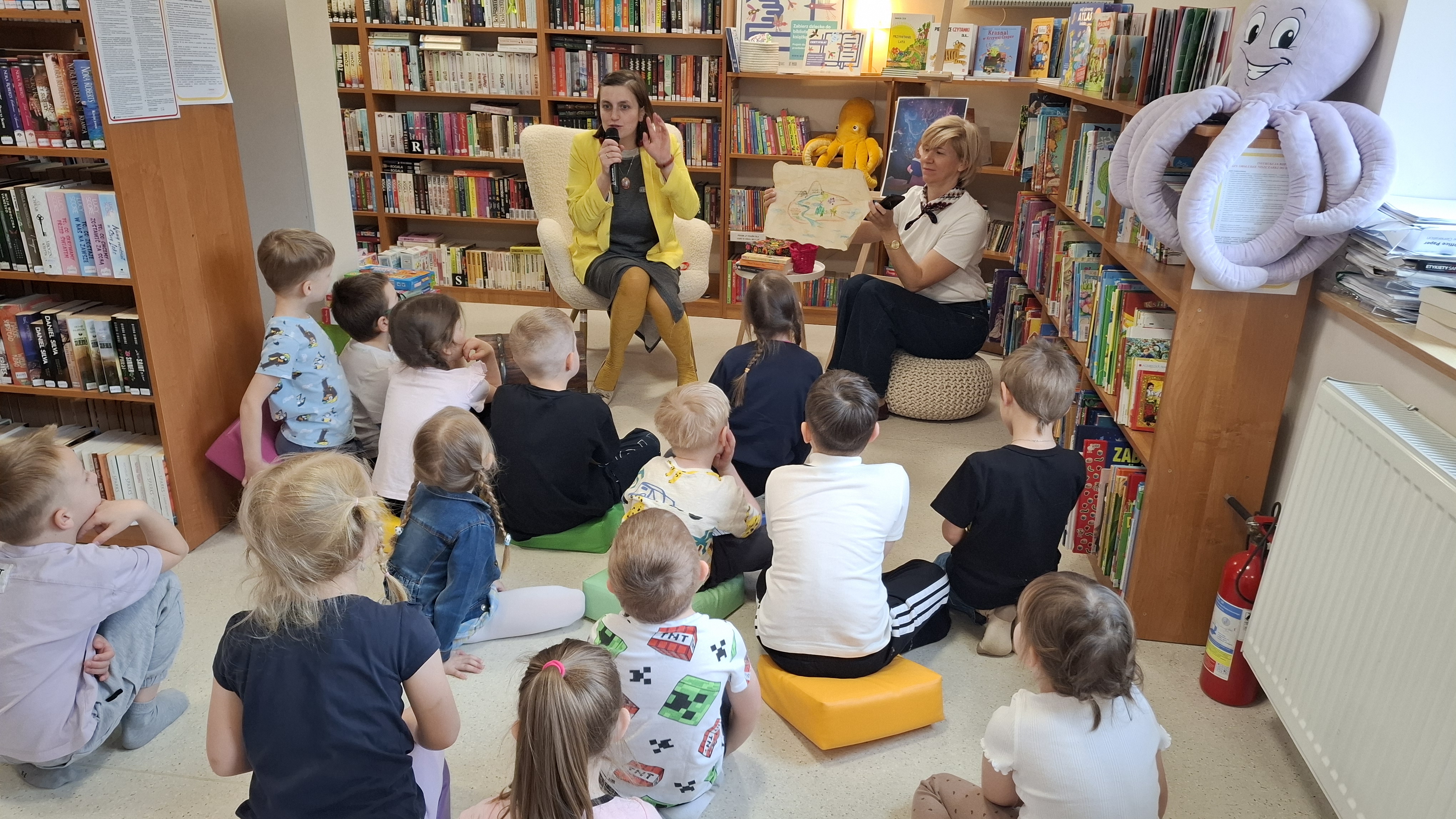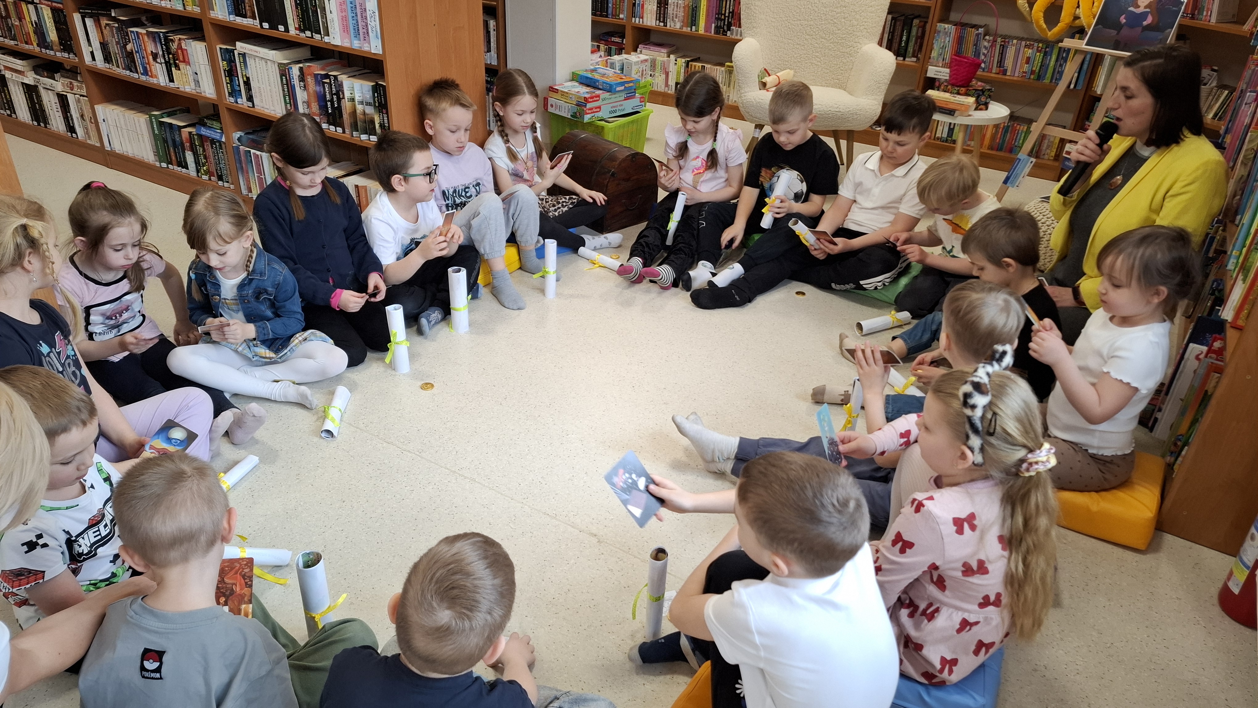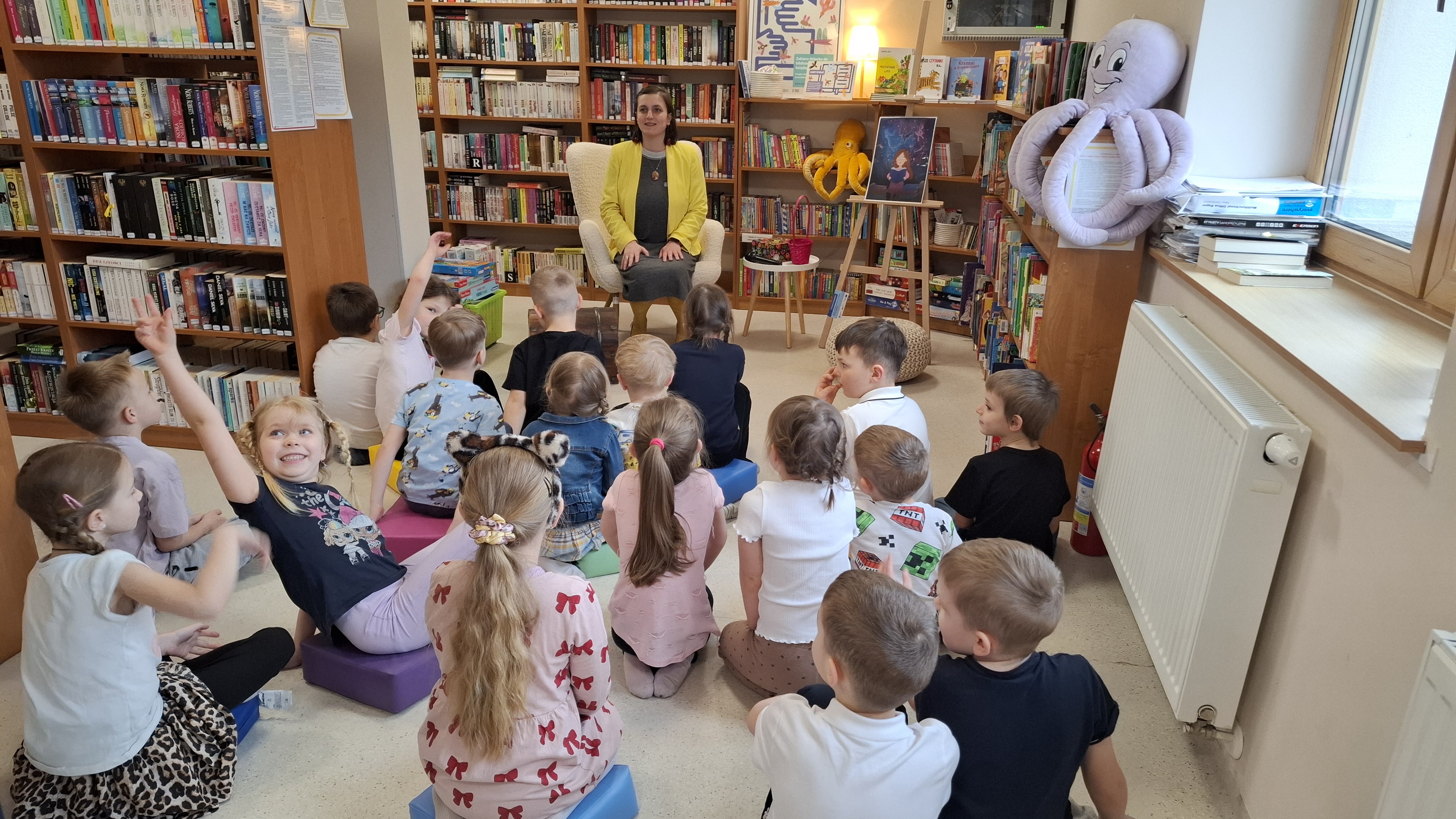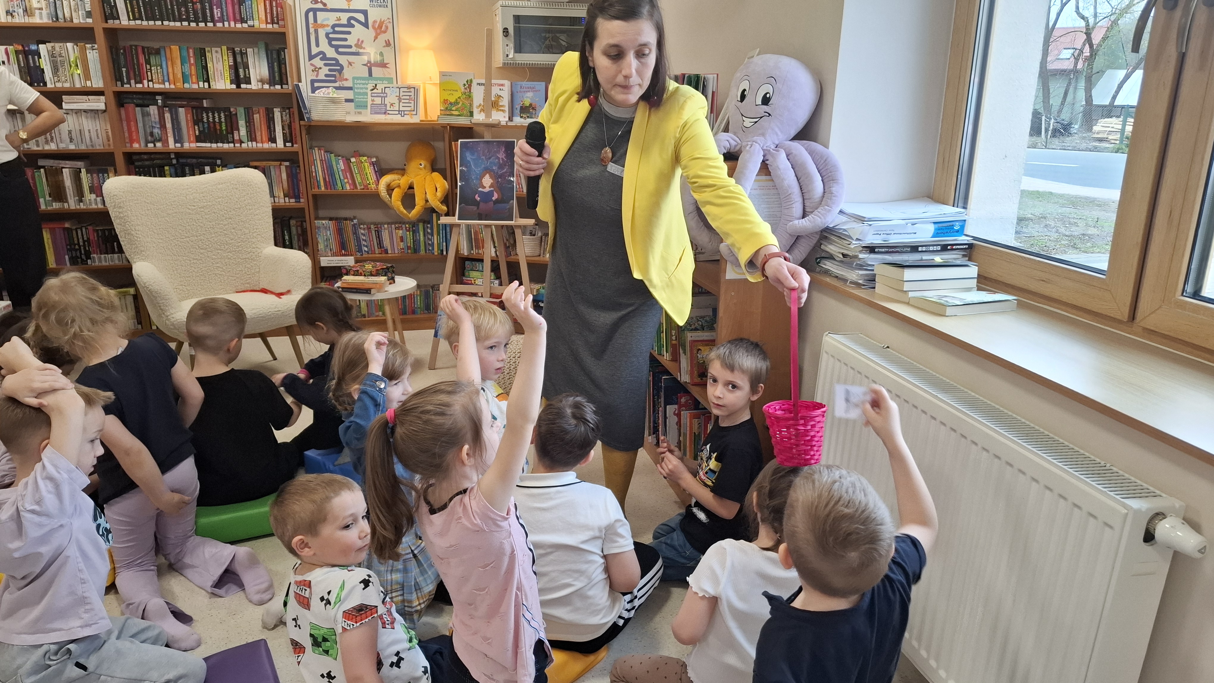W dniu 8.04.2026r. grupa 5,6-latków miała okazję uczestniczyć w spotkaniu z panią Ewą Mielczarek - pisarką w Gminnej Bibliotece Publicznej w Ślemieniu. Dzieci tworzyły własne opowieści z wylosowanych ilustracji. Wysłuchały bajkę autorki książki pt. "Laura i magiczne miejsce ". Następnie wśród książek szukały magicznych listów i złotych monet. Na koniec spotkania przedszkolaki skorzystały z dmuchańca. Dziękujemy pani Ani Zyzańskiej-Pietraszko z Biblioteki w Ślemieniu oraz pani Ewie Mielczarek za ciekawe zajęcia.