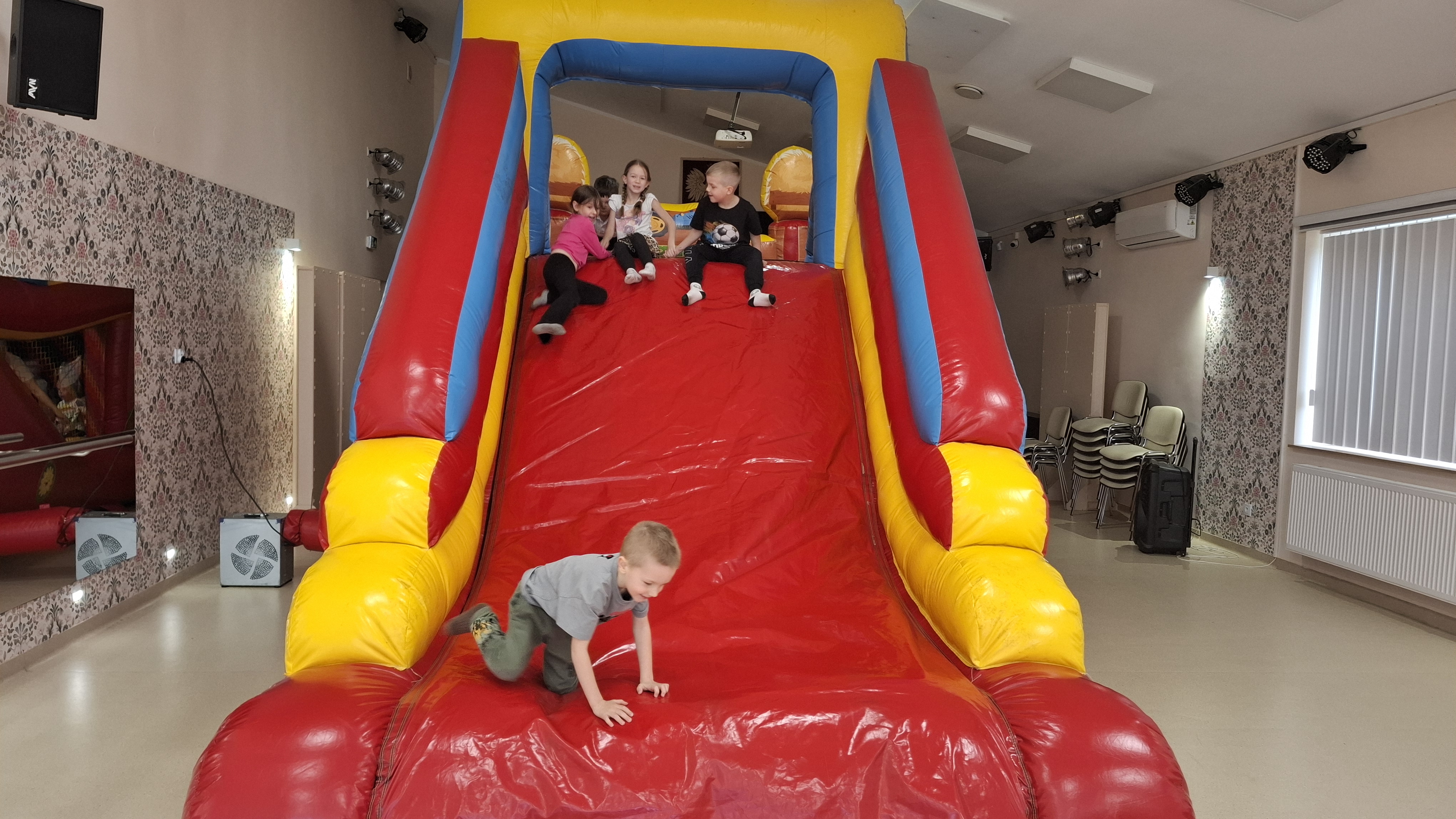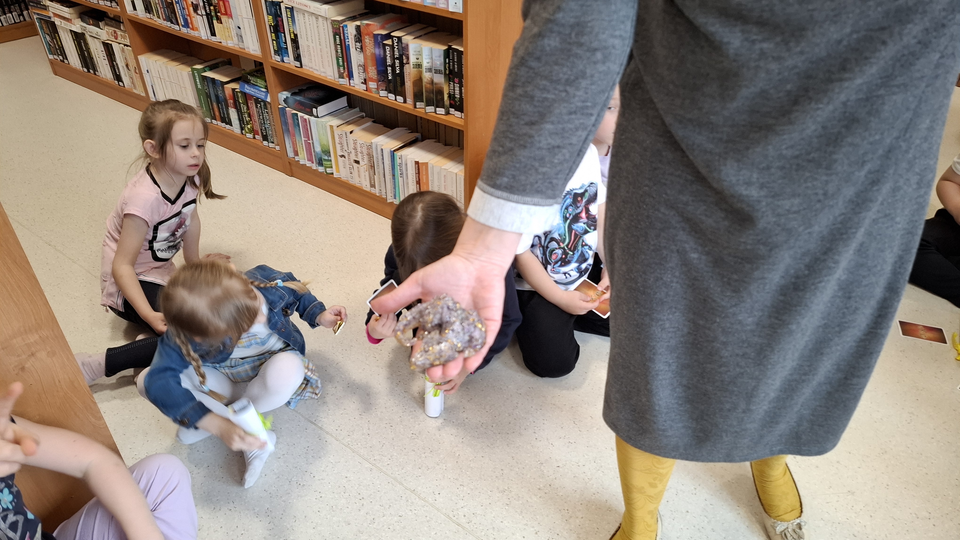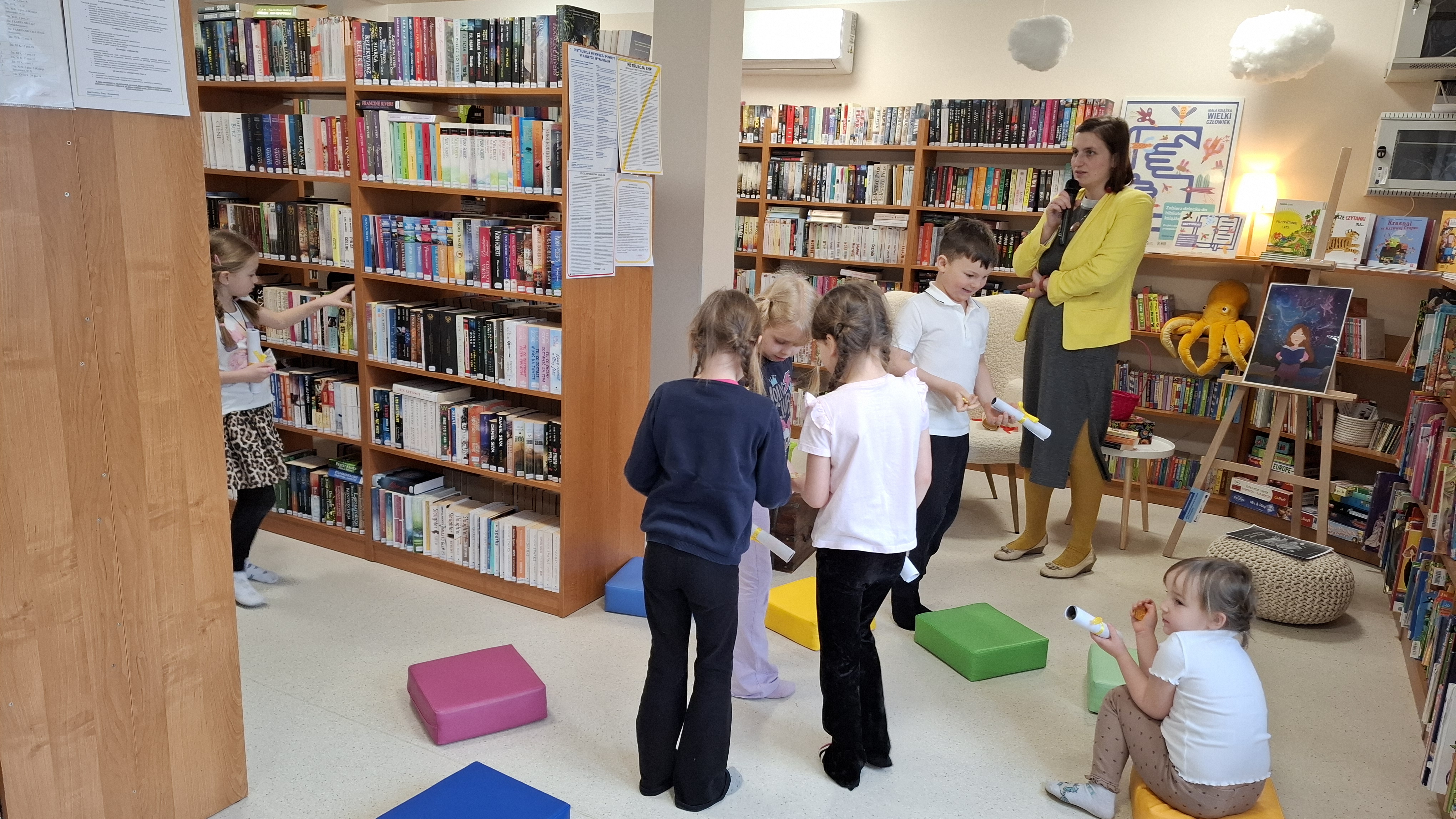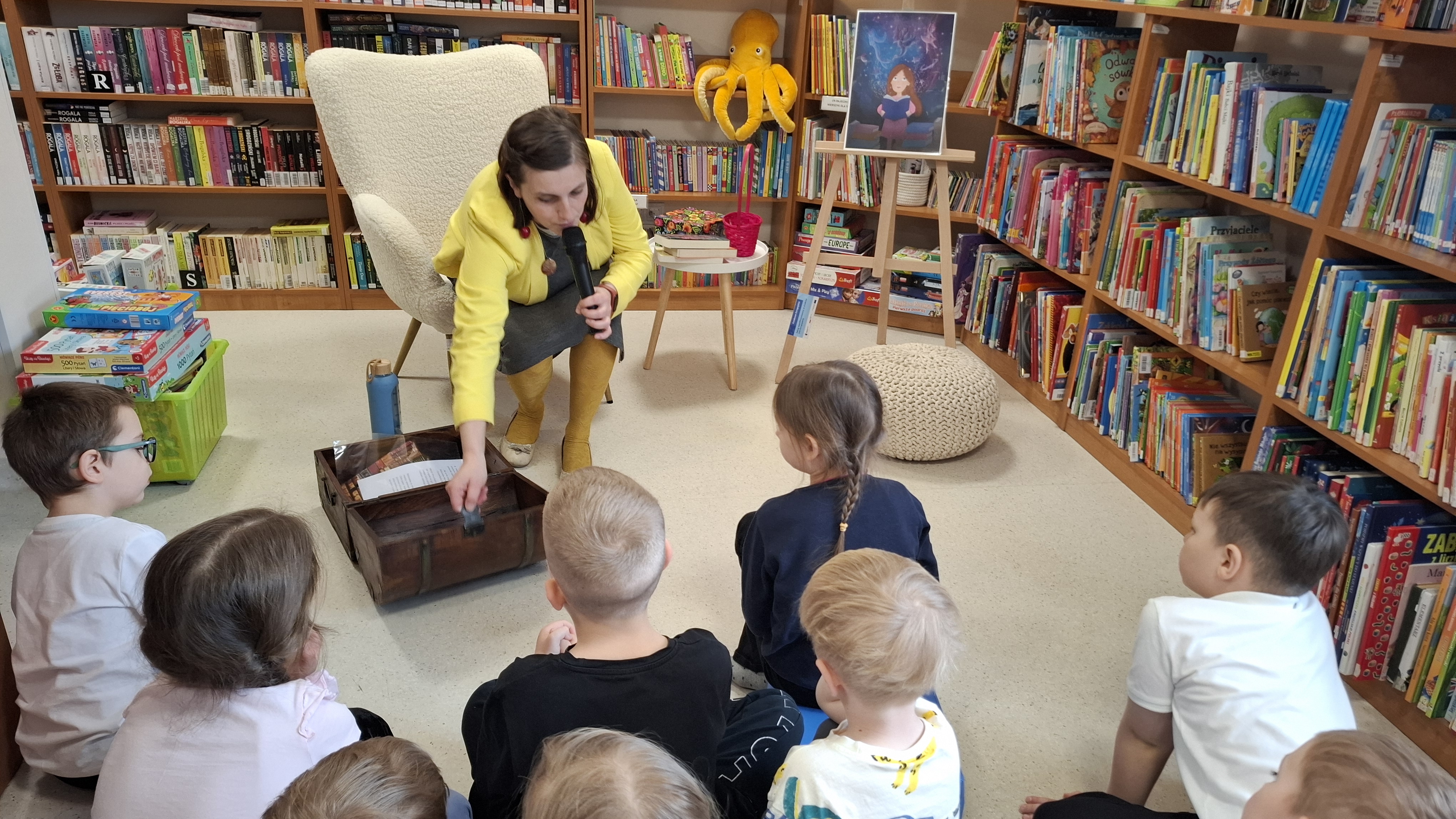 W dniu 8.04.2026r. grupa 5,6-latków miała okazję uczestniczyć w spotkaniu z panią Ewą Mielczarek - pisarką w Gminnej Bibliotece Publicznej w Ślemieniu. Dzieci tworzyły własne opowieści z wylosowanych ilustracji. Wysłuchały bajkę autorki książki pt. "Laura i magiczne miejsce ". Następnie wśród książek szukały magicznych listów i złotych monet. Na koniec spotkania przedszkolaki skorzystały z dmuchańca. Dziękujemy pani Ani Zyzańskiej-Pietraszko z Biblioteki w Ślemieniu oraz pani Ewie Mielczarek za ciekawe zajęcia.