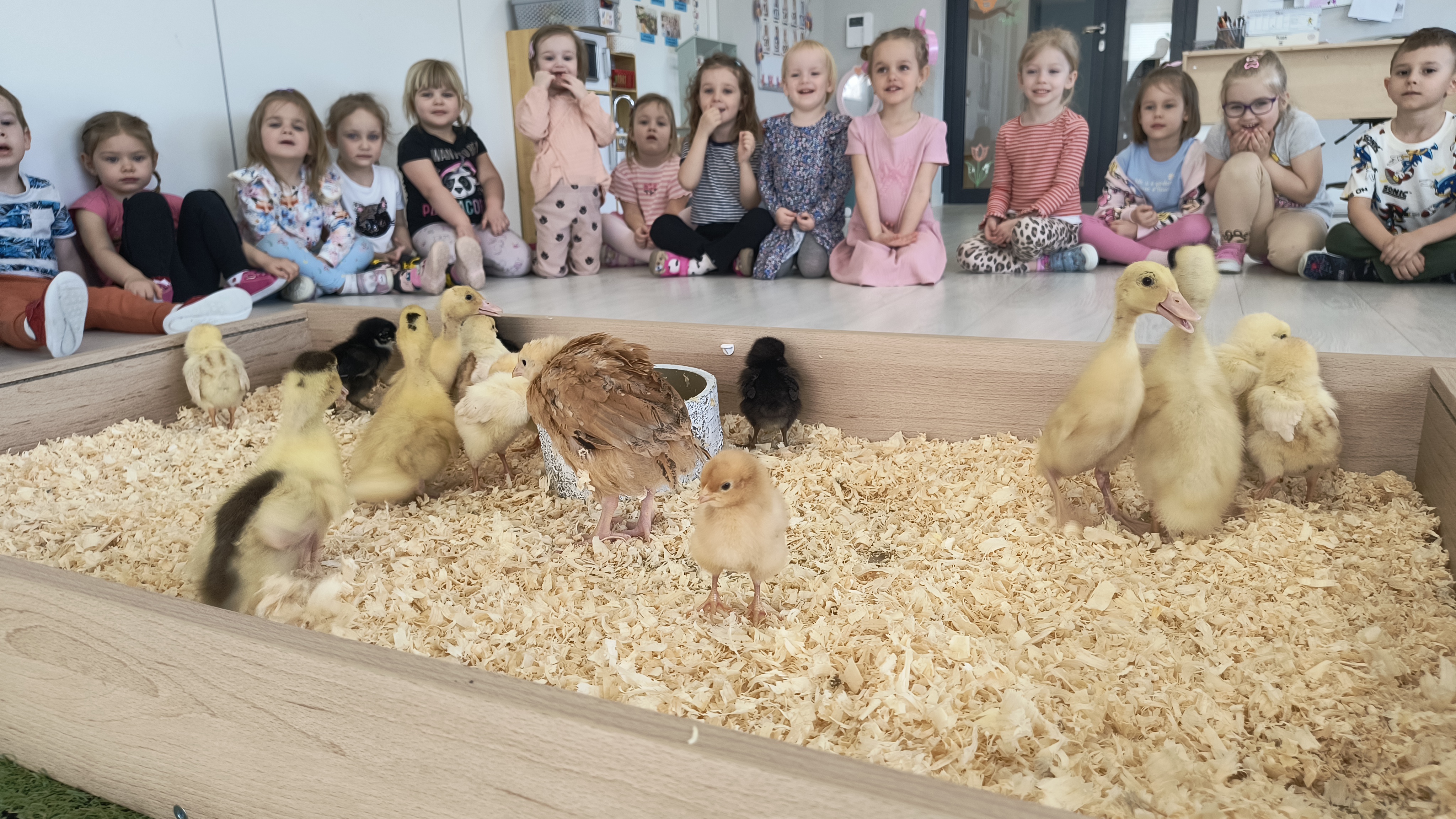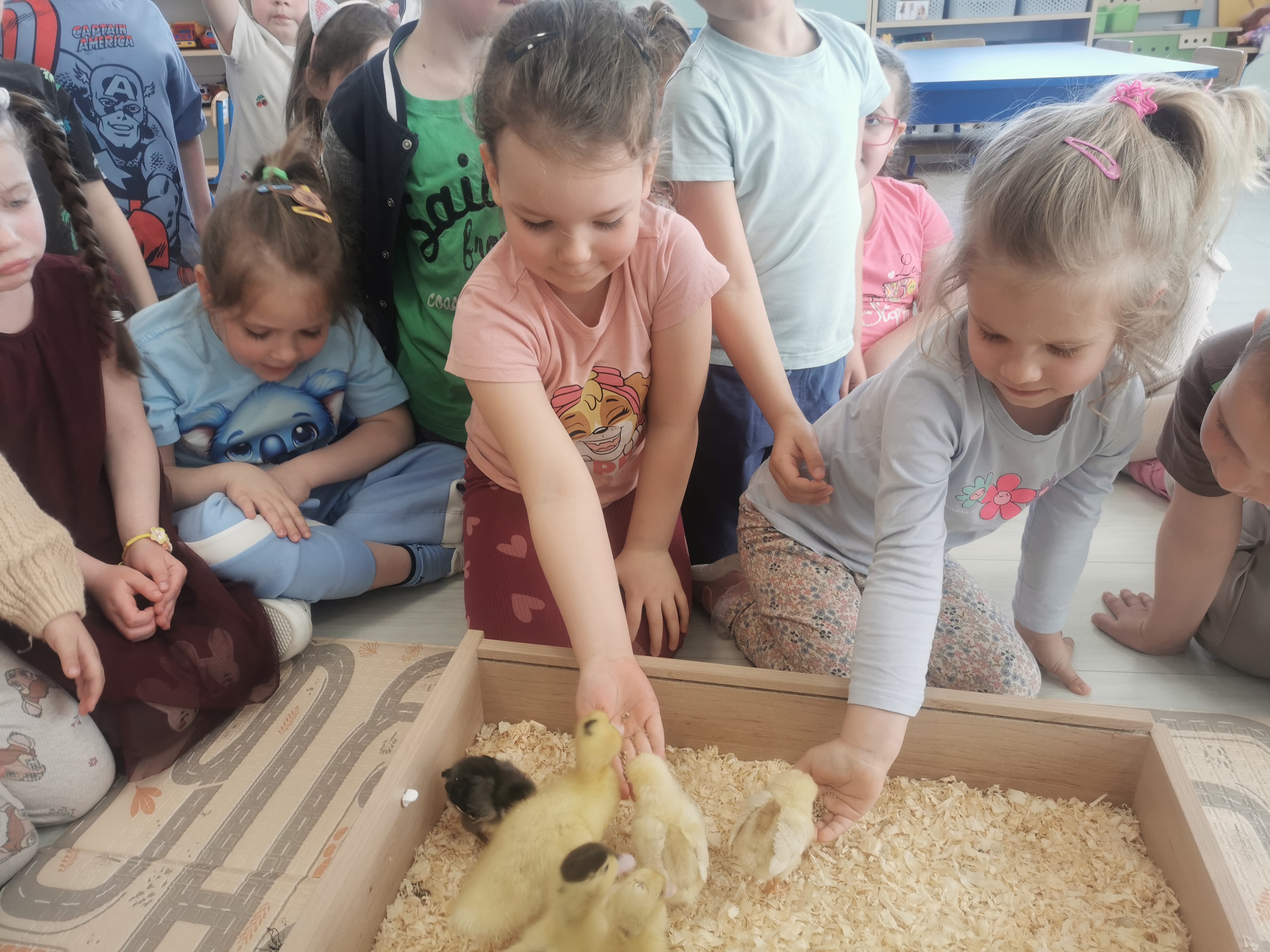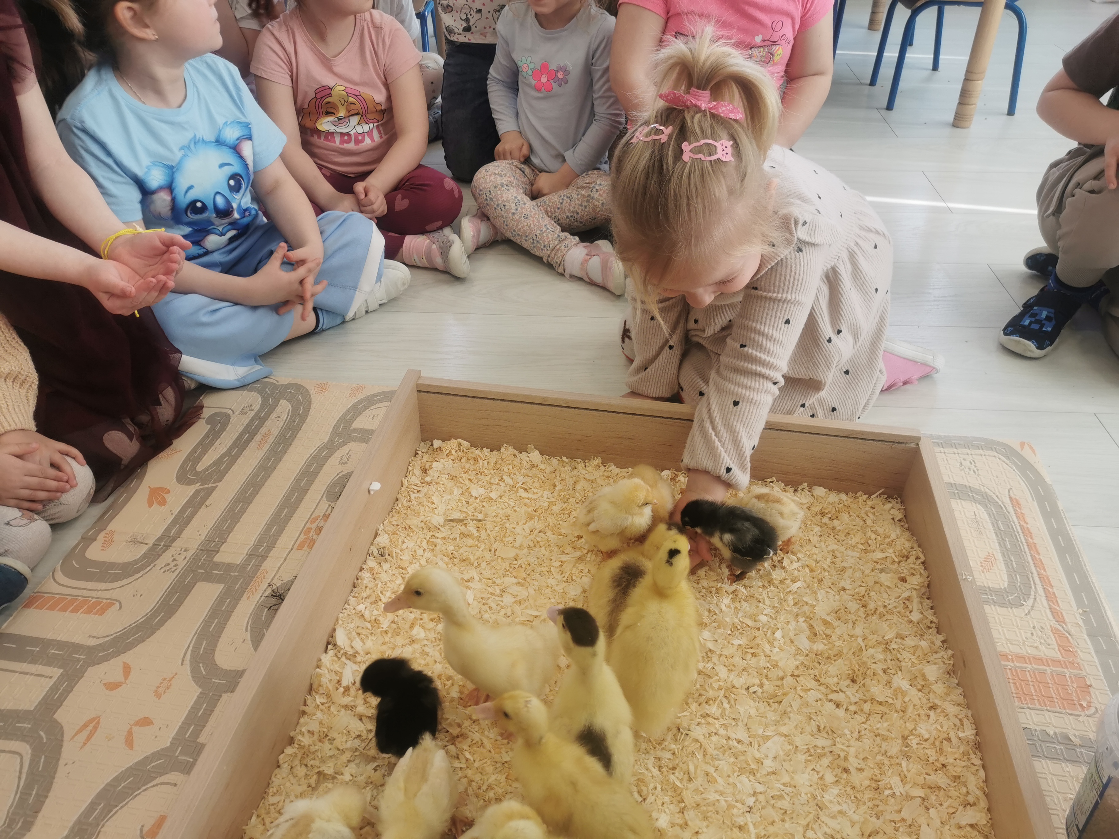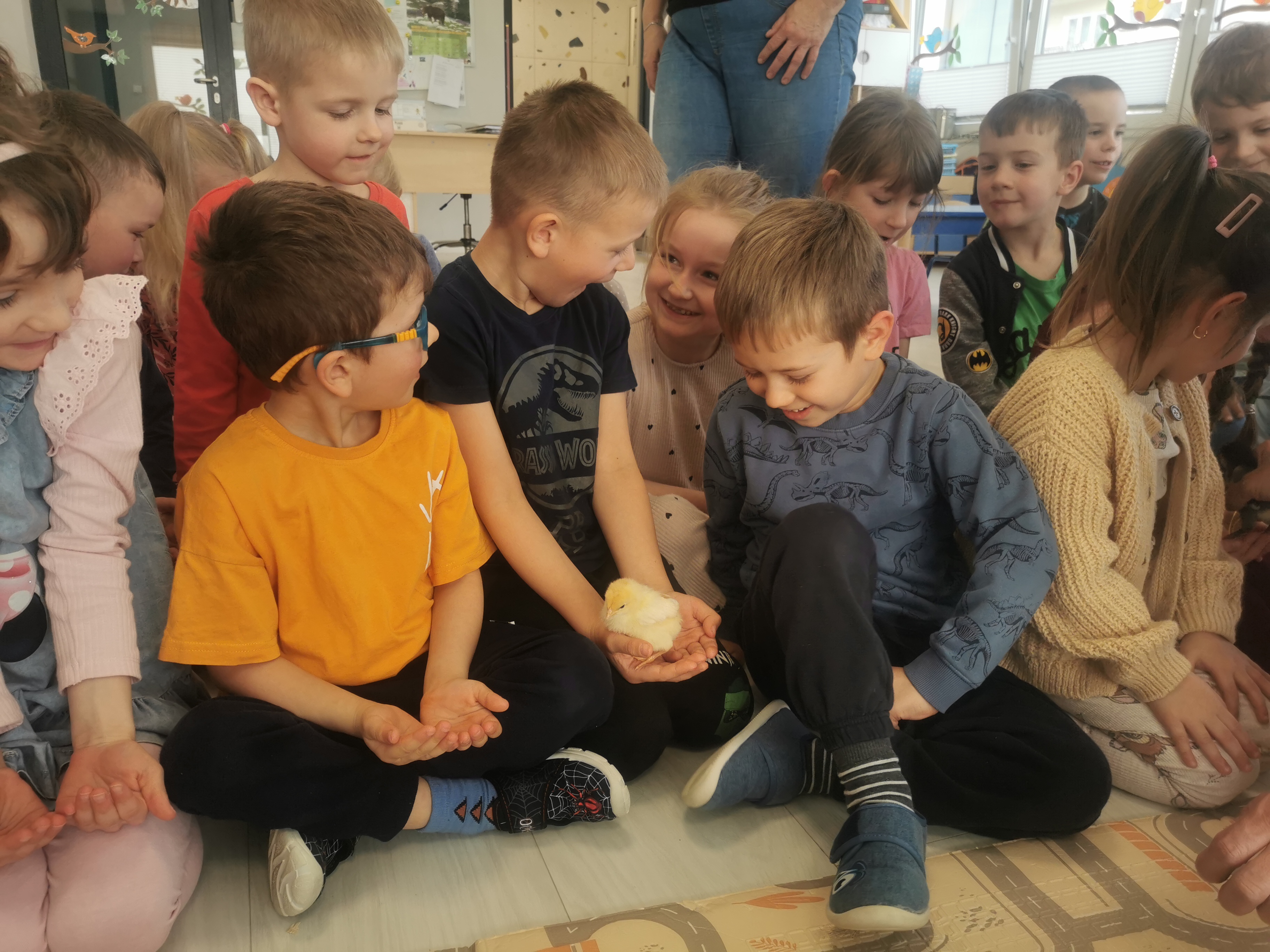 Podczas warsztatów przedszkolaki miały okazję z bliska przyjrzeć się niezwykłym gościom – żabce, królikowi, pisklętom oraz kaczkom. Dzieci z ogromnym zainteresowaniem poznawały także pierwsze oznaki wiosny, odkrywały wiosenne kwiaty oraz świat budzących się do życia owadów.