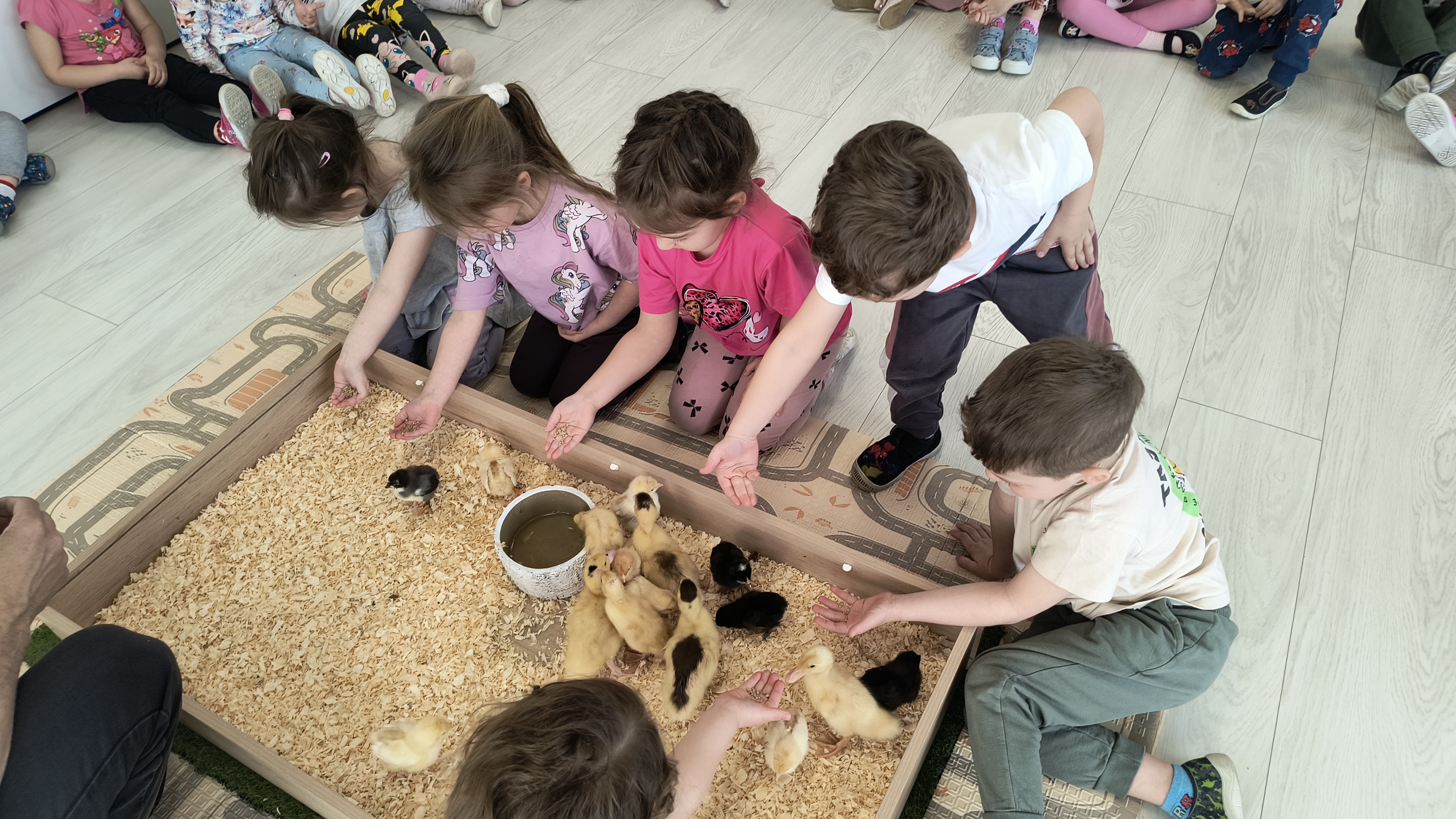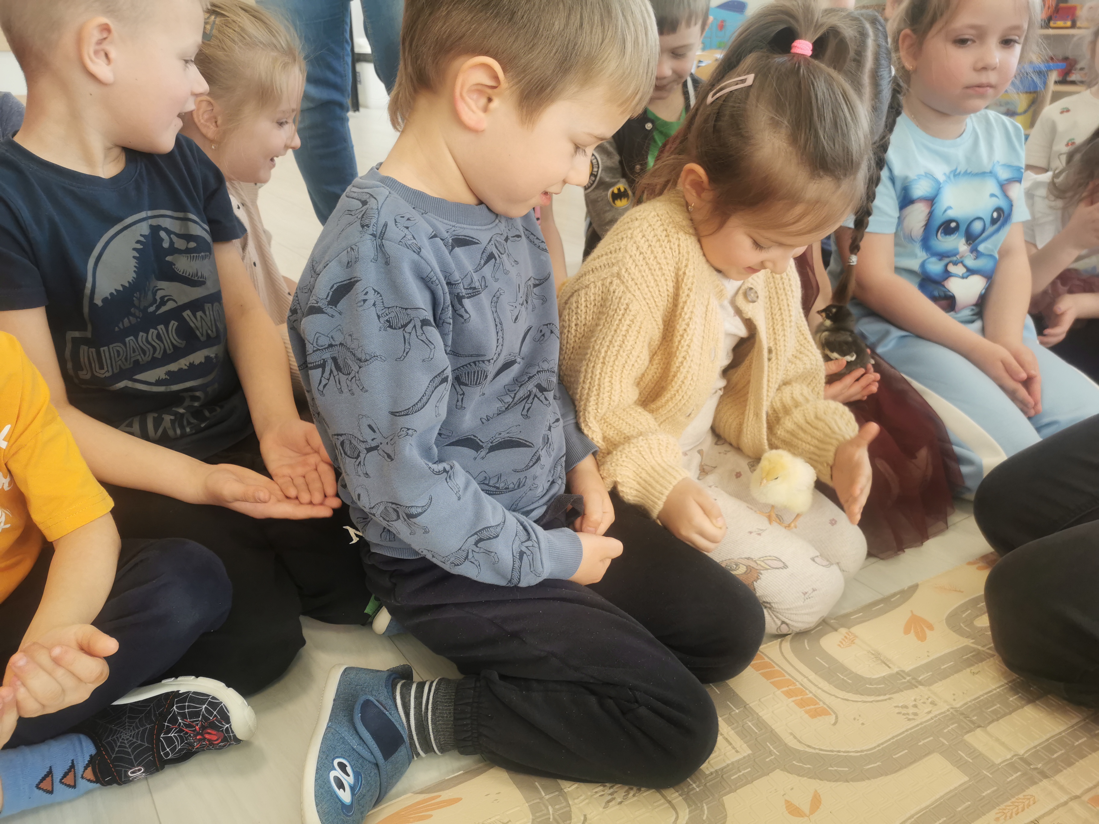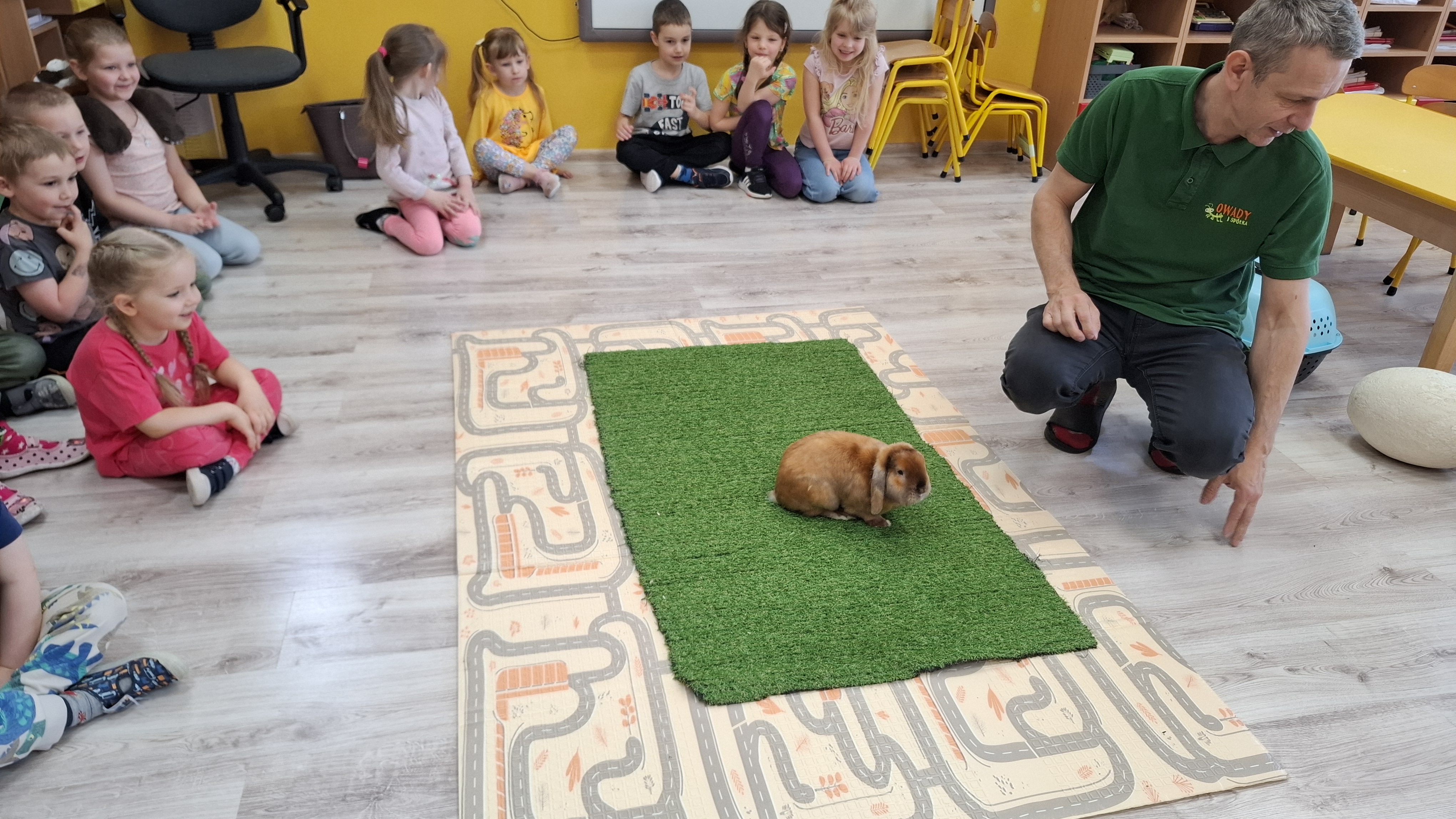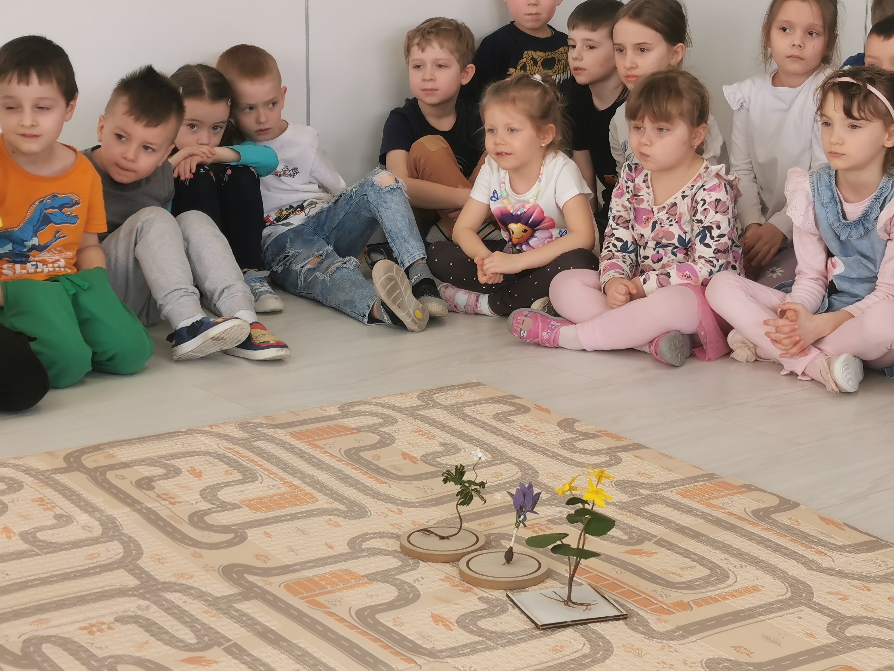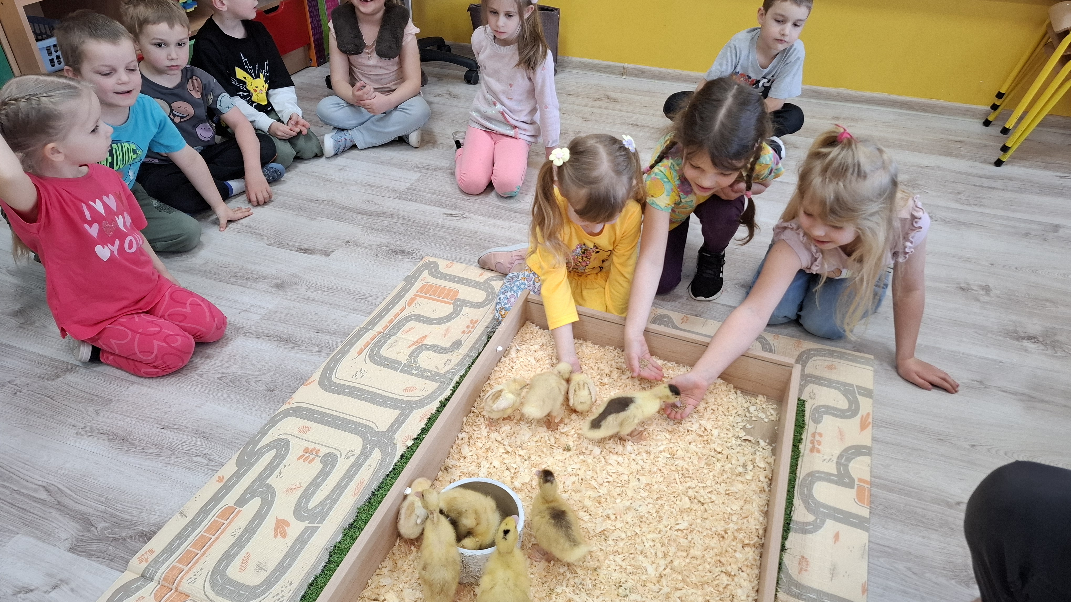 Podczas warsztatów przedszkolaki miały okazję z bliska przyjrzeć się niezwykłym gościom – żabce, królikowi, pisklętom oraz kaczkom. Dzieci z ogromnym zainteresowaniem poznawały także pierwsze oznaki wiosny, odkrywały wiosenne kwiaty oraz świat budzących się do życia owadów.