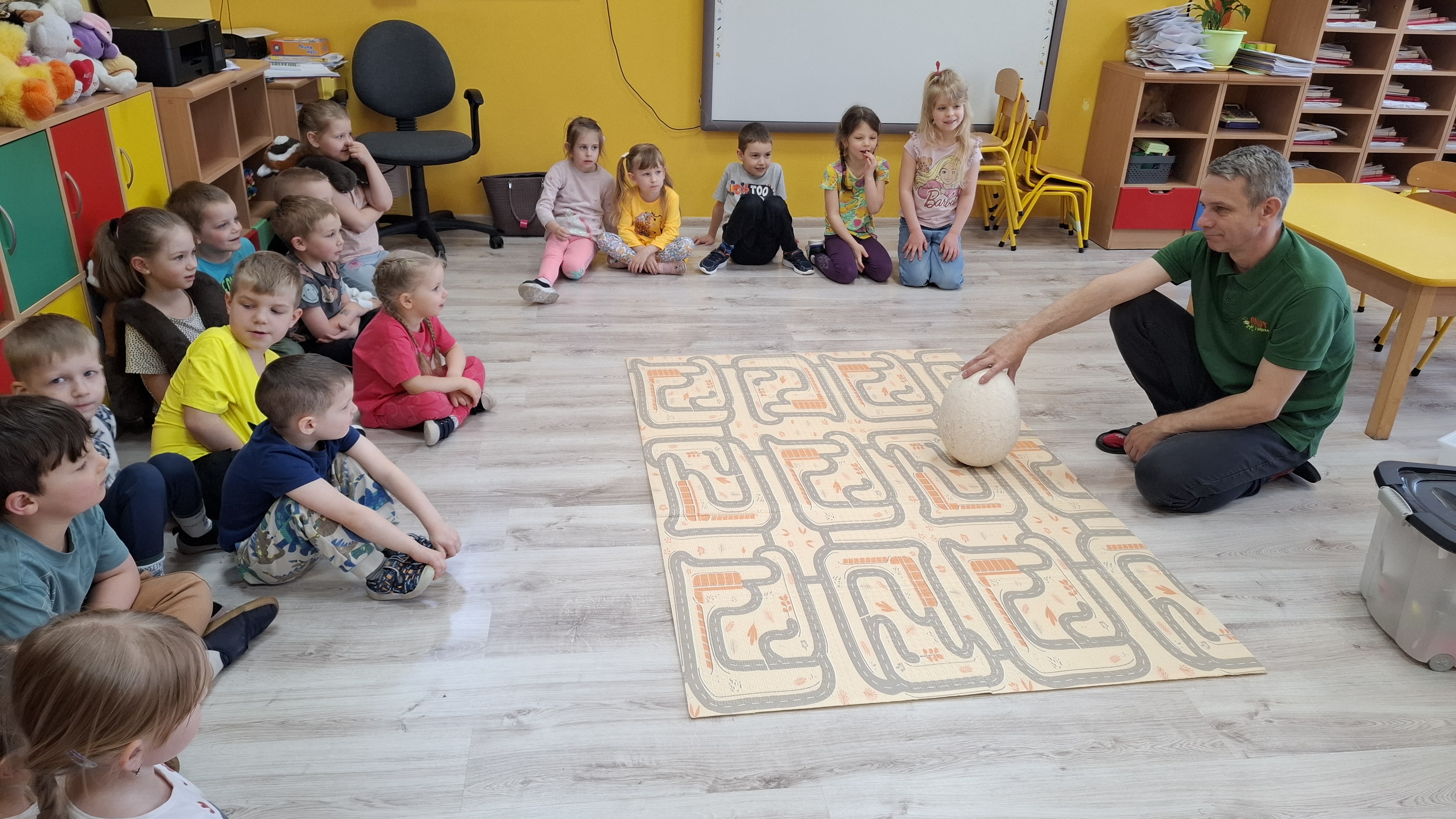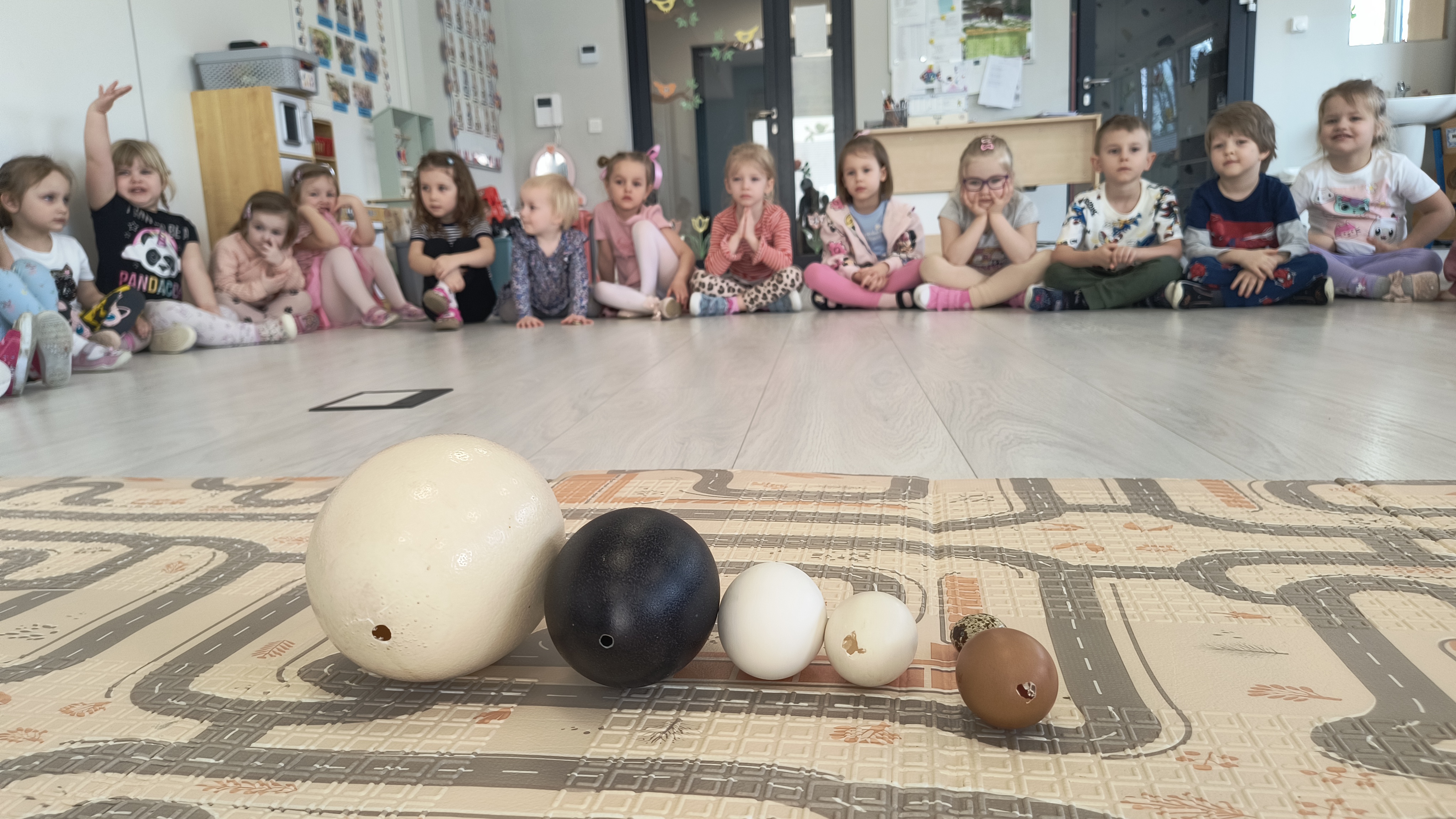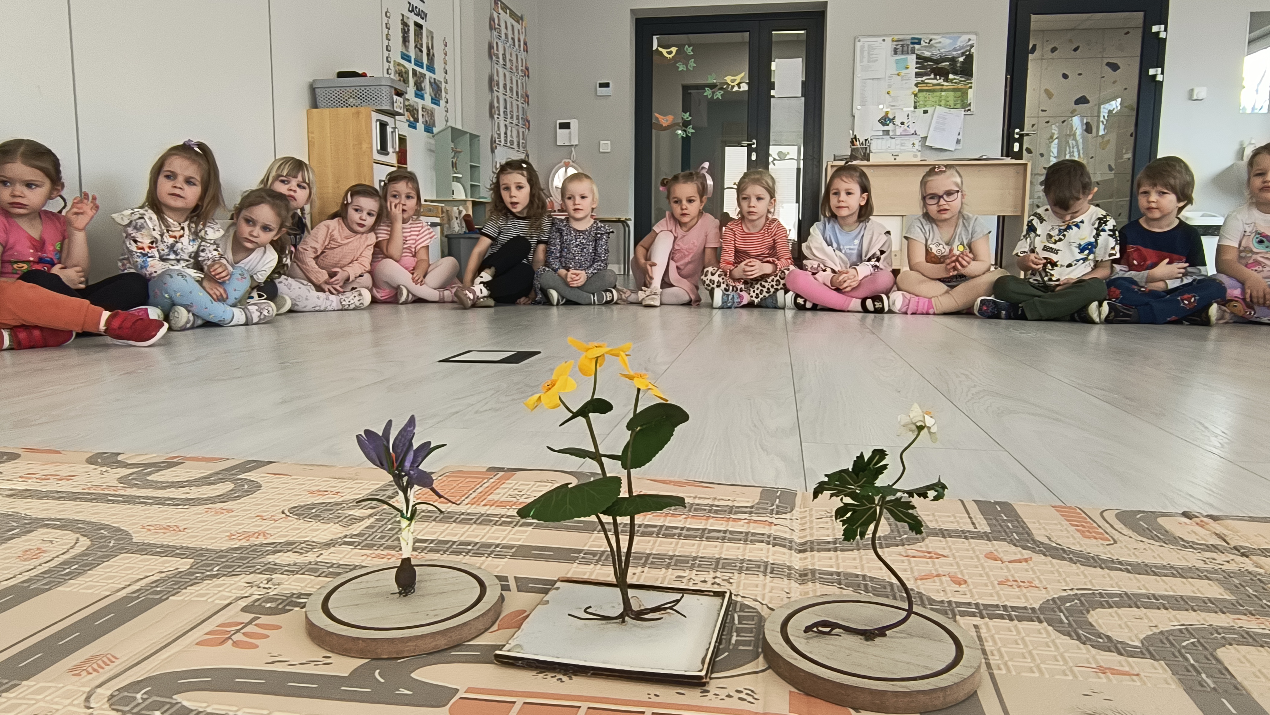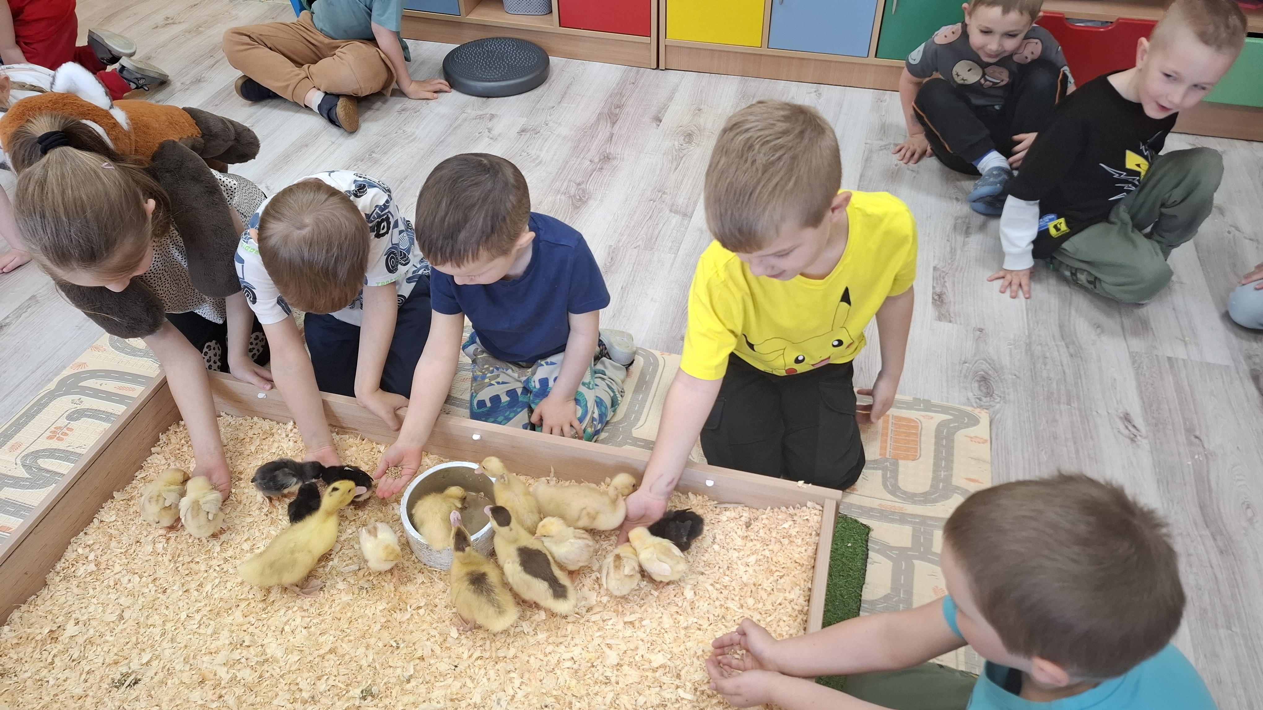 Podczas warsztatów przedszkolaki miały okazję z bliska przyjrzeć się niezwykłym gościom – żabce, królikowi, pisklętom oraz kaczkom. Dzieci z ogromnym zainteresowaniem poznawały także pierwsze oznaki wiosny, odkrywały wiosenne kwiaty oraz świat budzących się do życia owadów.