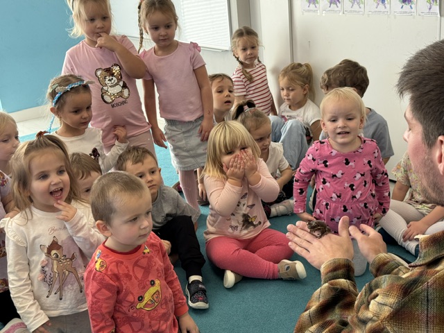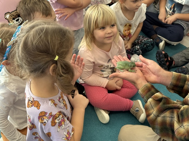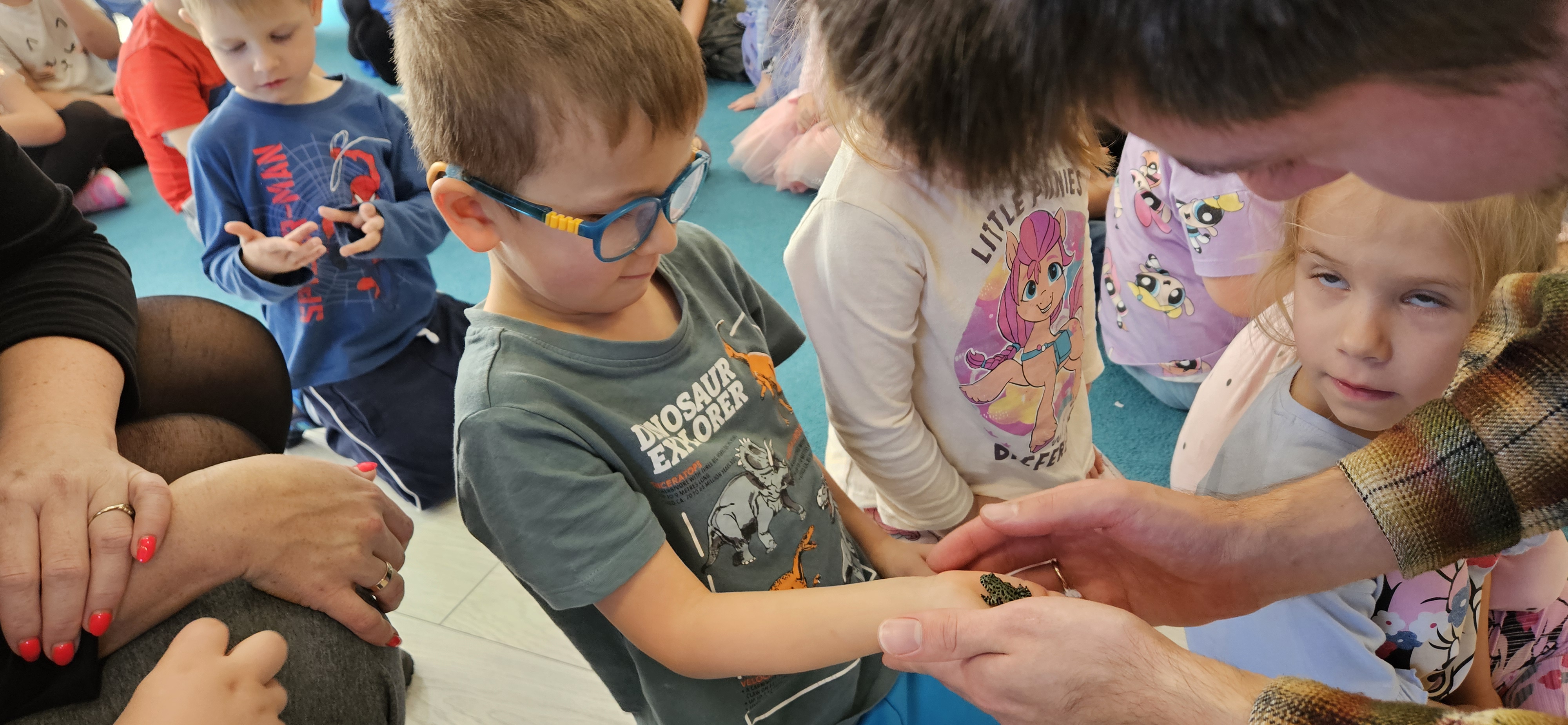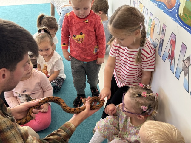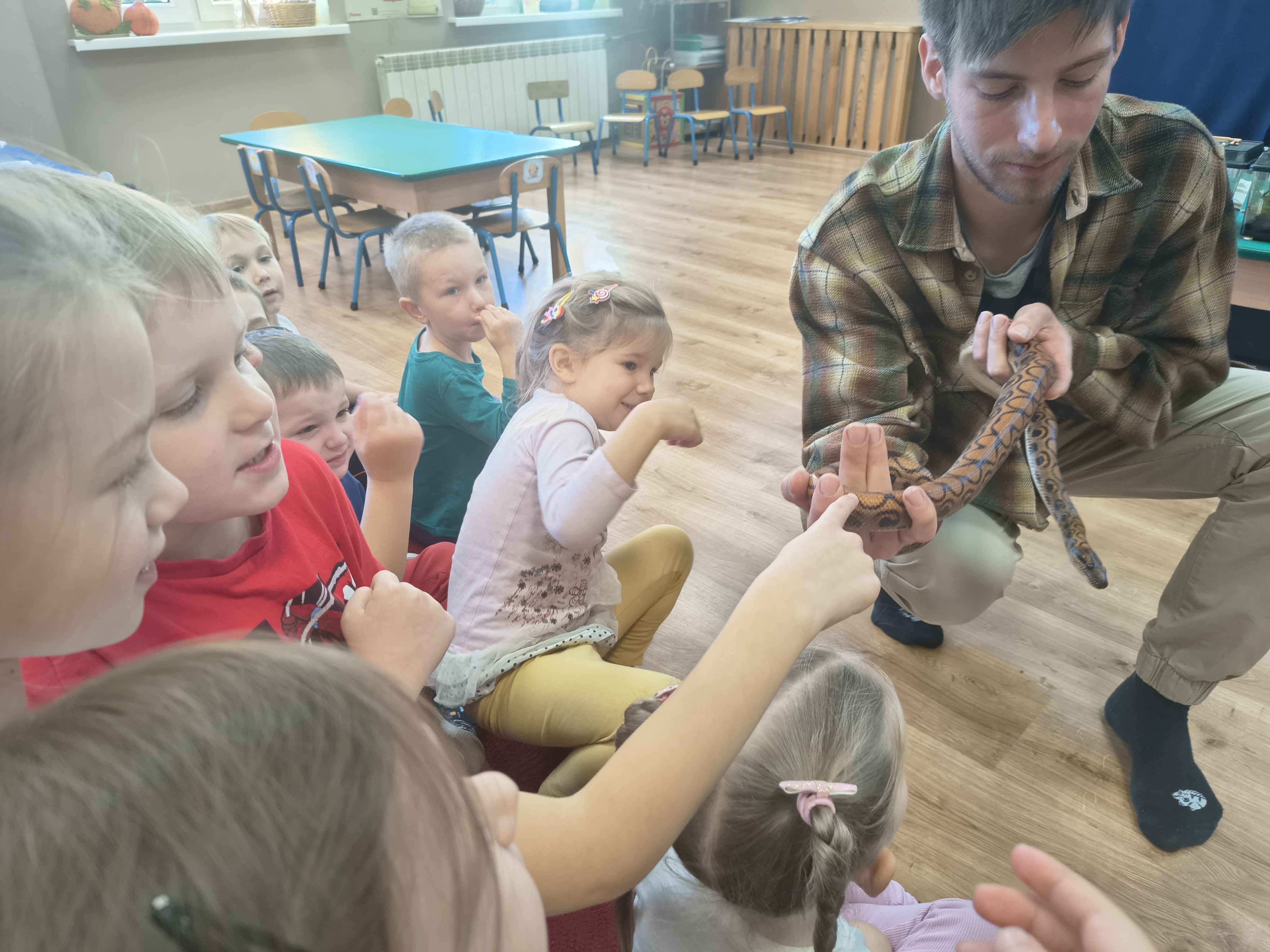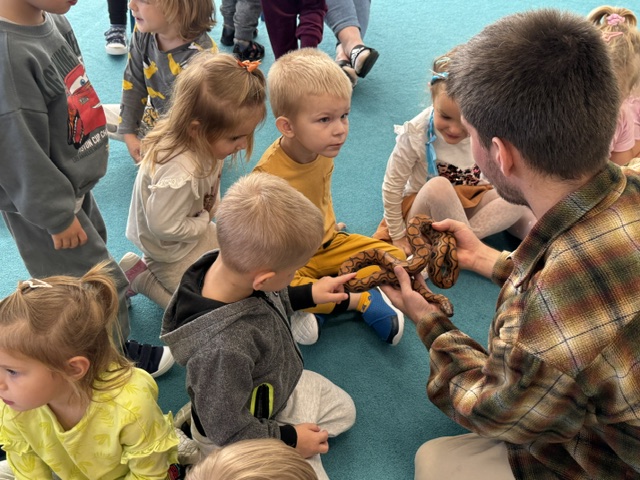 Dziś (04.11.25r.) w naszym przedszkolu odbyły się niezwykłe zajęcia przyrodnicze! Odwiedził nas pan, który przywiózł ze sobą różne gatunki gadów i płazów. Dzieci miały okazję zobaczyć z bliska m.in. żaby oraz dwa węże. Pan opowiedział, skąd pochodzą te zwierzęta, gdzie żyją i czym się odżywiają. Największą atrakcją było to, że przedszkolaki mogły nie tylko obserwować, ale także dotknąć niektórych zwierząt! Zajęcia dostarczyły wszystkim wielu emocji i ciekawych wiadomości o świecie przyrody.