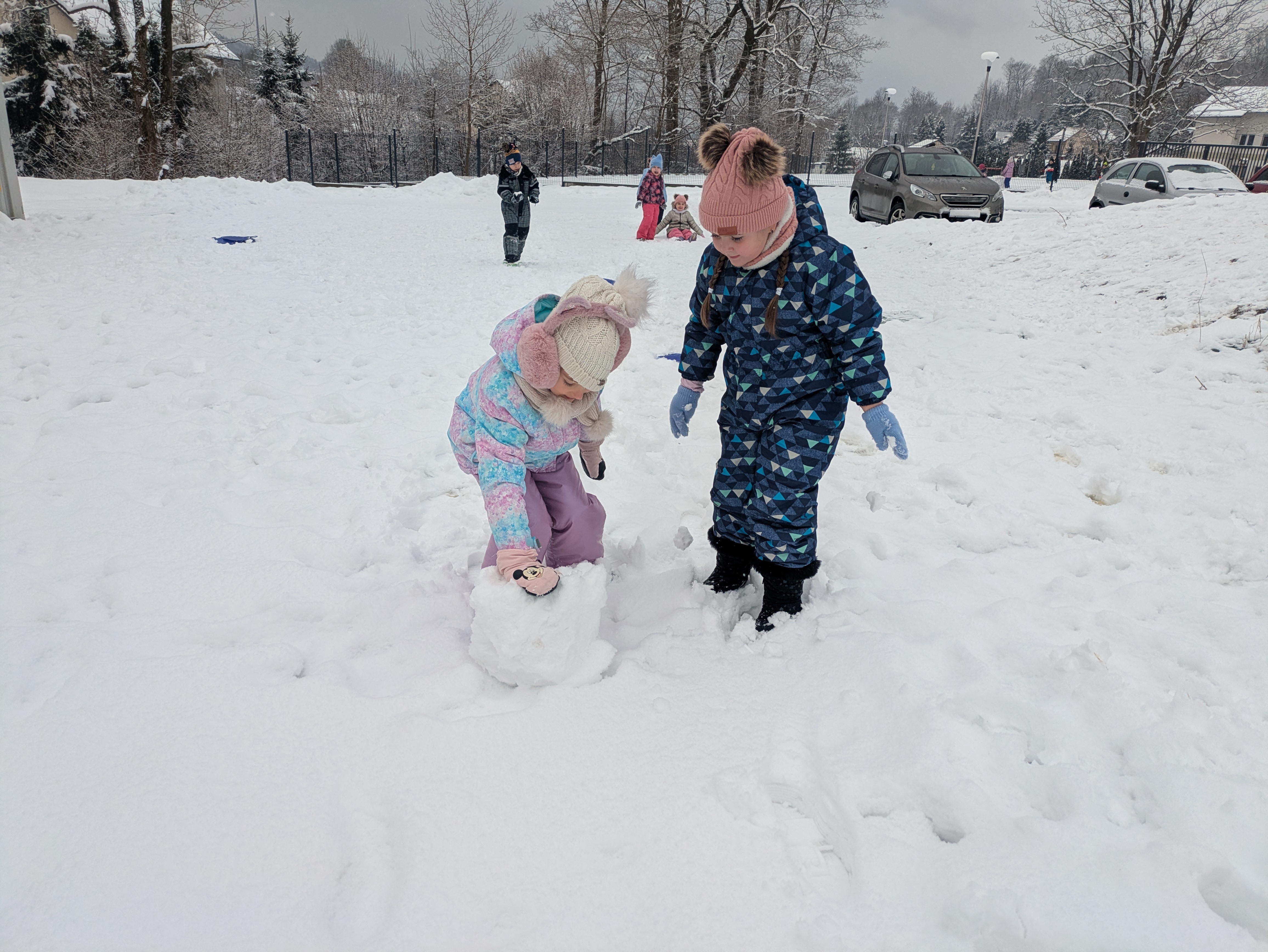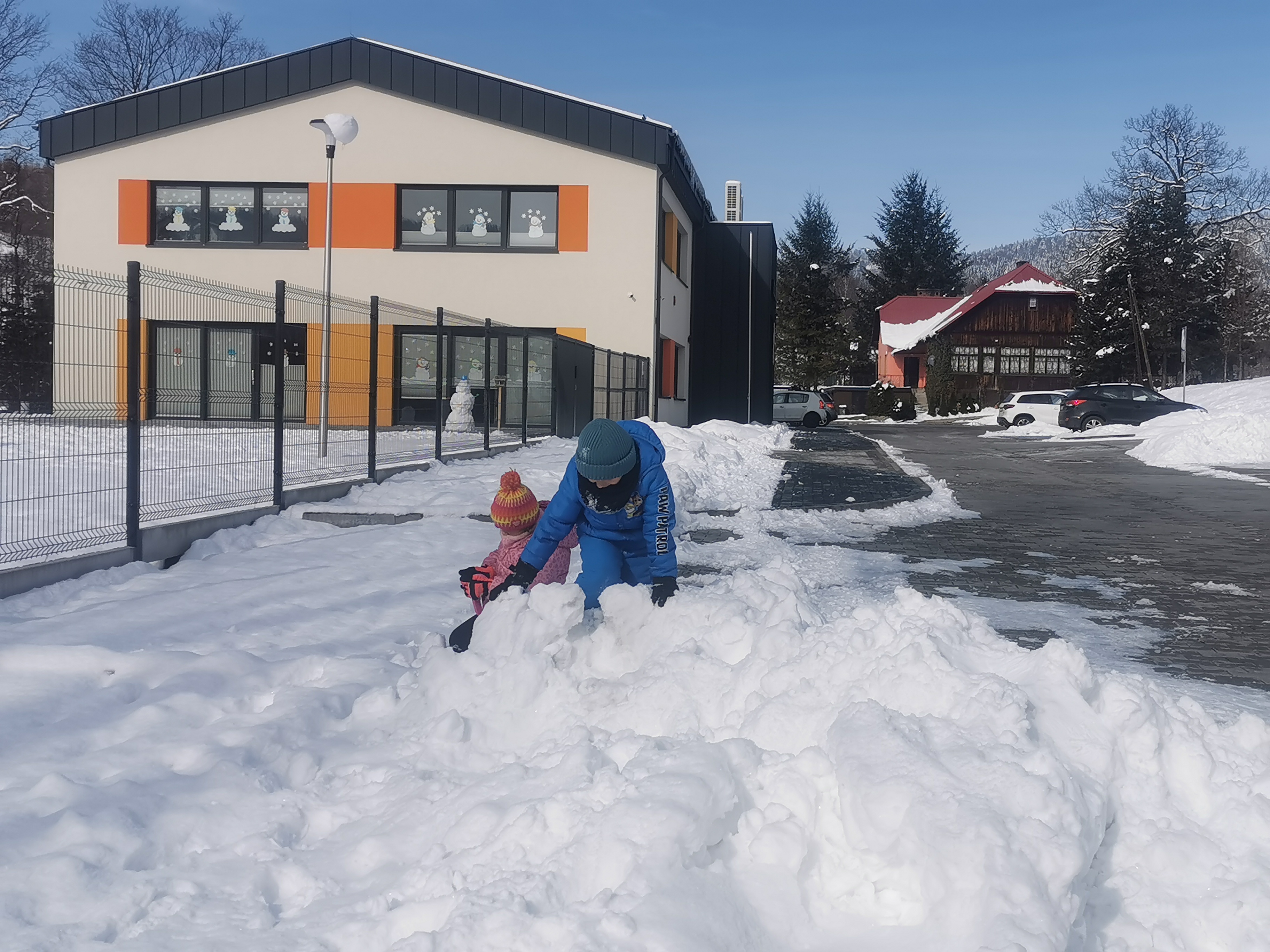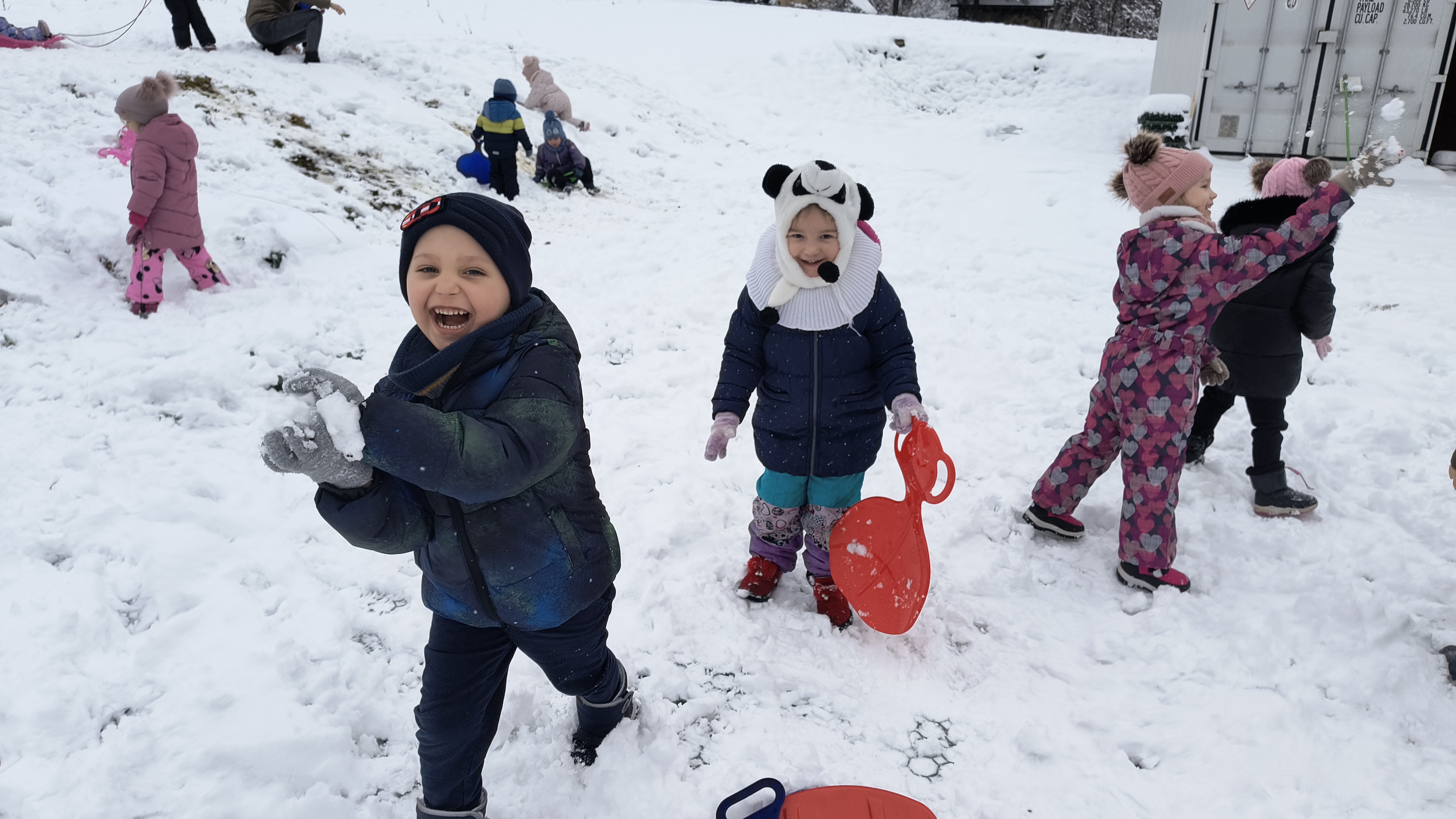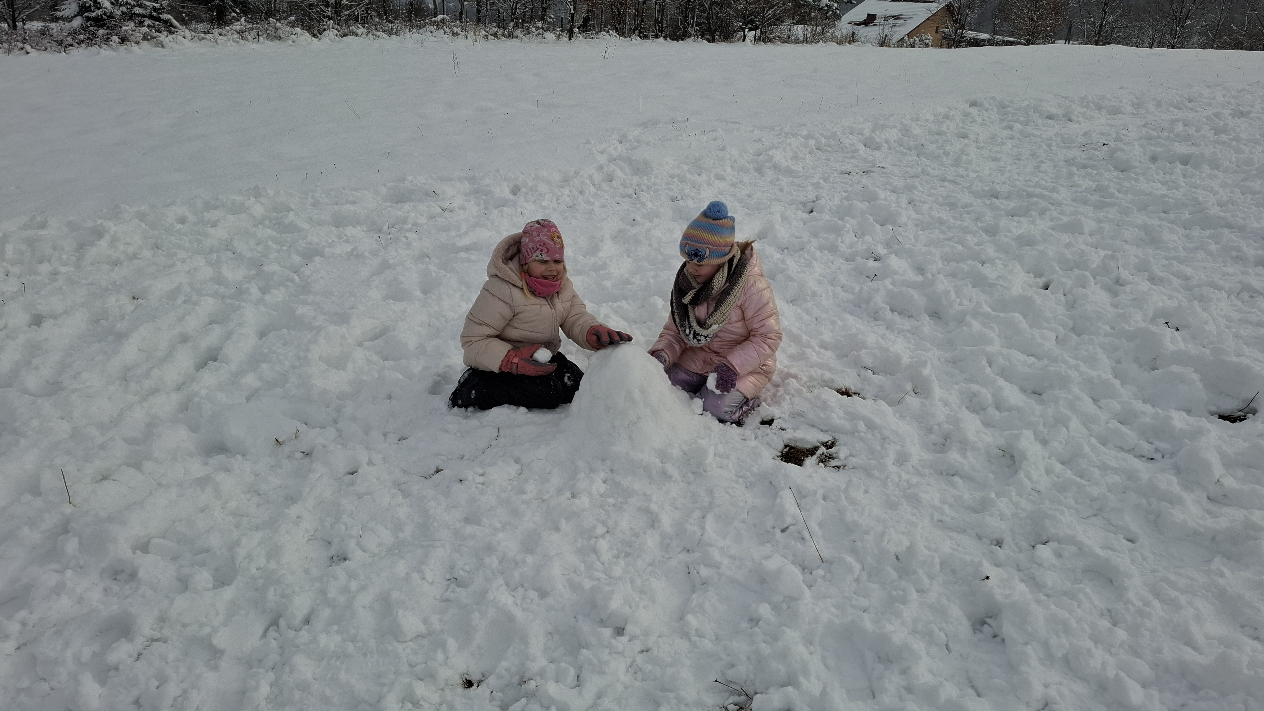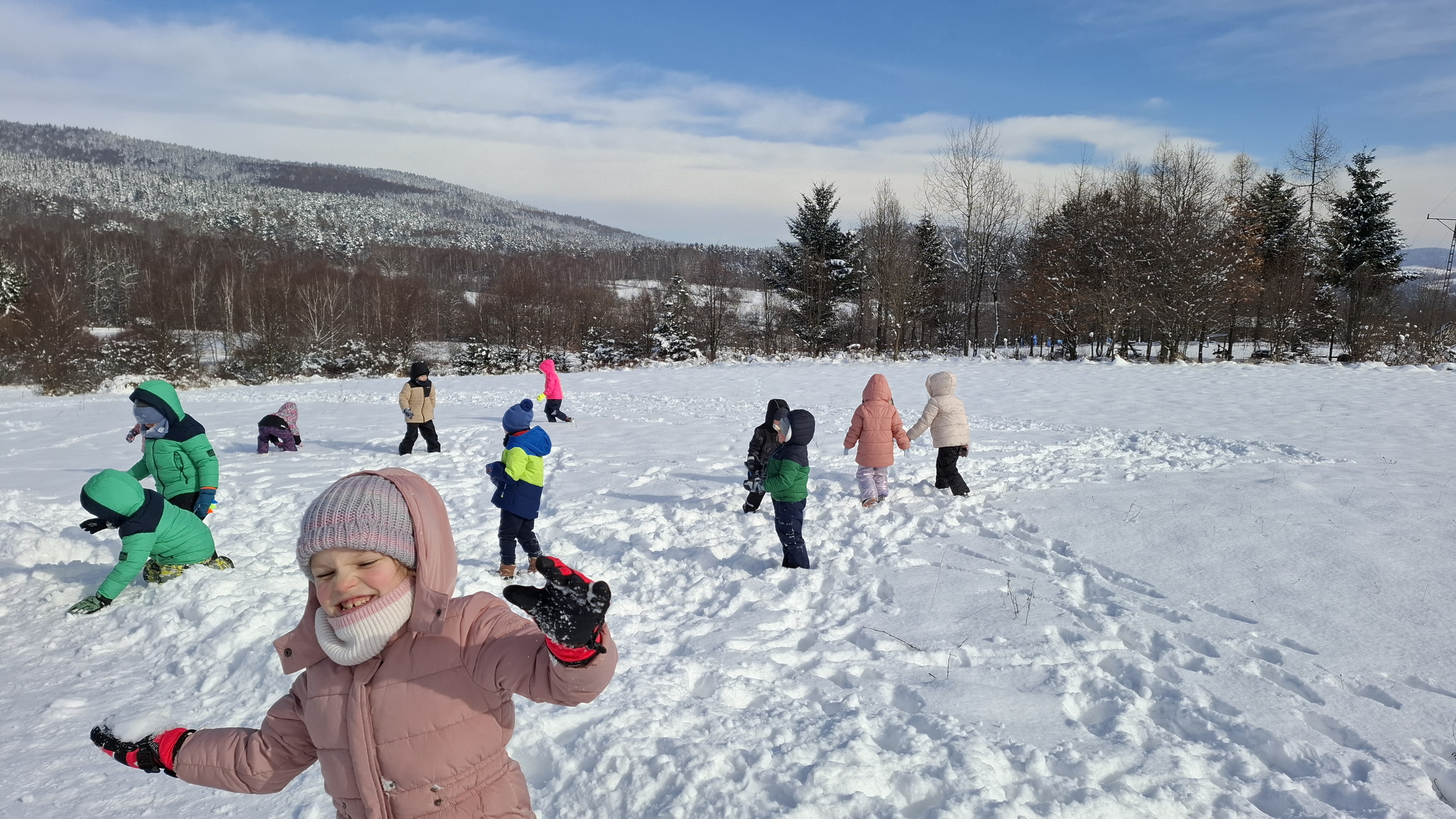 Nie zabrakło emocjonujących zjazdów na „pupolotach”, lepienia bałwanków oraz tworzenia najróżniejszych śnieżnych figur. Dzieci wykazały się ogromną kreatywnością – powstały śnieżne zwierzątka, mini fortece, a nawet fantazyjne rzeźby. Jednak największą frajdę – jak zawsze – sprawiała bitwa na śnieżki, która wywoływała mnóstwo radości i serdecznego śmiechu.