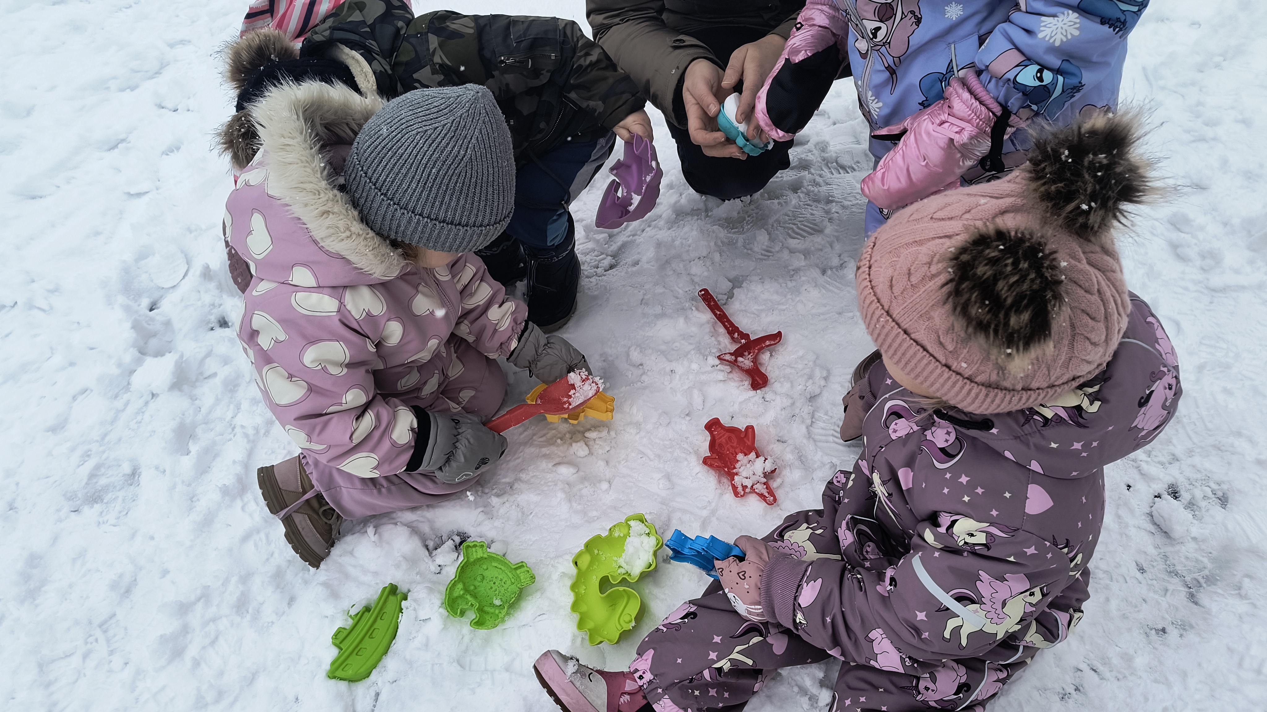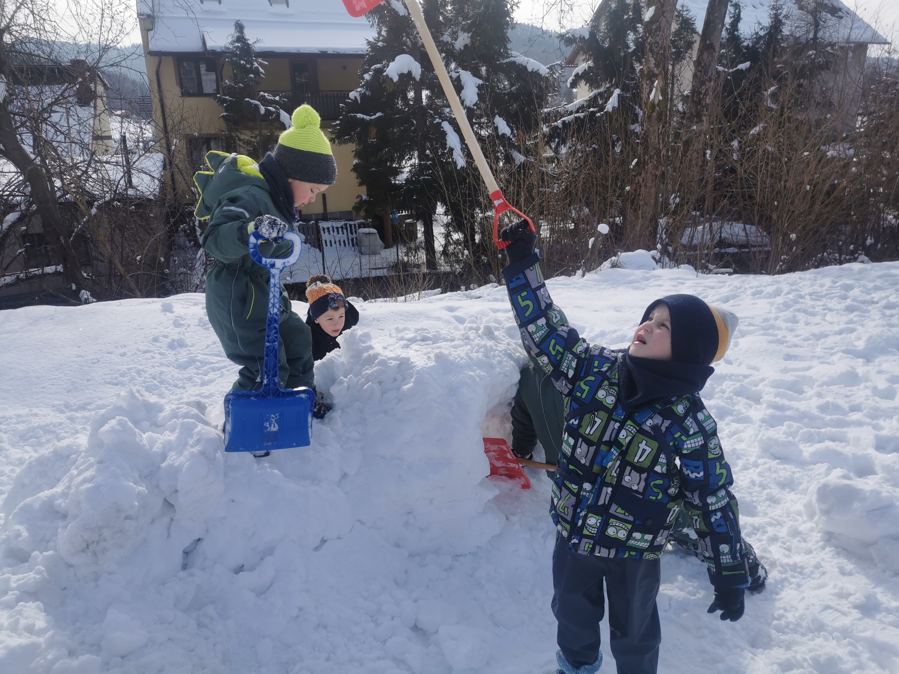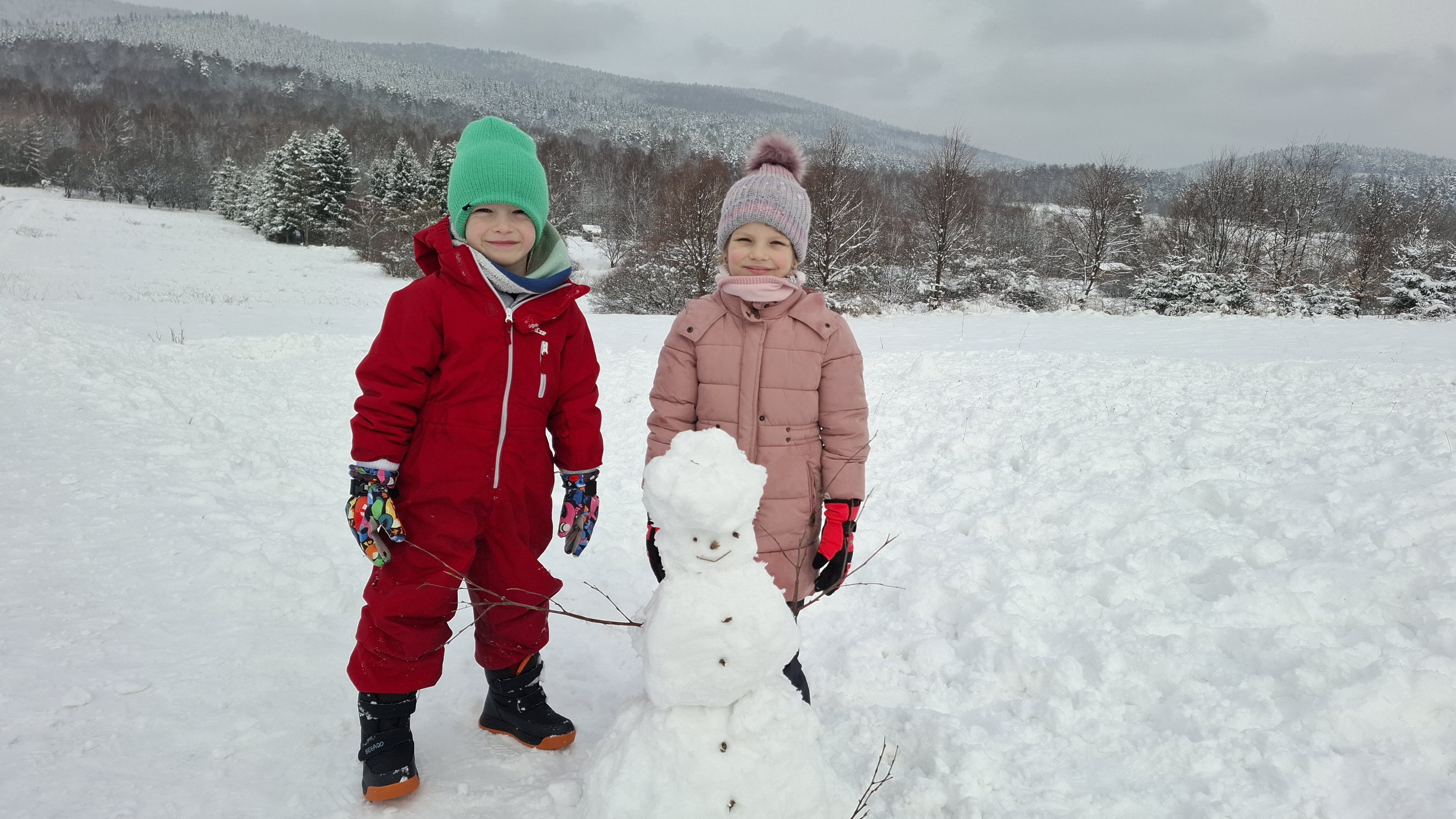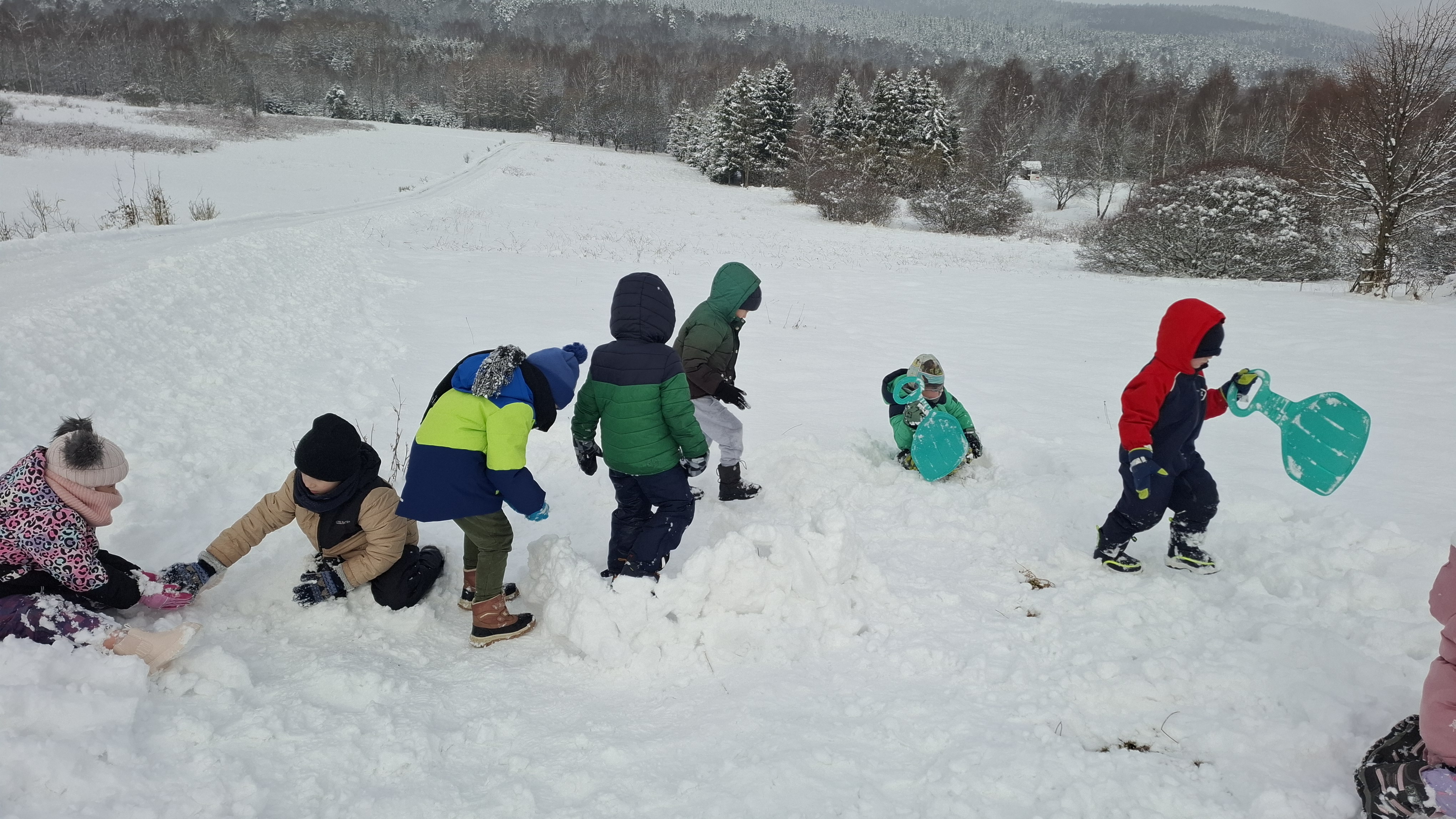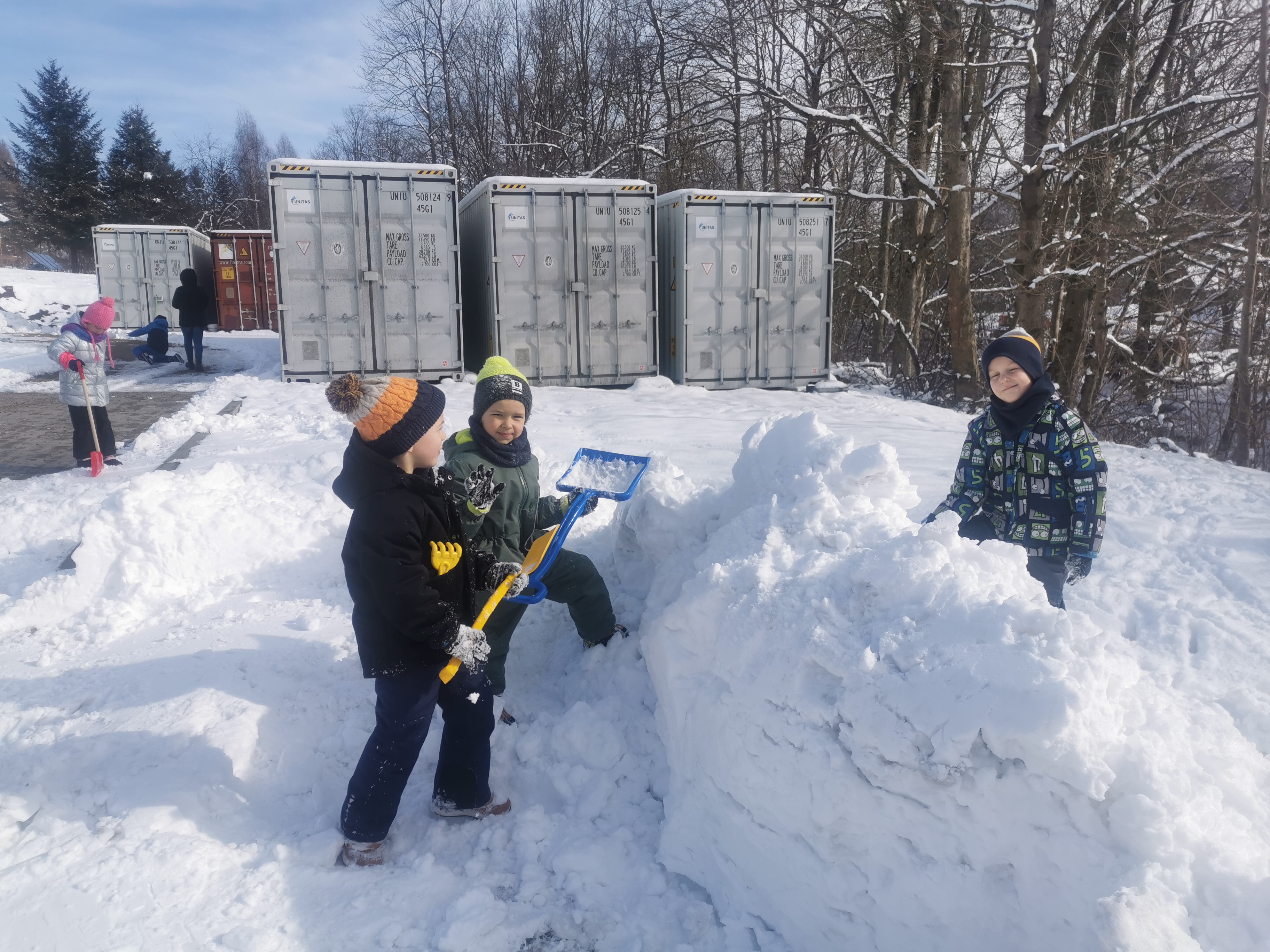 Nie zabrakło emocjonujących zjazdów na „pupolotach”, lepienia bałwanków oraz tworzenia najróżniejszych śnieżnych figur. Dzieci wykazały się ogromną kreatywnością – powstały śnieżne zwierzątka, mini fortece, a nawet fantazyjne rzeźby. Jednak największą frajdę – jak zawsze – sprawiała bitwa na śnieżki, która wywoływała mnóstwo radości i serdecznego śmiechu.