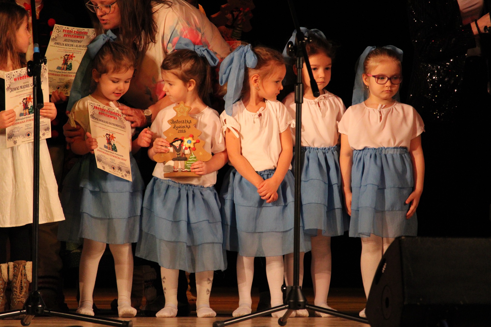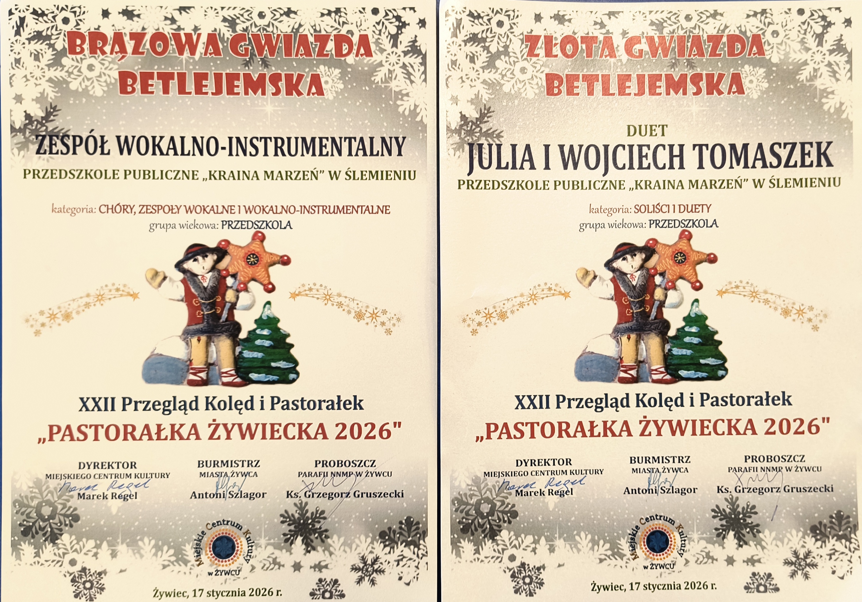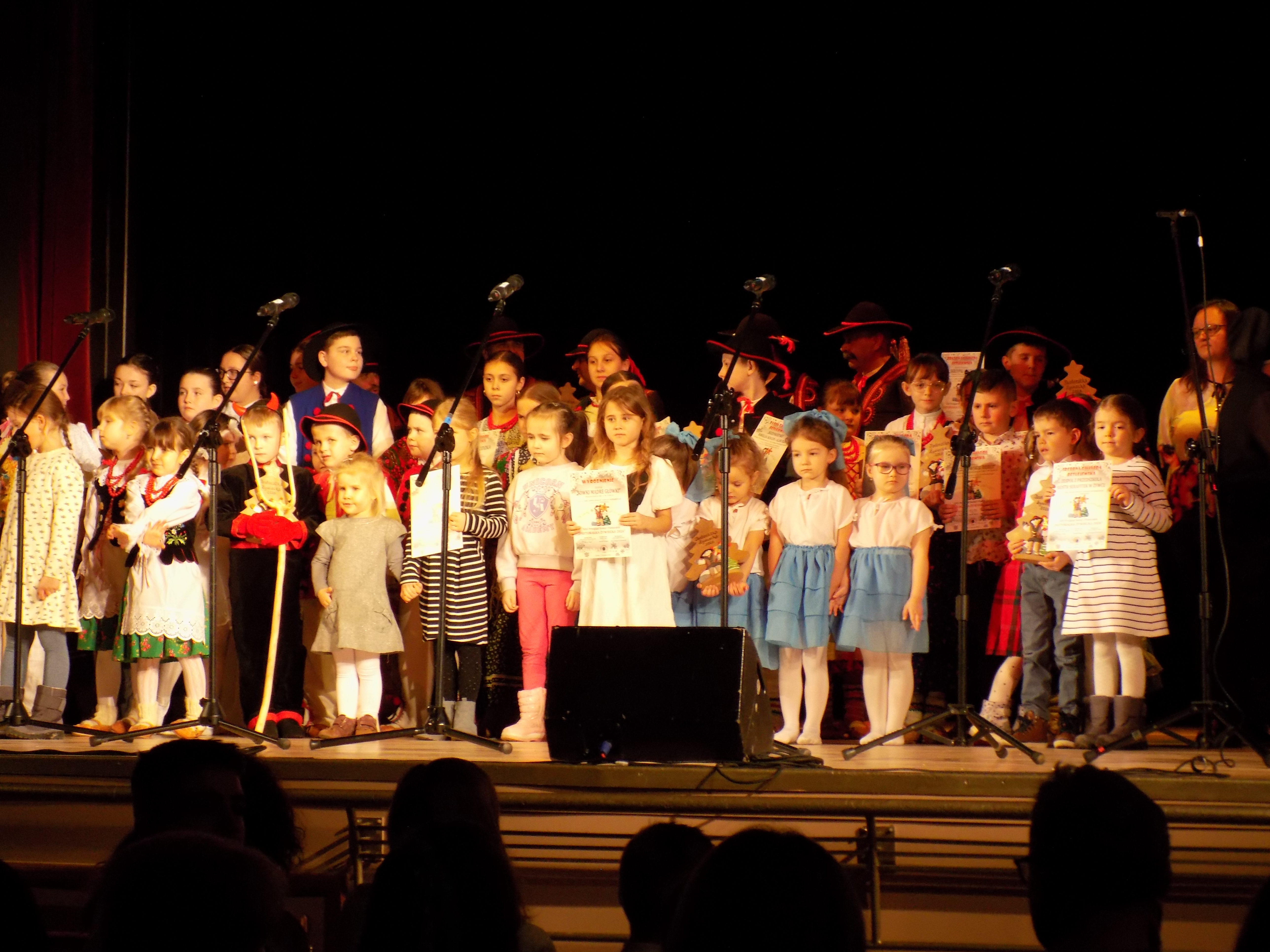 Nasze przedszkole reprezentował duet Wojtuś i Julia Tomaszek, którzy oczarowali jury oraz publiczność wykonaniem pastorałek „Jezusa Narodzonego” oraz „W lesie, w lesie”. Ich występ został nagrodzony I miejscem – Złotą Gwiazdą Betlejemską w kategorii soliści i duety – przedszkola. Na szczególne uznanie zasługuje Wojtuś, który po mistrzowsku akompaniował na heligonce, nadając występowi wyjątkowy, regionalny charakter.